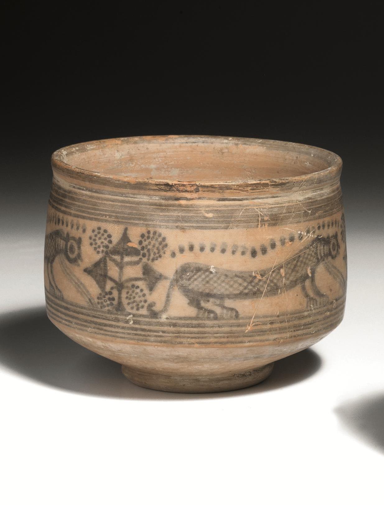Decorazione: sul ventre, fra due gruppi di linee parallele, tre grandi figure di pantere al guinzaglio stilizzate e dal corpo allungato gradienti a sinistra e grandi occhi, intervallate da alberelli, nella parte inferiore del vaso
