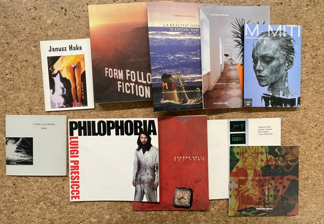Scatola contenente 32 catalghi di artisti contemporanei tra cui: Italian New Bro, Pietro Fortuna, Mecarelli, Stefano Abbiati, Alessandra Tesi, Rossella Fumasoni, Januz Haka, Udo Dziersk