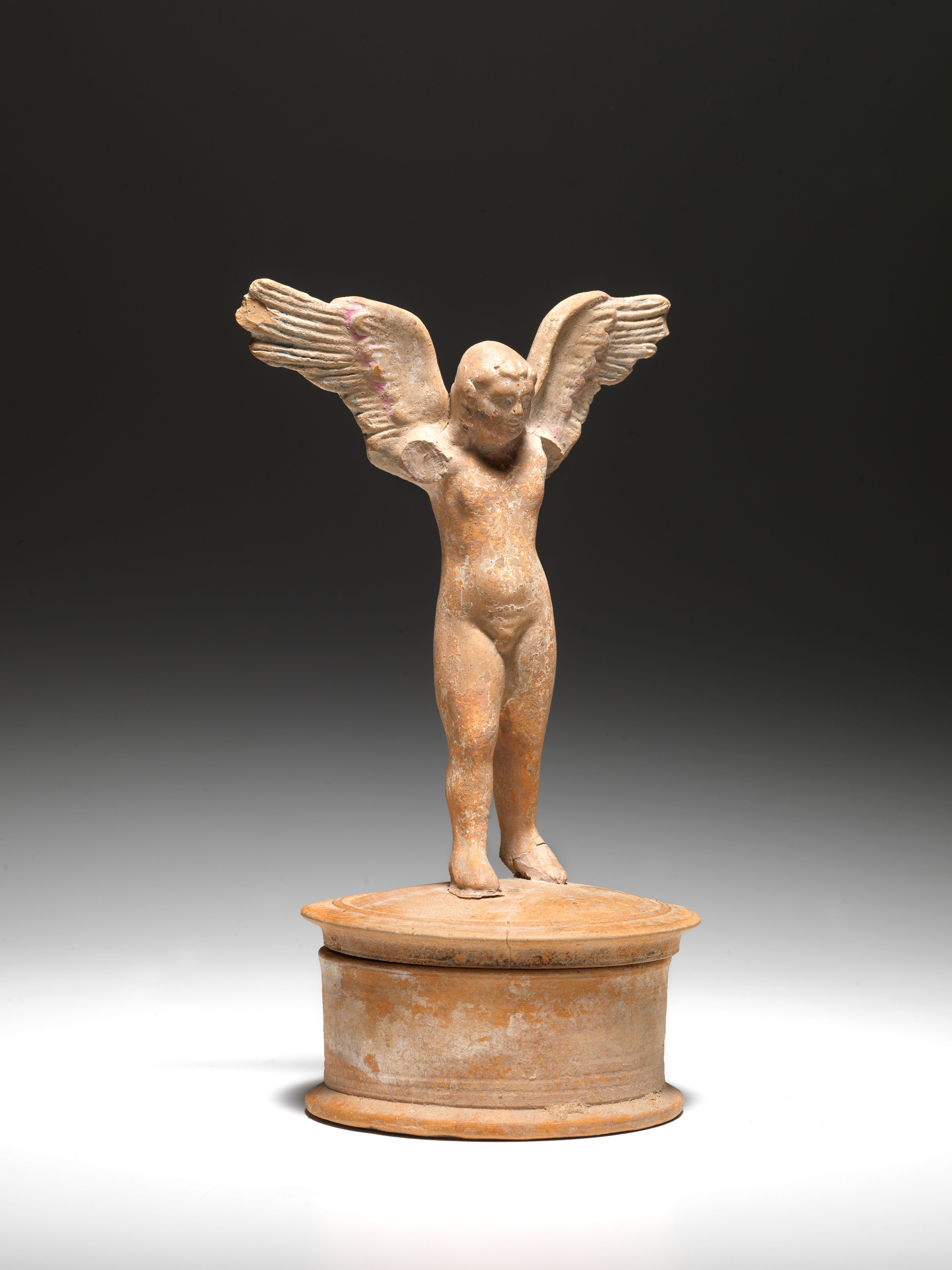 Pisside di forma circolare su piede troncoconico, con coperchio sormontato da figura di Erote stante con le ali aperte rivolte verso l’alto e con le gambe leggermente avanzate
