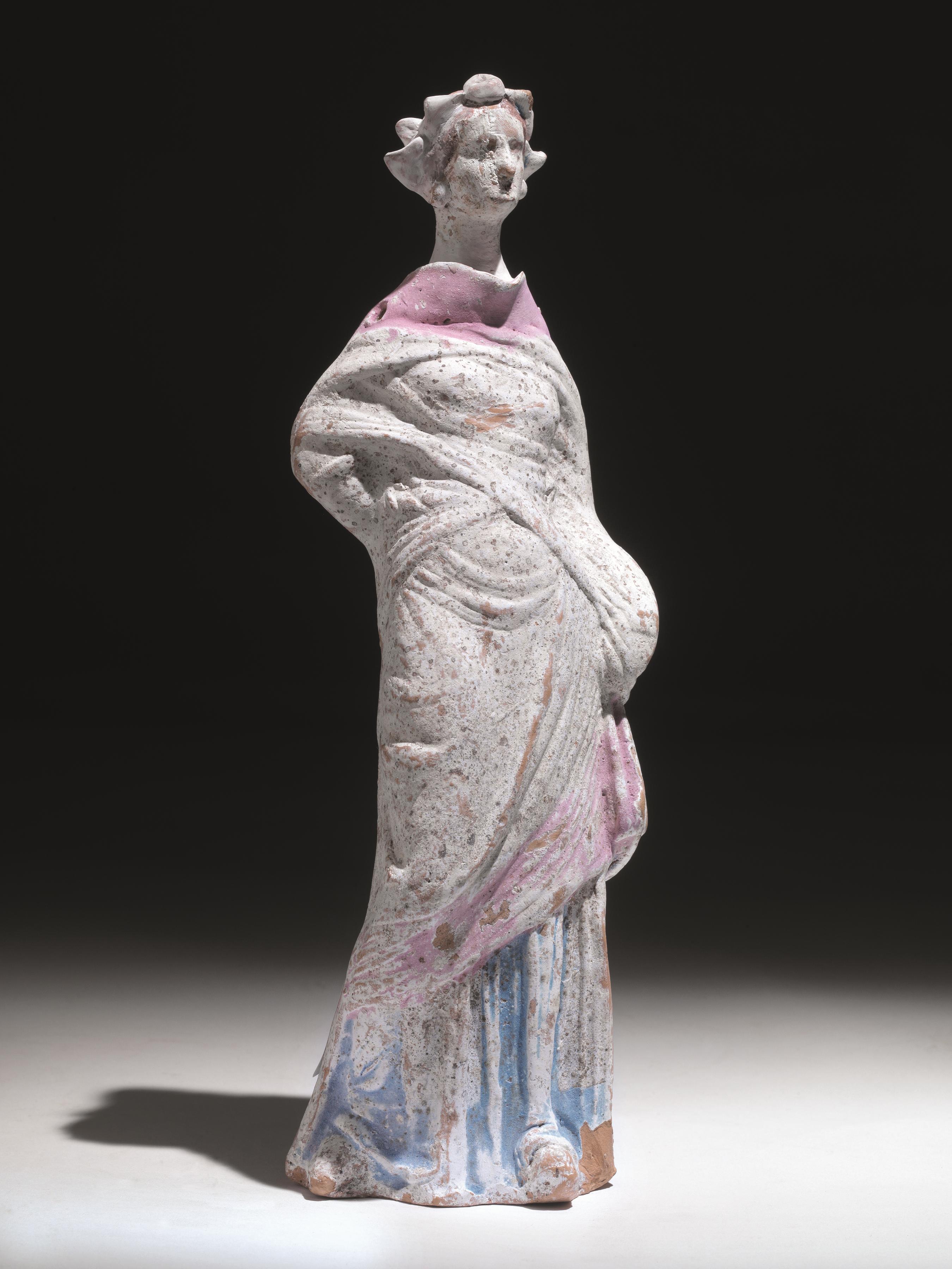 Statuetta di giovane donna, con la testa leggermente rivolta verso il basso, stante sulla gamba destra, la sinistra flessa e leggermente arretrata ed avvolta in un ampio mantello drappeggiato sul busto, il braccio sinistro è appoggiato sul fianco, mentre il destro è ripiegato dietro la schiena. Dal mantello decorato da un ampio bordo rosa fuoriesce in basso il chitone azzurro plissettato che si allarga sui piedi. Il volto è reso in maniera sommaria e la fanciulla indossa una corona fogliacea