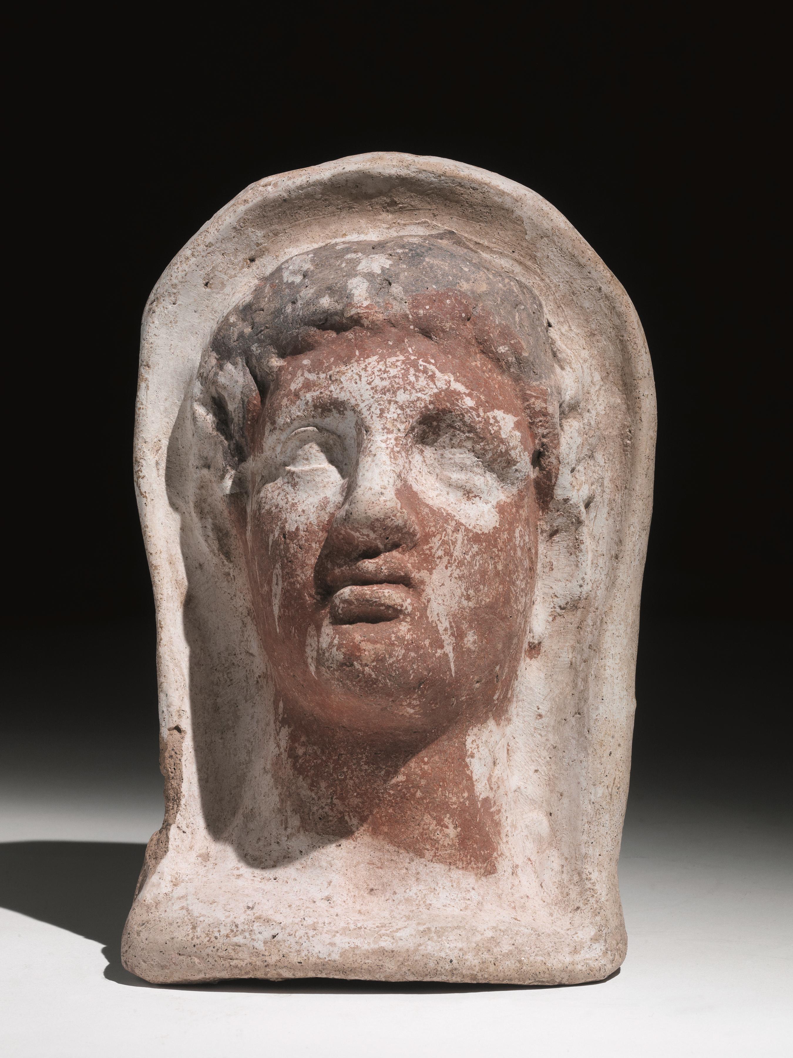 Ex voto costituito da una testa maschile giovanile velata con capelli pettinati a piccole ciocche, occhi con palpebre delineate, naso rettilineo, bocca con labbra carnose leggermente socchiuse, mento arrotondato, orecchie sommariamente accennate; parte posteriore non lavorata