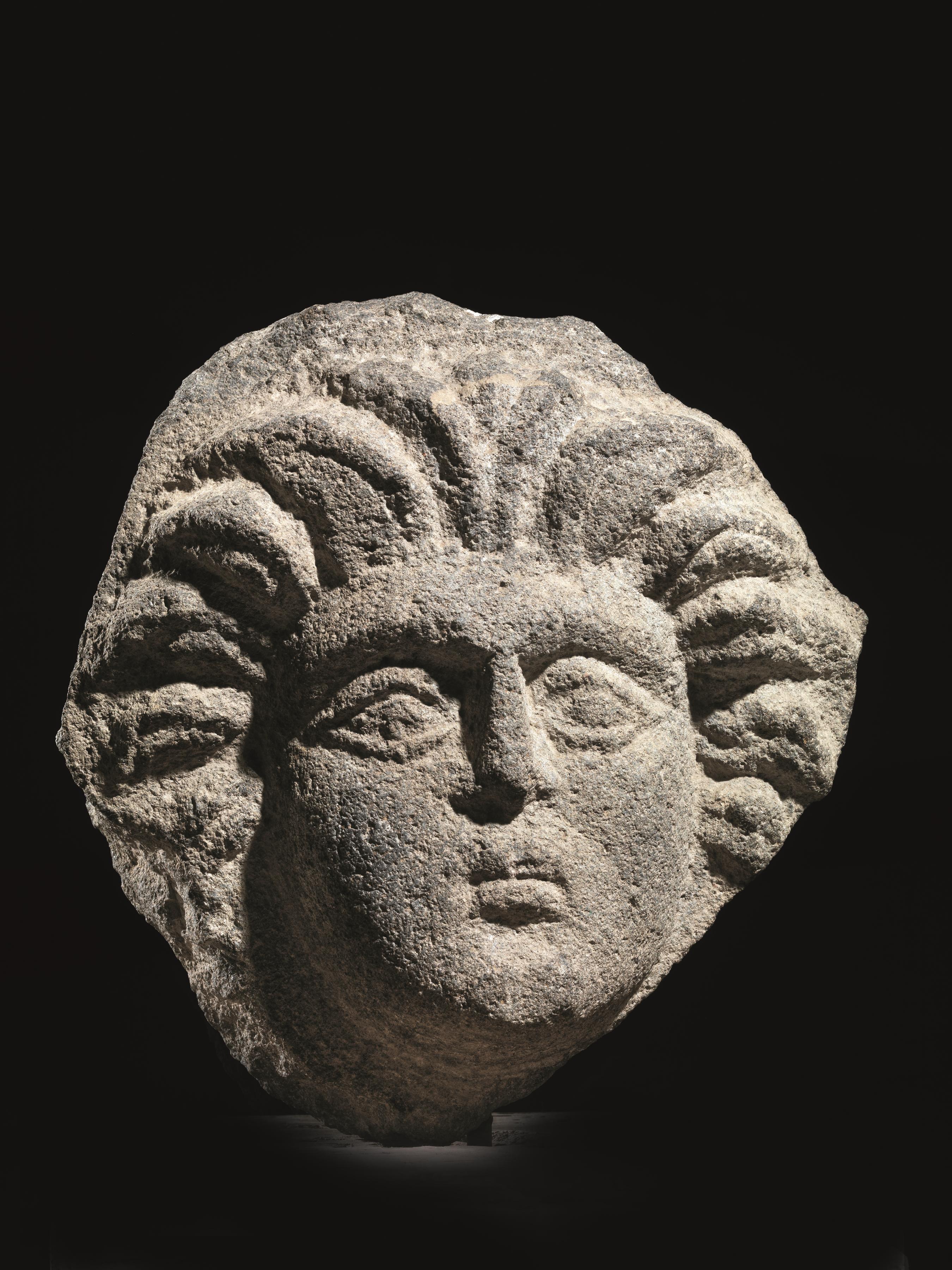 Testa nabatea Materia e tecnica: basalto grigio scolpitoTesta femminile in...