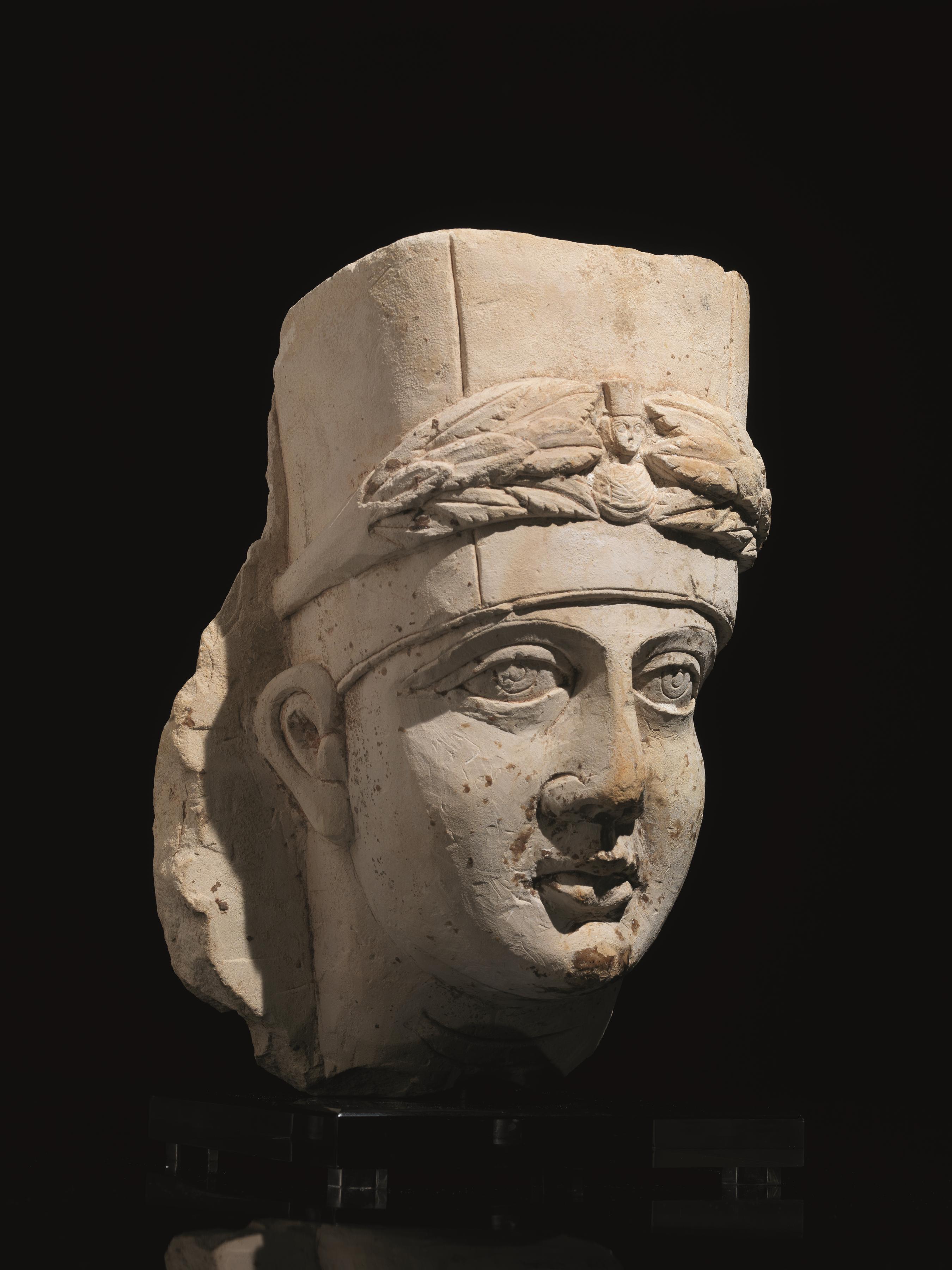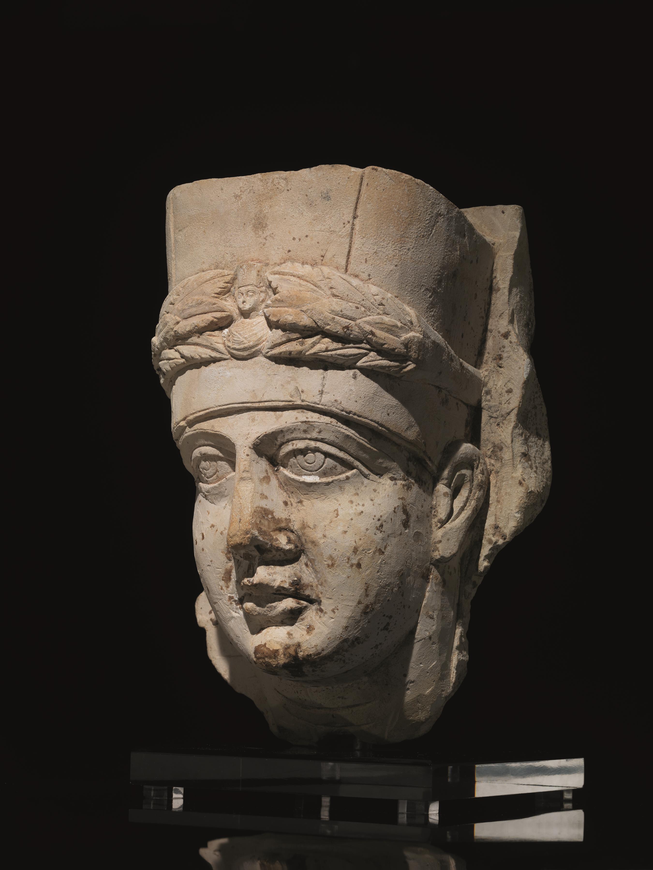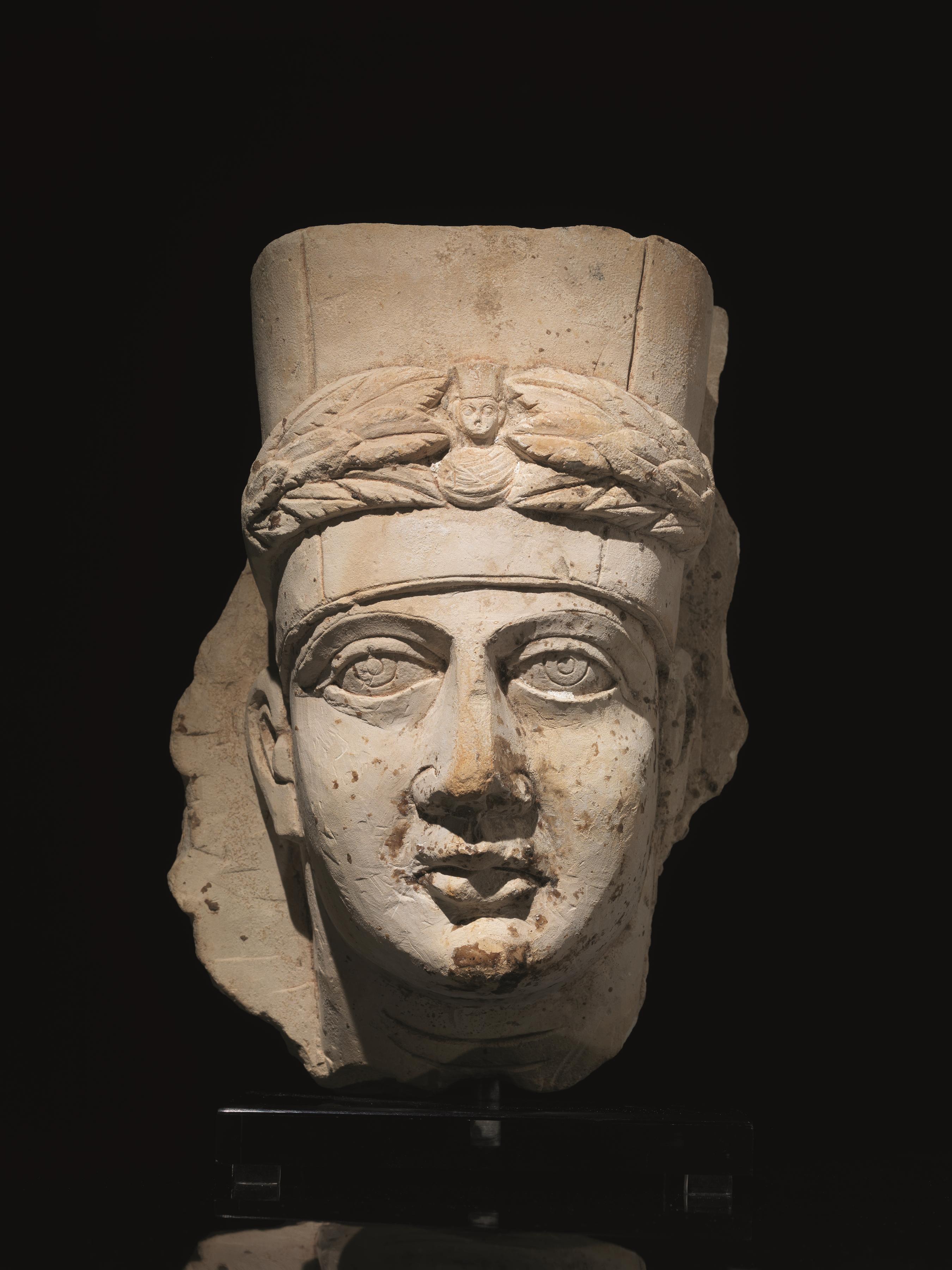 Testa di sacerdote di Bel in posizione frontale, indossa il modius, tradizionale copricapo dei sacerdoti di Palmira, alto e spartito in tre settori da linee verticali; sulla fronte si intravede la fodera interna; una ricca ghirlanda di foglie di quercia sostiene al centro un busto maschile paludato con sulla testa un modio analogo. Il volto è caratterizzato da una fronte bassa, sopracciglia ad incisione, occhi con indicazione della palpebra, della pupilla e dell’iride tramite incisioni, naso rettilineo con profonde solcature alla base, bocca semichiusa con labbra sporgenti, mento arrotondato, due profonde solcature semicircolari sul collo ne indicano l’età matura, le orecchie sono molto stilizzate; nella parte posteriore si conserva la lastra da cui sporgeva in altorilievo
