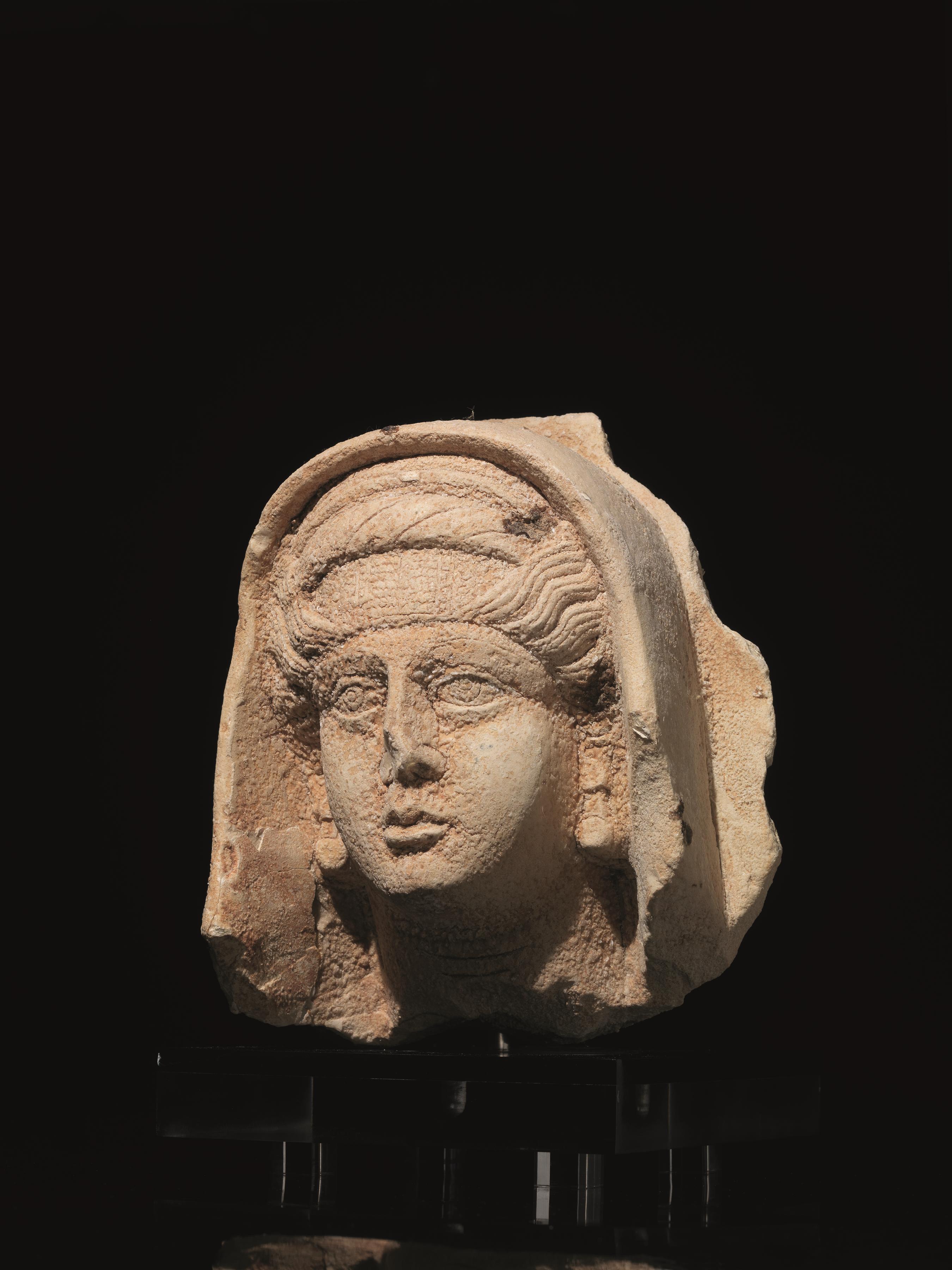 Testa femminile velata in posizione frontale, porta sui capelli una tiara complessa formata da vari elementi sovrapposti e terminante sulla fronte con una fascia decorata da un motivo centrale a foglie affiancate da rosette che ripete fedelmente i temi impiegati nella ricchissima produzione di lusso con filo d’oro e d’argento della città di Palmira, ai lati fuoriescono i capelli modellati a onde; il volto è caratterizzato da una fronte bassa, sopracciglia ad incisione, occhi con indicazione della palpebra, della pupilla e dell’iride tramite incisioni, naso rettilineo, labbra fortemente sporgenti, mento arrotondato, due profonde solcature semicircolari sul collo; ai lati del viso due grandi orecchini con pendenti fuoriescono dalla massa dei capelli; nella parte posteriore si conserva la lastra da cui sporgeva in altorilievo