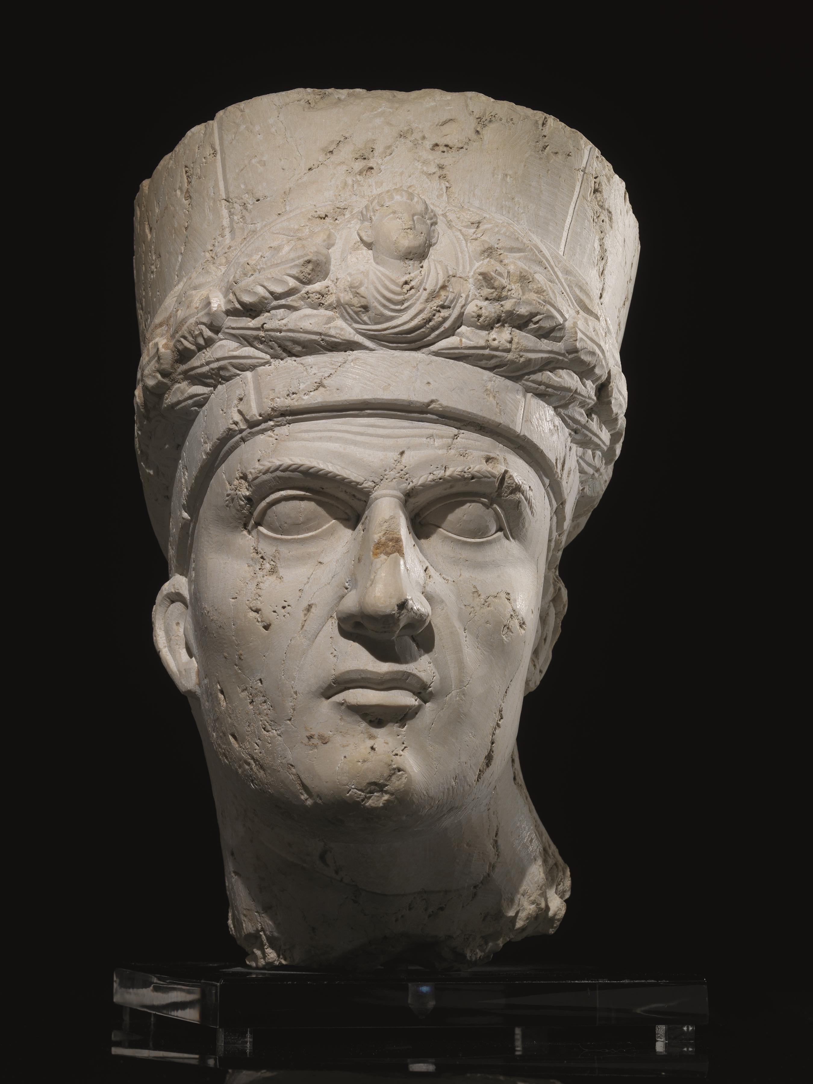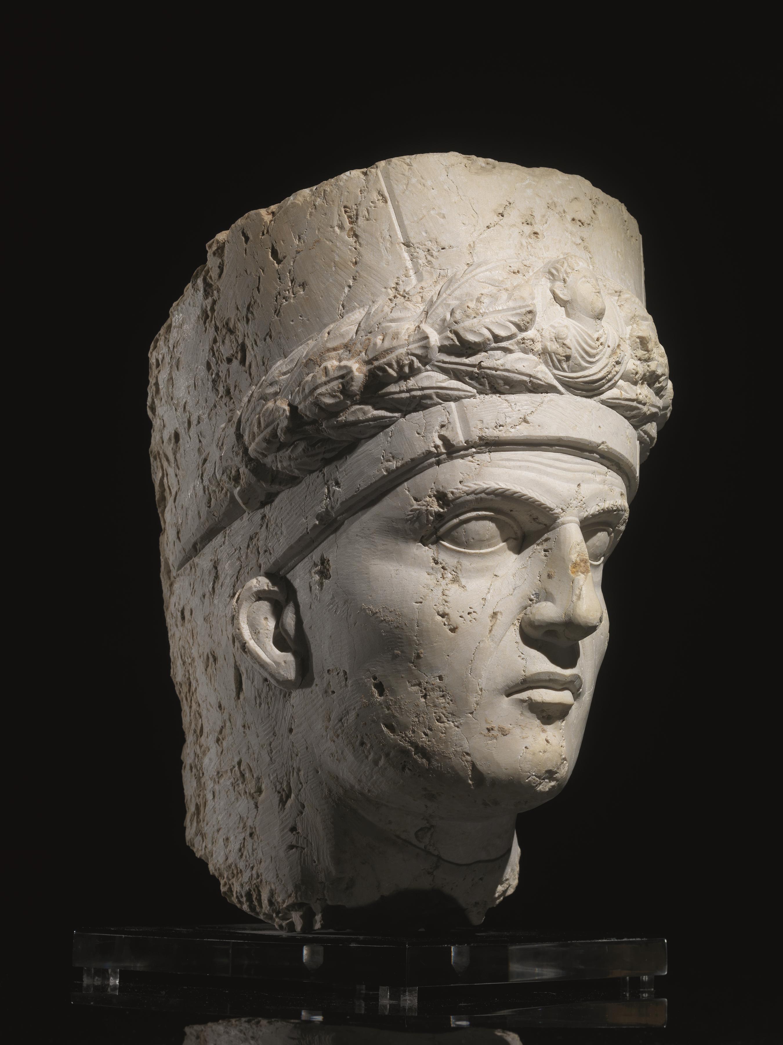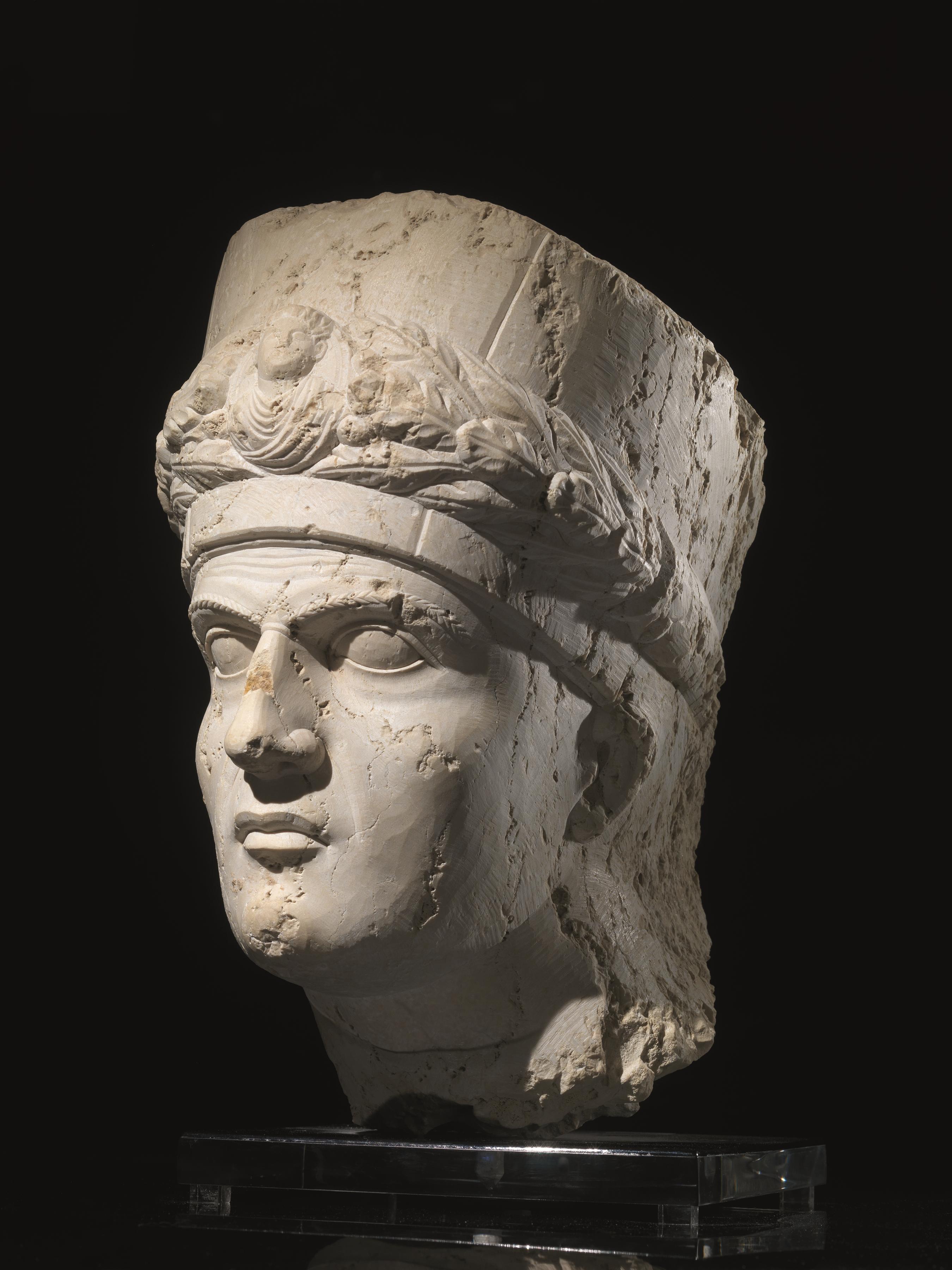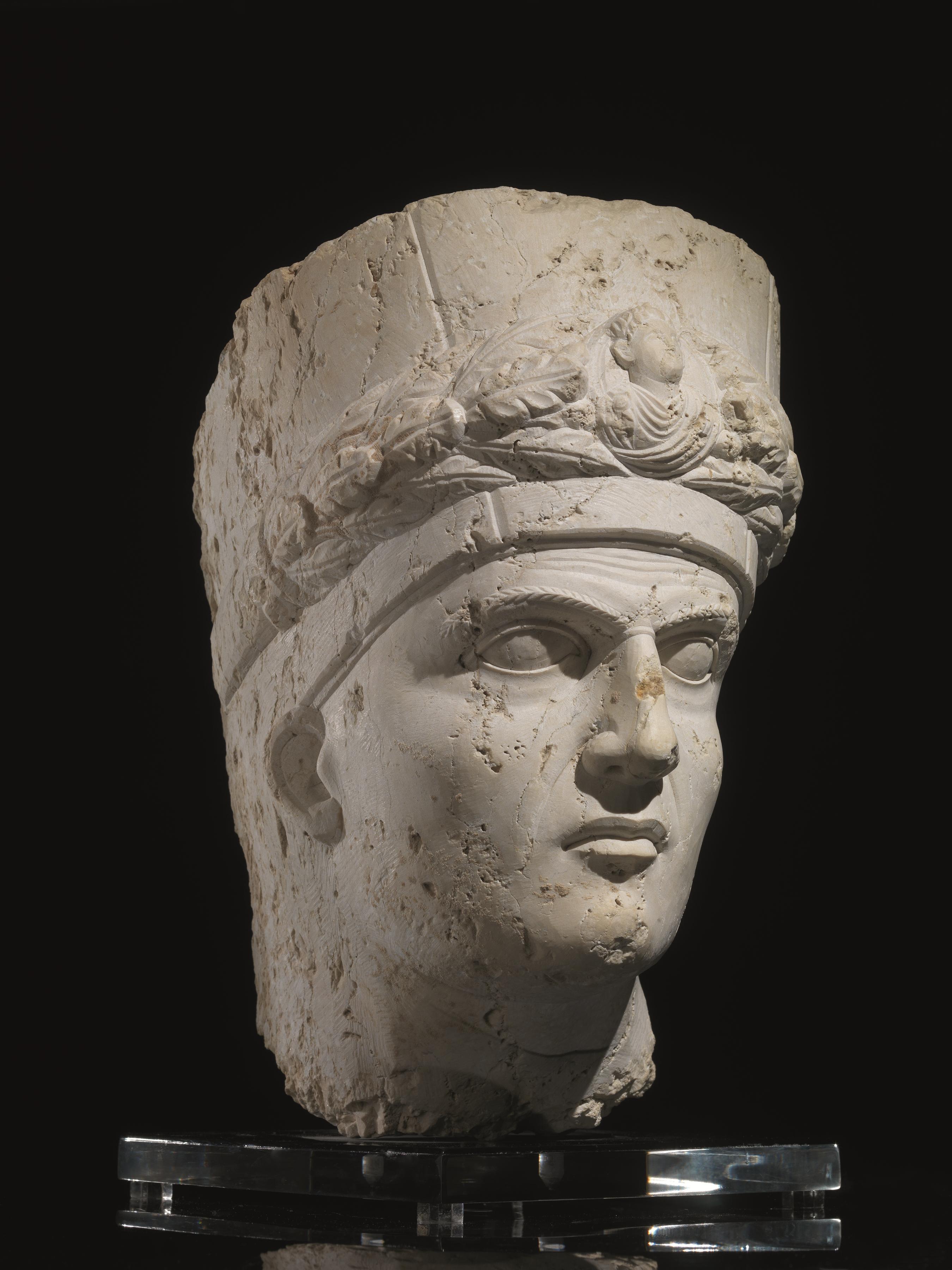 La scultura, di dimensioni superiori al vero, rappresenta il defunto probabilmente effigiato come banchettante sulla kline la testa infatti è ruotata sul collo a sinistra e inclinata; indossa il modius, tradizionale copricapo dei sacerdoti di Palmira, alto e spartito in tre settori da linee verticali; sulla fronte si intravede la fodera interna; una ricca ghirlanda di foglie di alloro e quercia sostiene al centro un clipeo con un busto maschile paludato. Il volto è fortemente caratterizzato con tre profonde increspature sulla fronte, sopracciglia accuratamente delineate, arcate orbitali nettamente chiaroscurate con palpebre in rilievo ed indicazione del dotto lacrimale; il naso largo e virile è solcato alla base da due rughe, la bocca presenta labbra carnose e socchiuse, il mento è lievemente pronunciato in avanti e gli zigomi ben rilevati, il collo è scolpito con indicazione della muscolatura, mentre le orecchie sono rese in maniera piuttosto sommaria; nella parte posteriore la testa non è lavorata