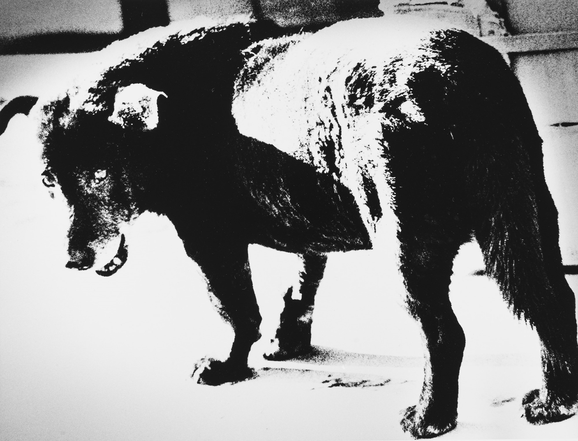 Fotografo cacciatore, non legato ad alcun luogo e quindi vicino a tutti, (il padre per lavoro si trasferiva con lui bambino in diverse città), Daido Moriyama sa trasformare un elemento apparentemente asettico come un cane randagio da lui colto la mattina del Capodanno 1971 appena uscito dall’albergo in cui risiedeva in una fotografia memorabile. Il mosso e la sfocatura, il contrasto fra la figura scura e lo sfondo, il sole che illumina una parte dell’animale trasmettono un senso di sospensione che attrae.