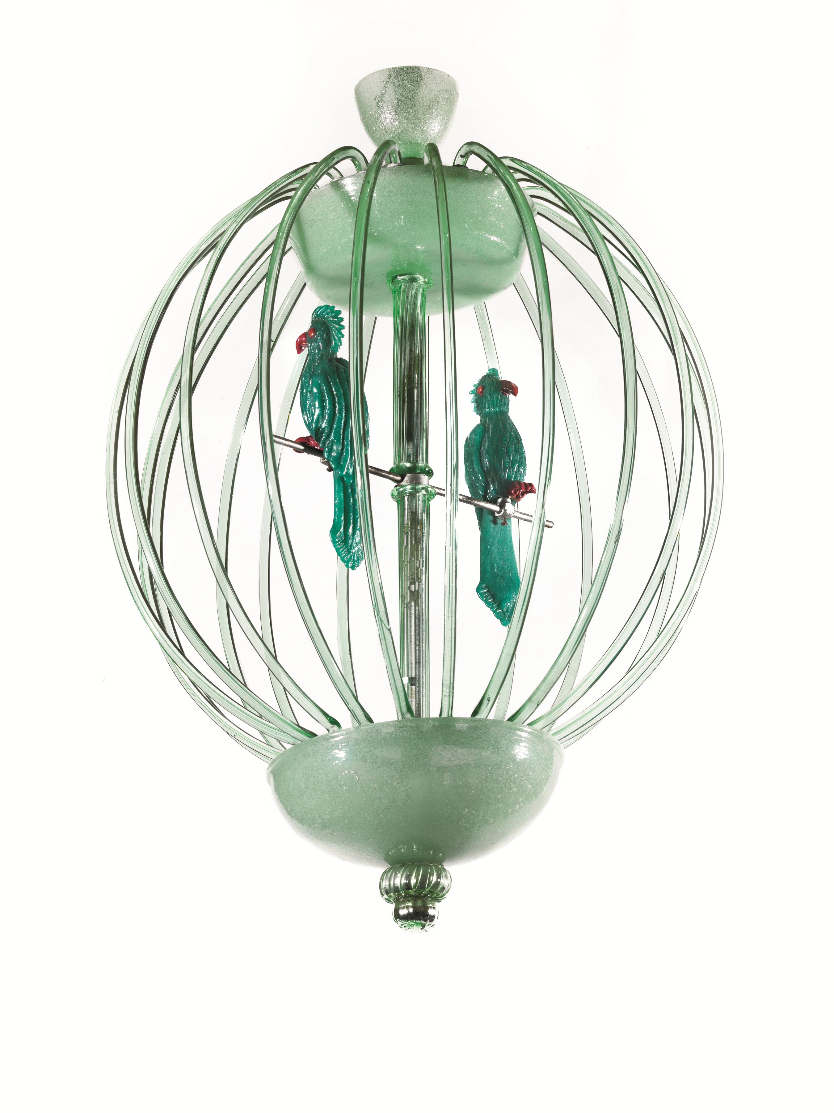 in vetro verde, realisticamente modellato a gabbia con due pappagalli, a tre luci