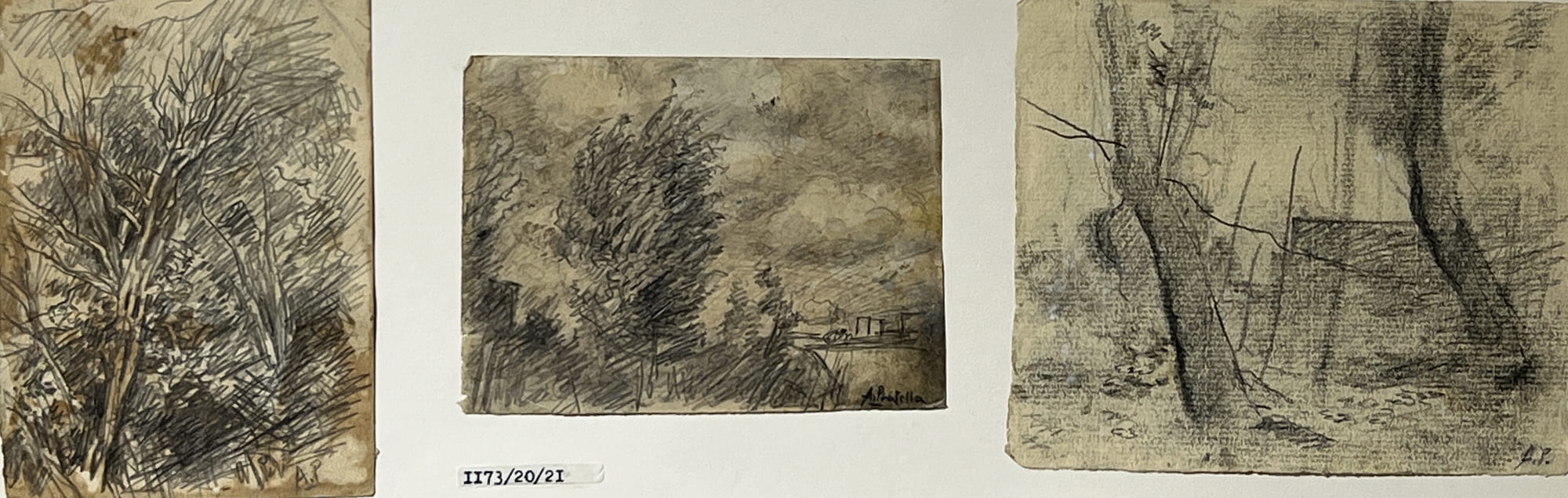 3. Appunto di alberi, matita su carta, firma: siglato in basso a destra, misure: cm 12 x 14