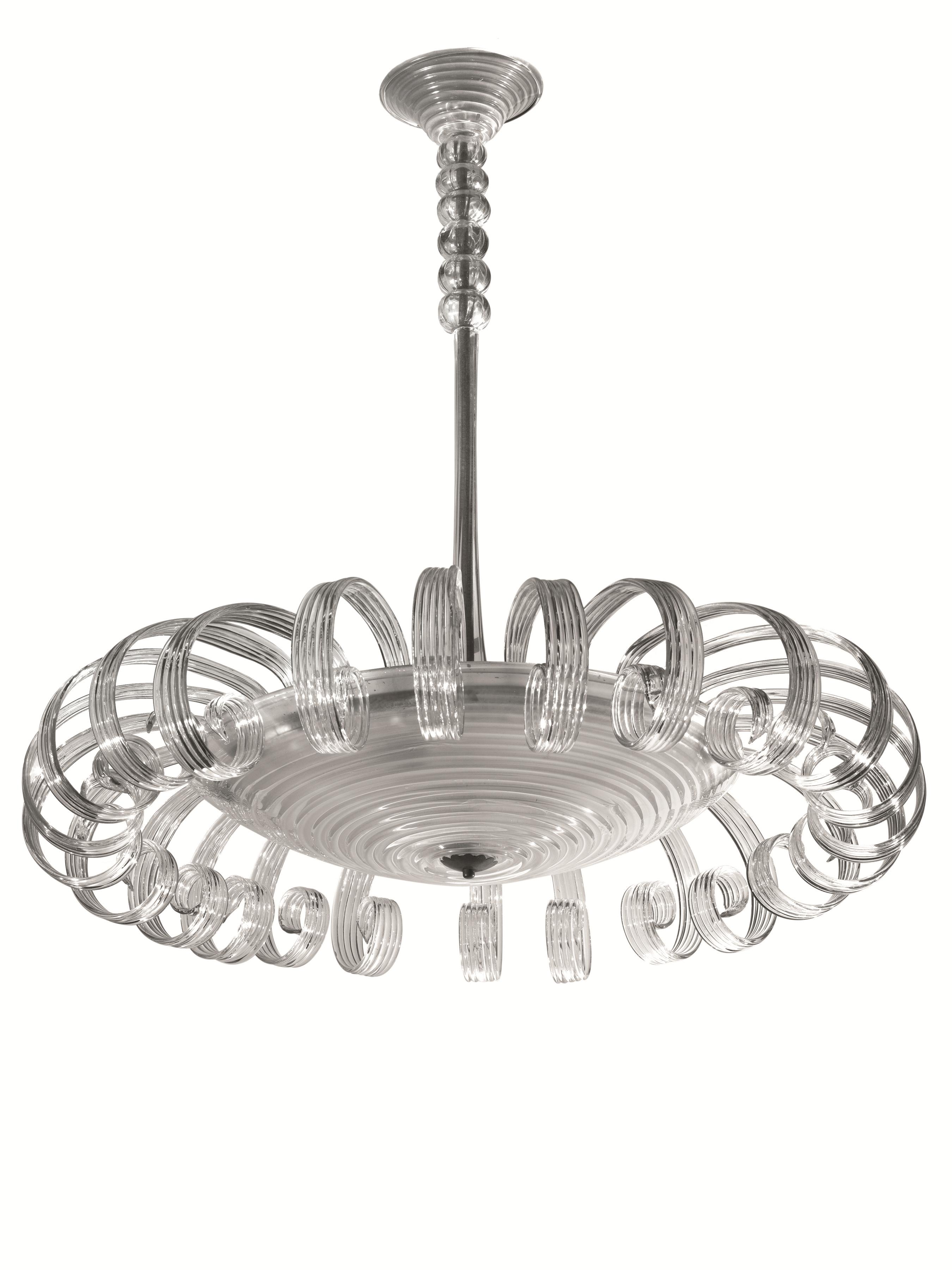 di forma circolare, in vetro bianco satinato, decorato da ventiquattro riccioli in vetro trasparente, a tre luci