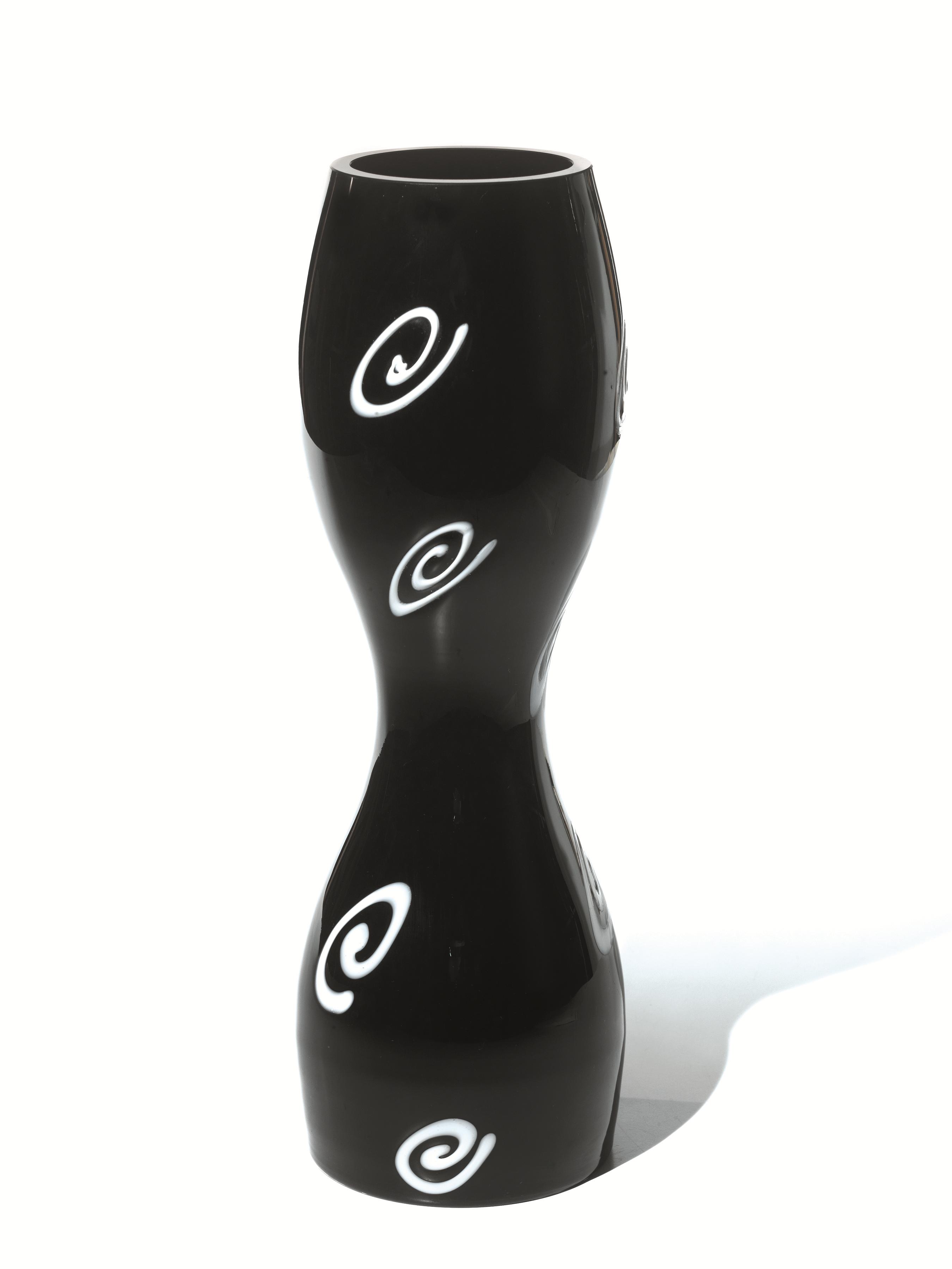 in vetro nero decorato da spirali bianche, corpo modellato a clessidra