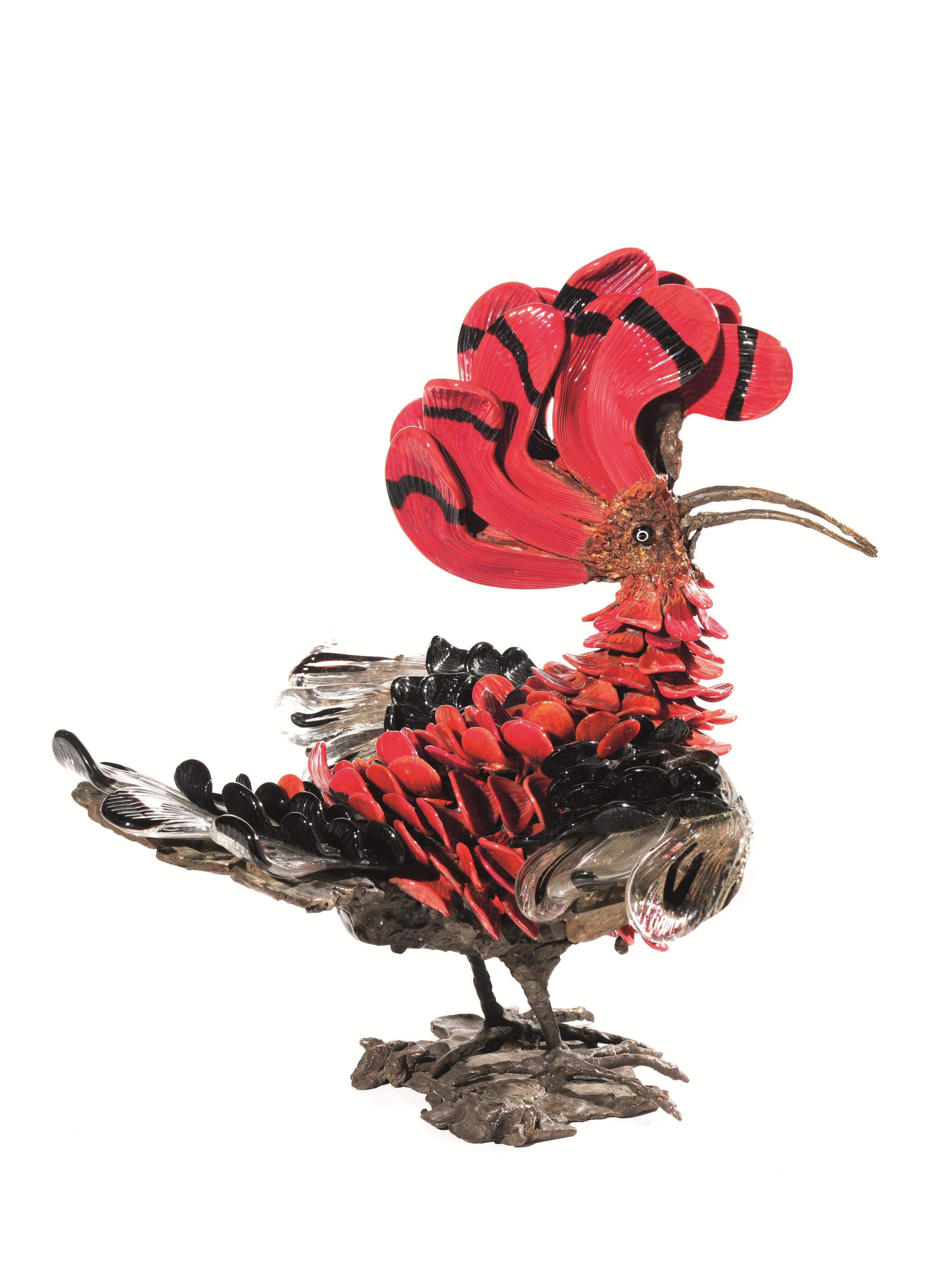 struttura in bronzo e piume in vetro policomo applicate a caldo