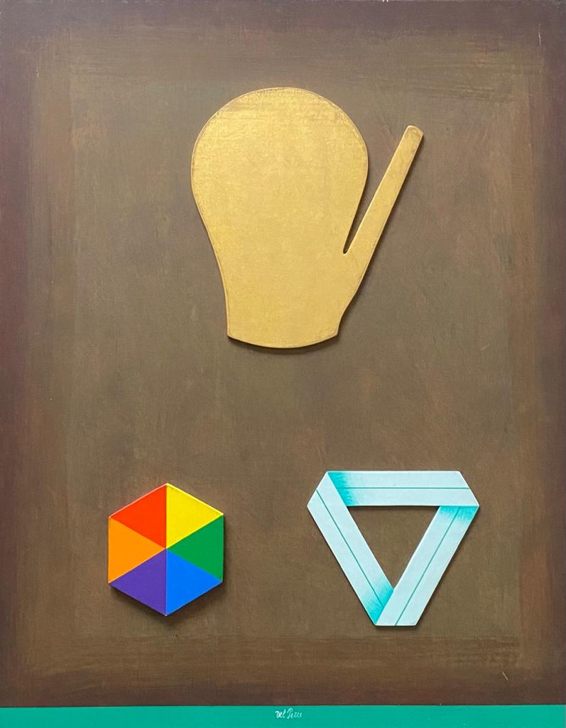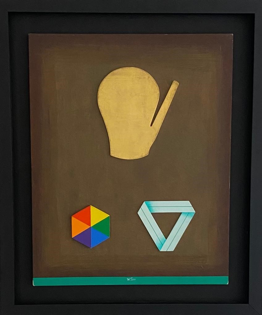 Collage, colore acrilico, oro in foglie su legno, cm 75x60