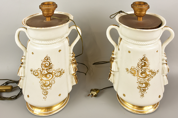 COPPIA DI LAMPADE IN CERAMICA con decorazioni floreali e in oro zecchino h...