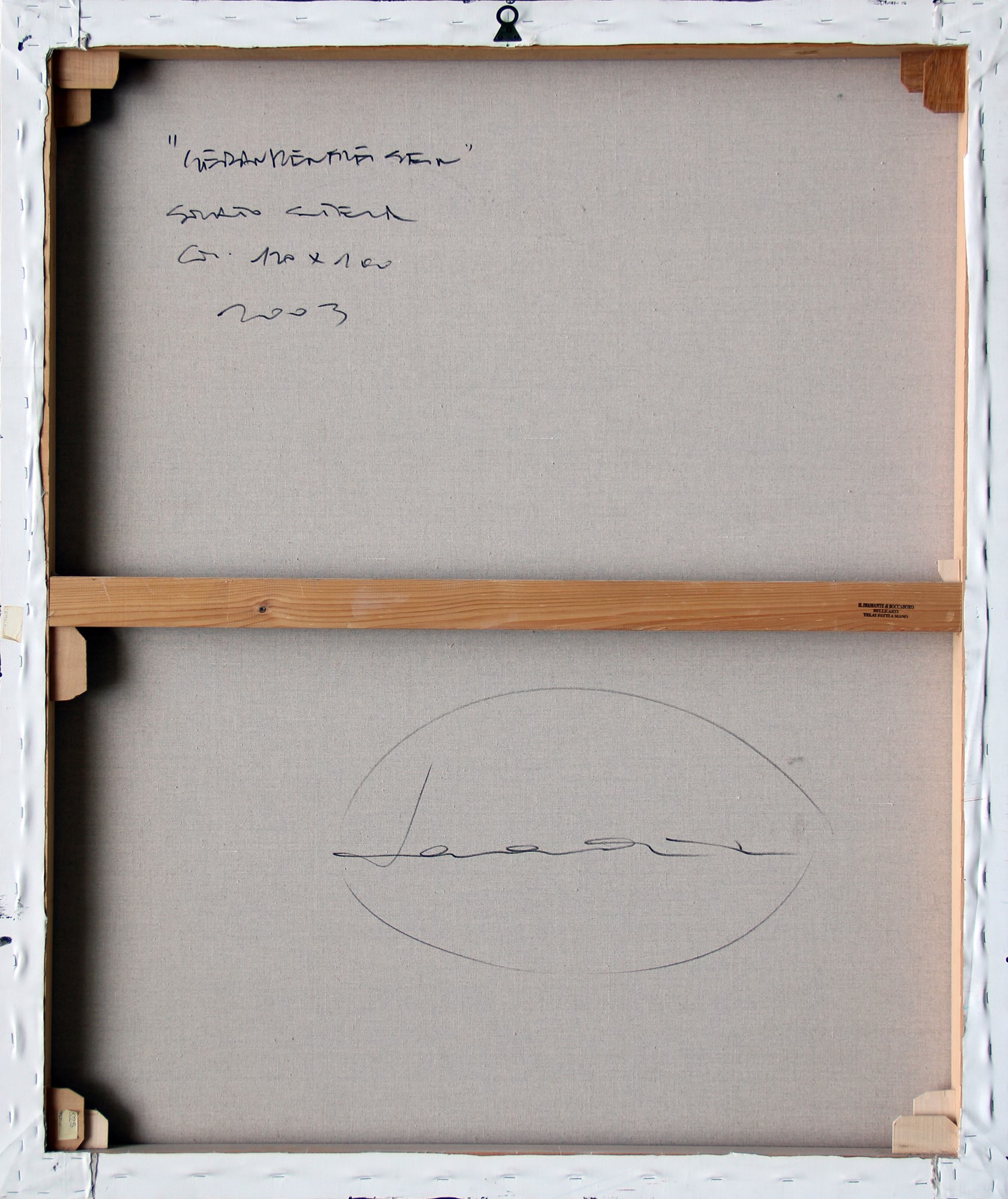Titolo, tecnica, misura, data, firma "Gedankenfrei sein, smalto su tela, cm 120x100, 2003, Leonida De Filippi" (al retro)