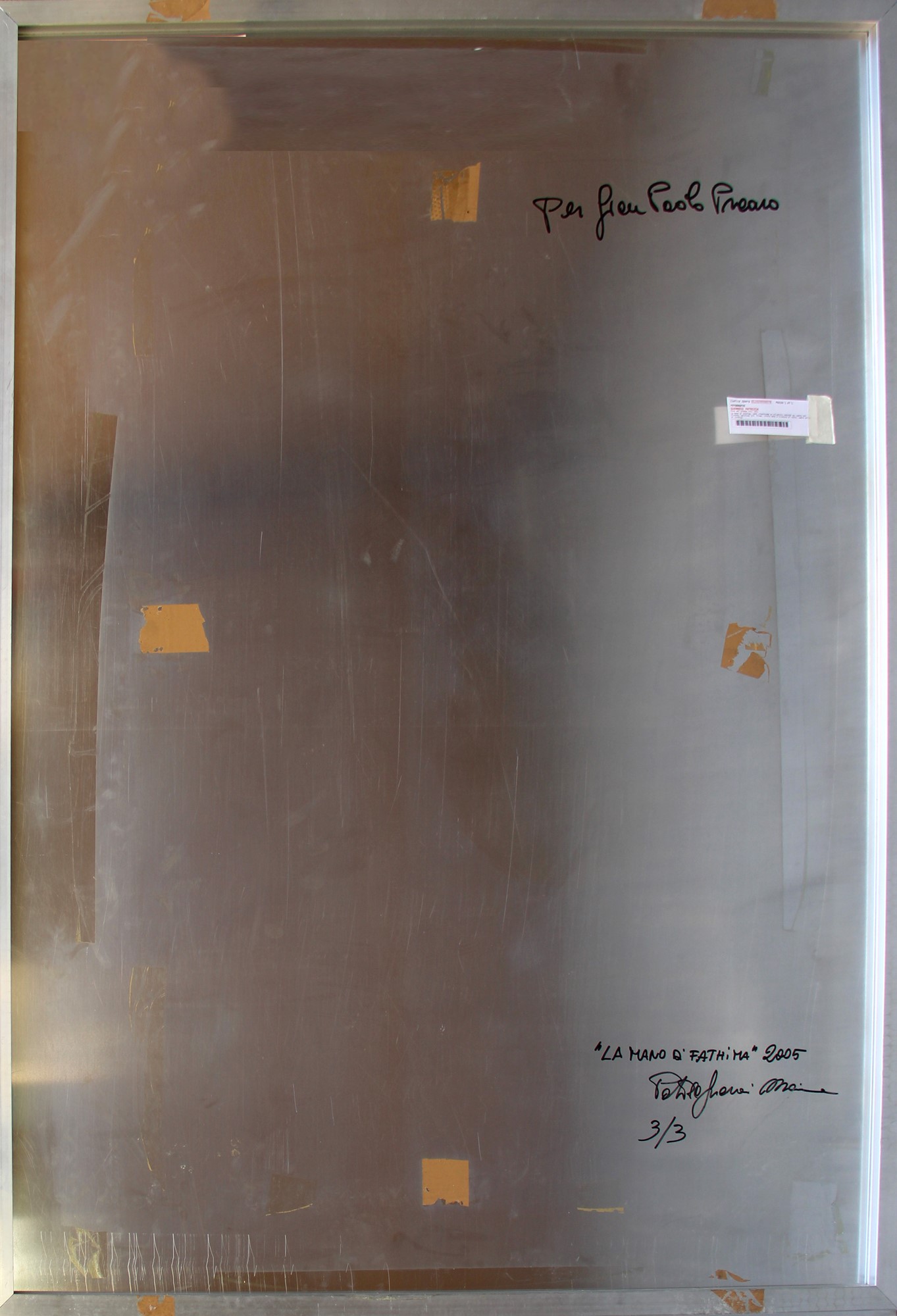 Dedica, titolo, data, firma, numerazione "La mano di Fathima, 2005, Patrizia Guerresi Maïmouna, 3/3" (al retro)