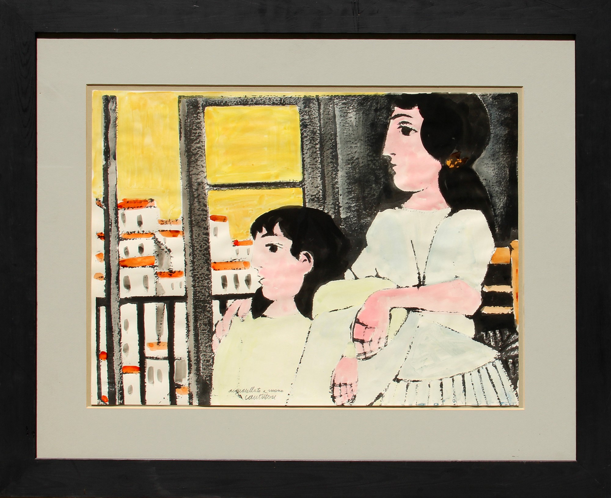CANTATORE Domenico, Ragazze alla finestra, litografia acquarellata su cartoncino, cm 47,5x65