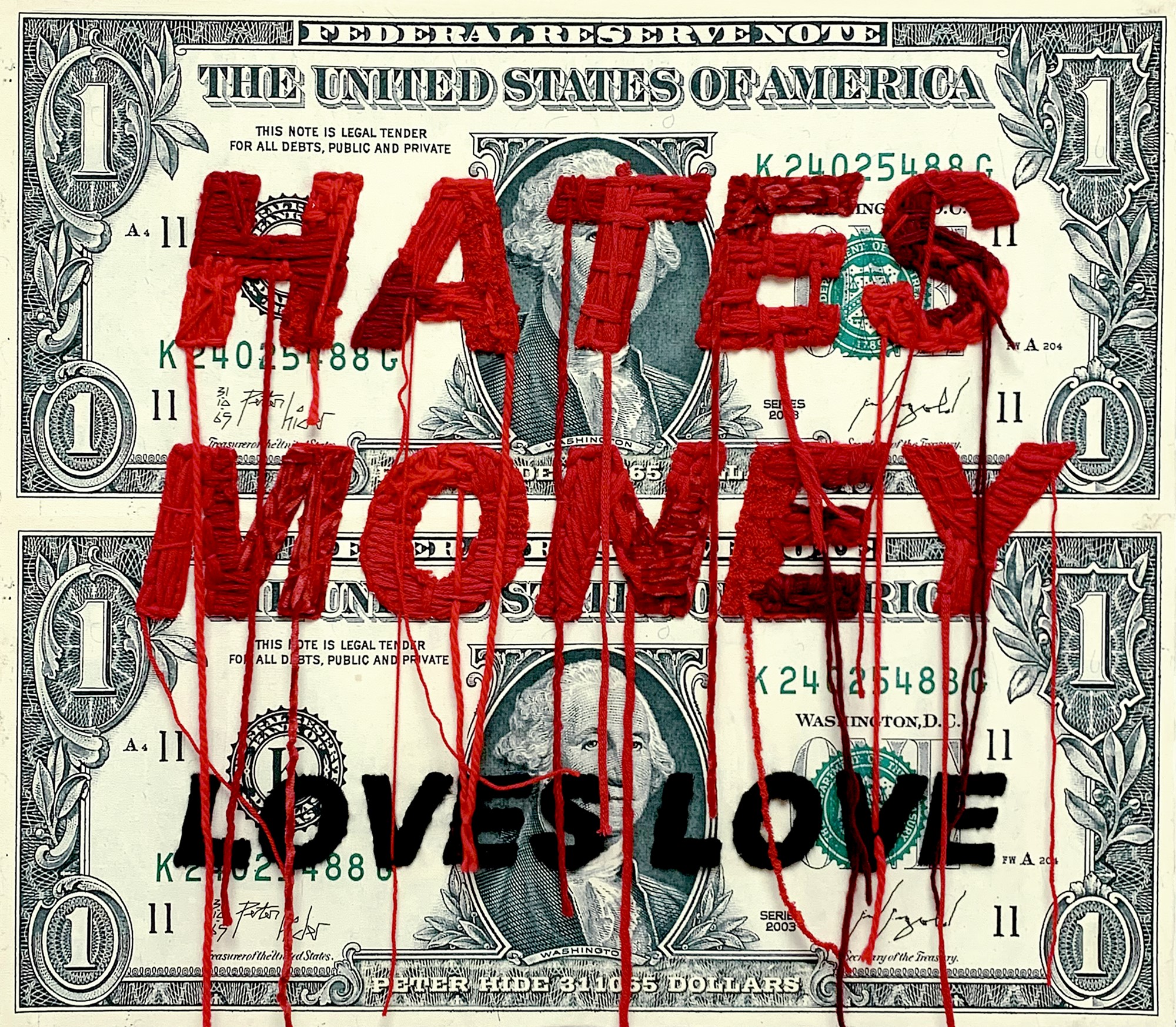 HIDE 311065 Peter, Hates Money, Loves Love, 2022, tecnica mista, intrecci di fili di lana su tela stampata, cm 69x83,5x5