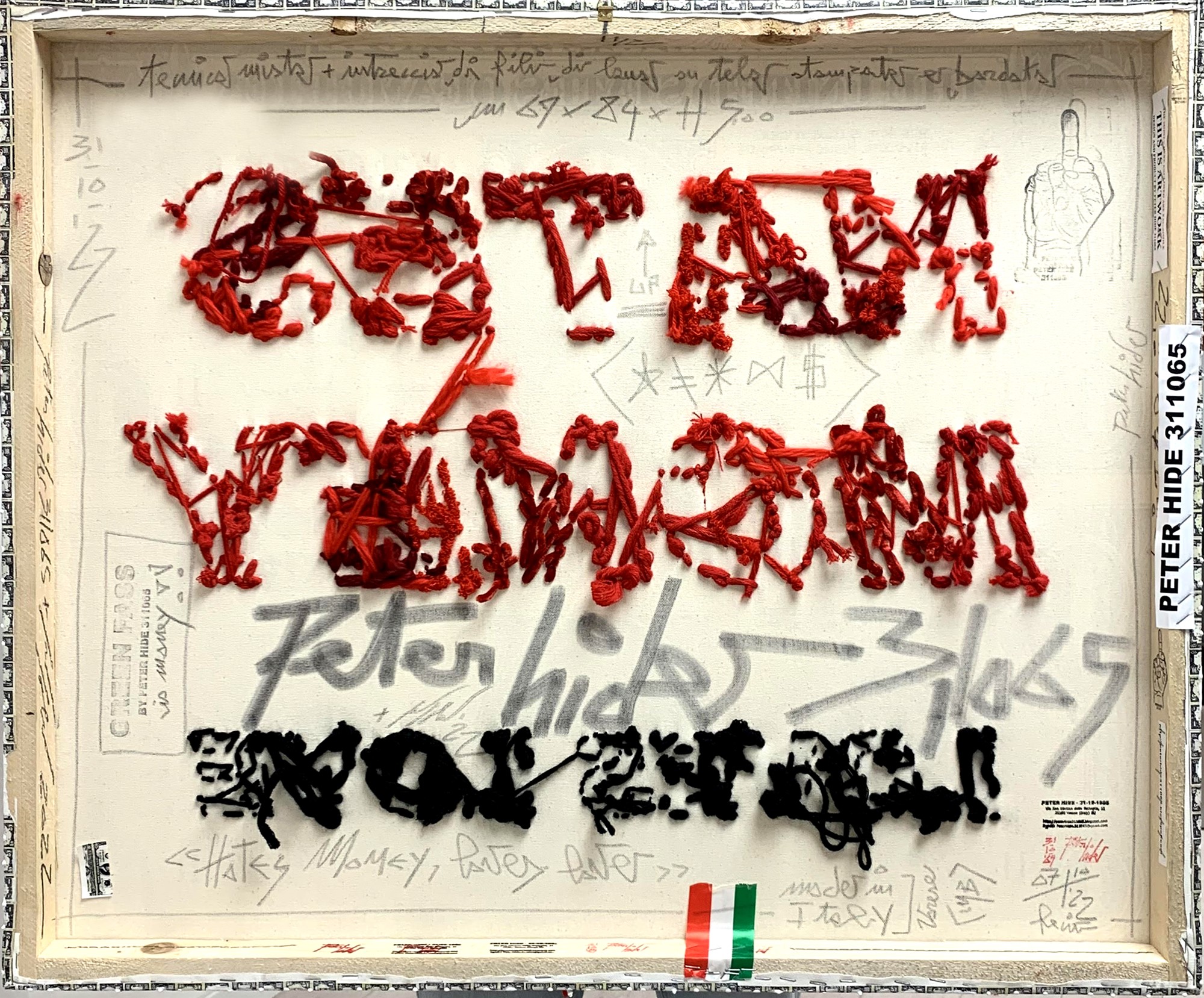 Tecnica, misura, firma, titolo, luogo, data "tecnica mista + intreccio di fili di lana su tela stampata, cm 69x84x5, Peter Hide 311065, Hates Money Loves Love, Made in Italy Varese, 07/10/22";
