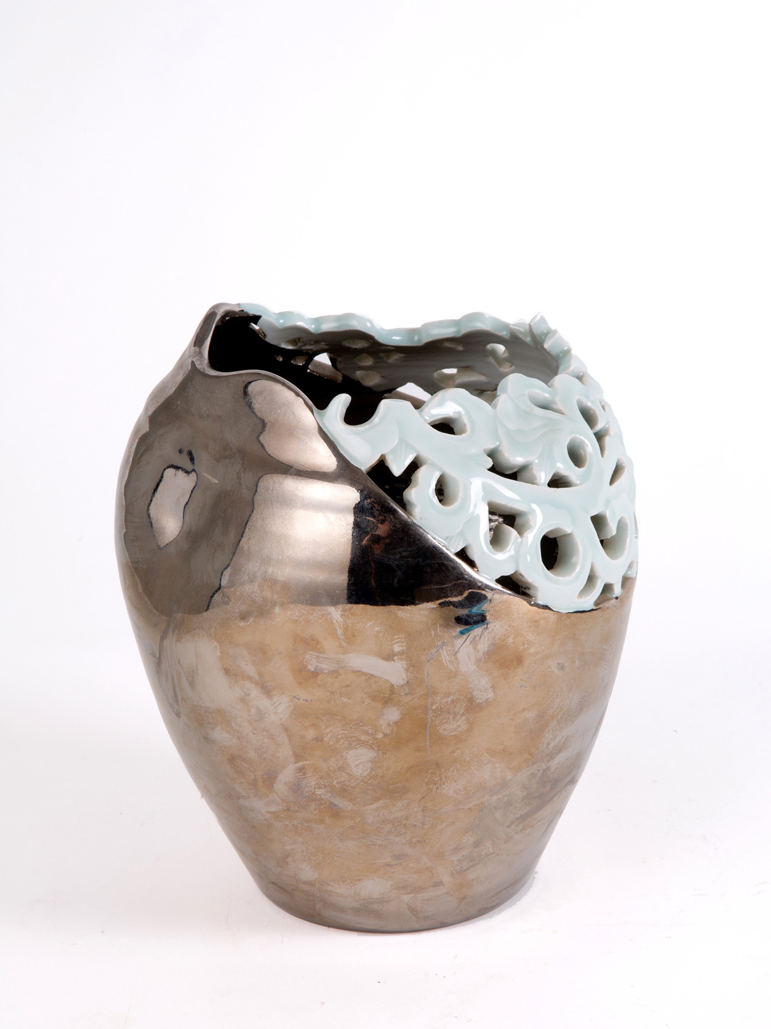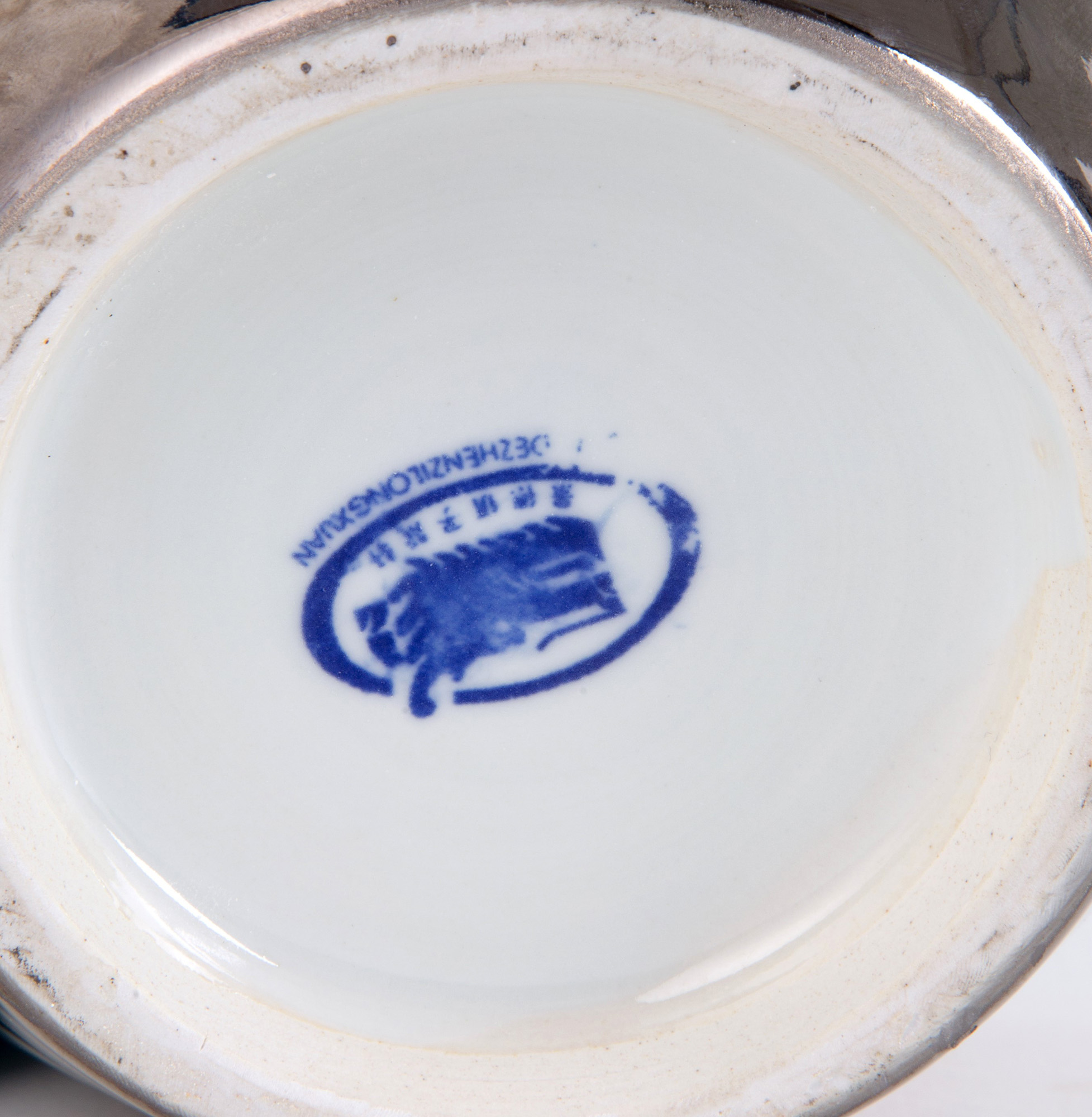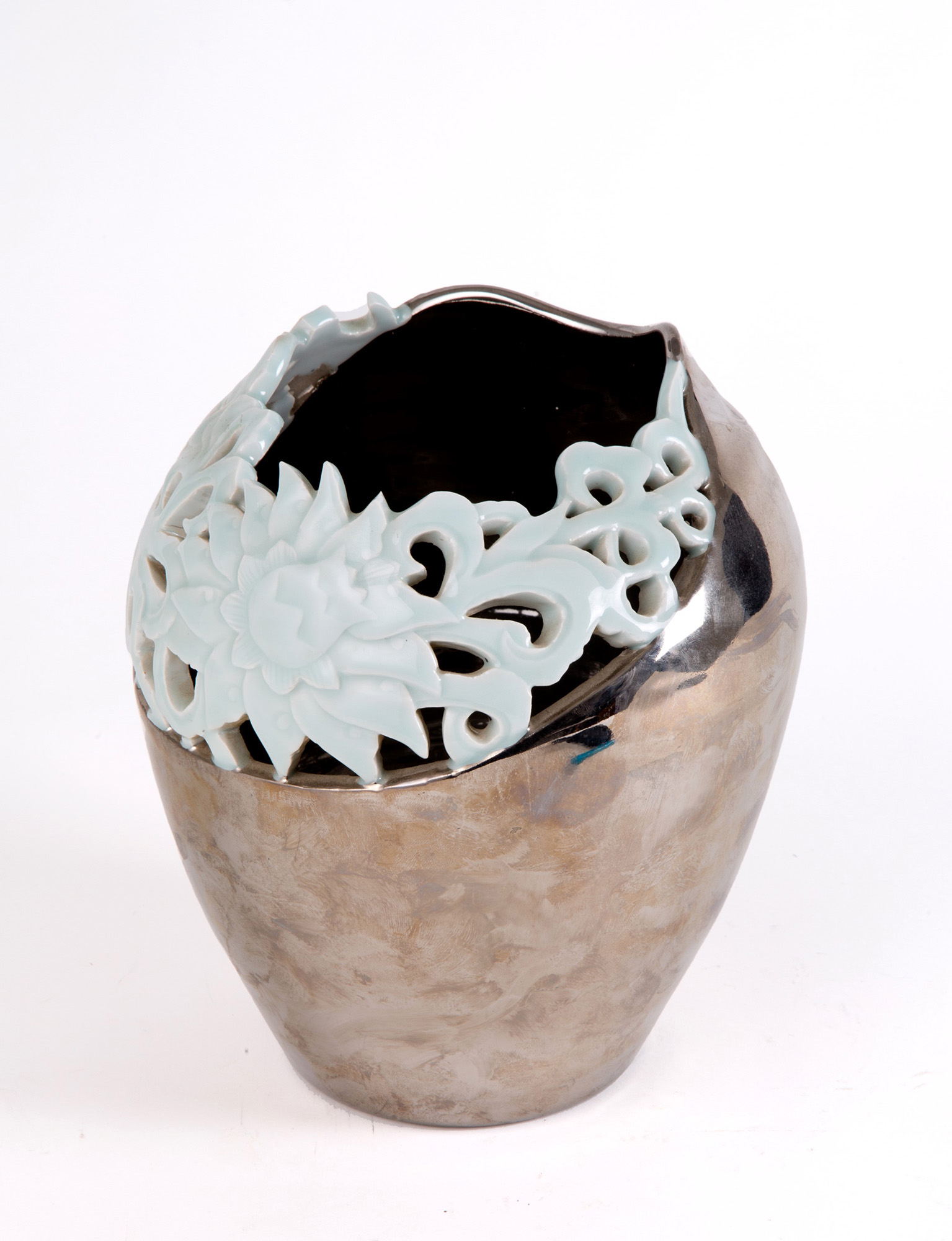 Porcelain vase in celadon and silver colour. Branded on the bottom dezhenzilongxuan. China. 20th century. 22x20cm approx. Vaso in porcellana color celadon e argento. Con marchio sul fondo dezhenzilongxuan. Cina. XX secolo. 22x20 cm ca.