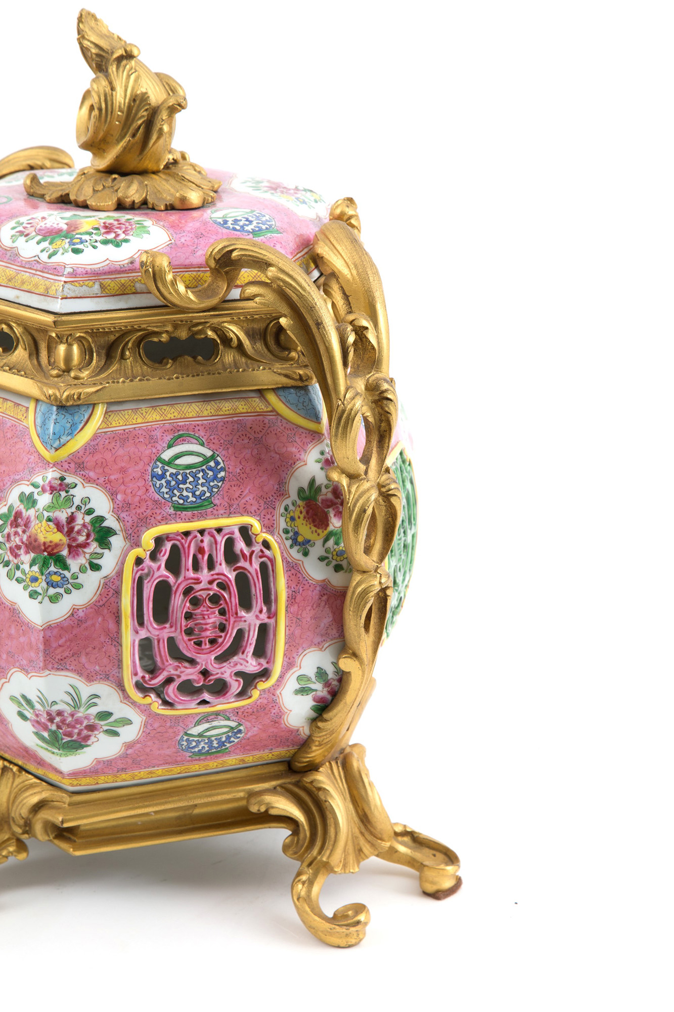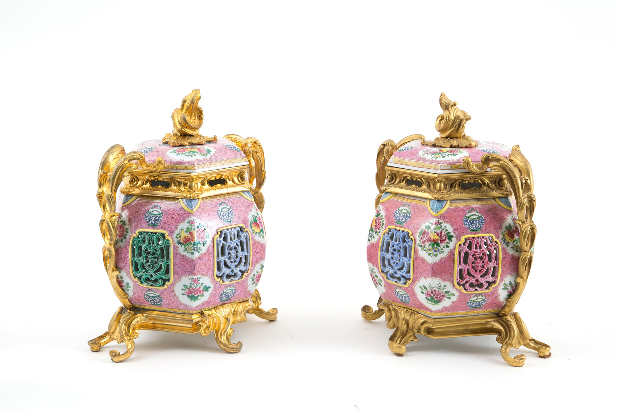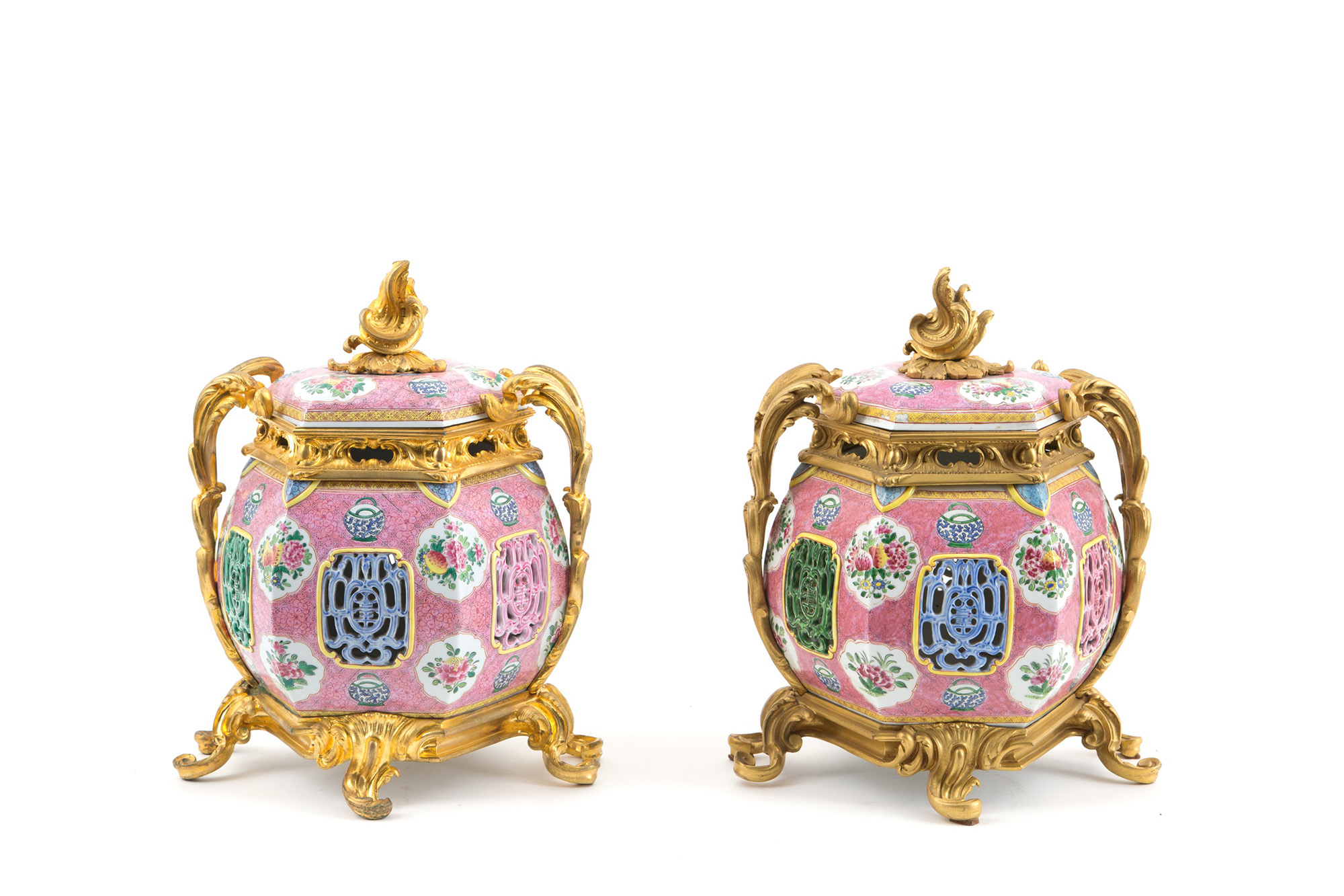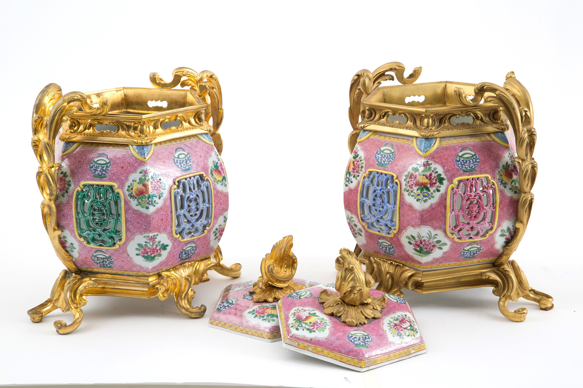 Pair of Pink Family hexagonal porcelain vases with gilt bronze mount. China. 37x26cm approx. Coppia di vasi esagonali in porcellana Famiglia Rosa con montatura in bronzo dorato. Cina. 37x26 cm ca.