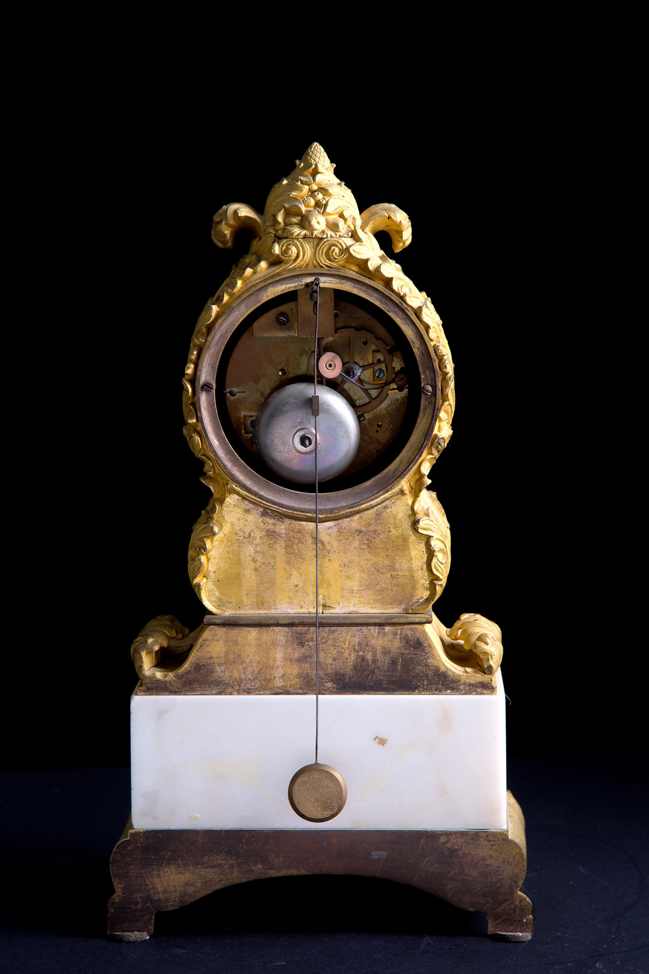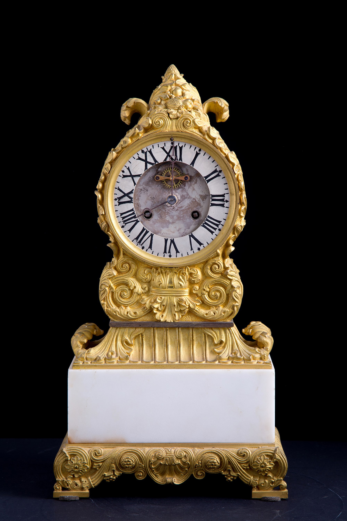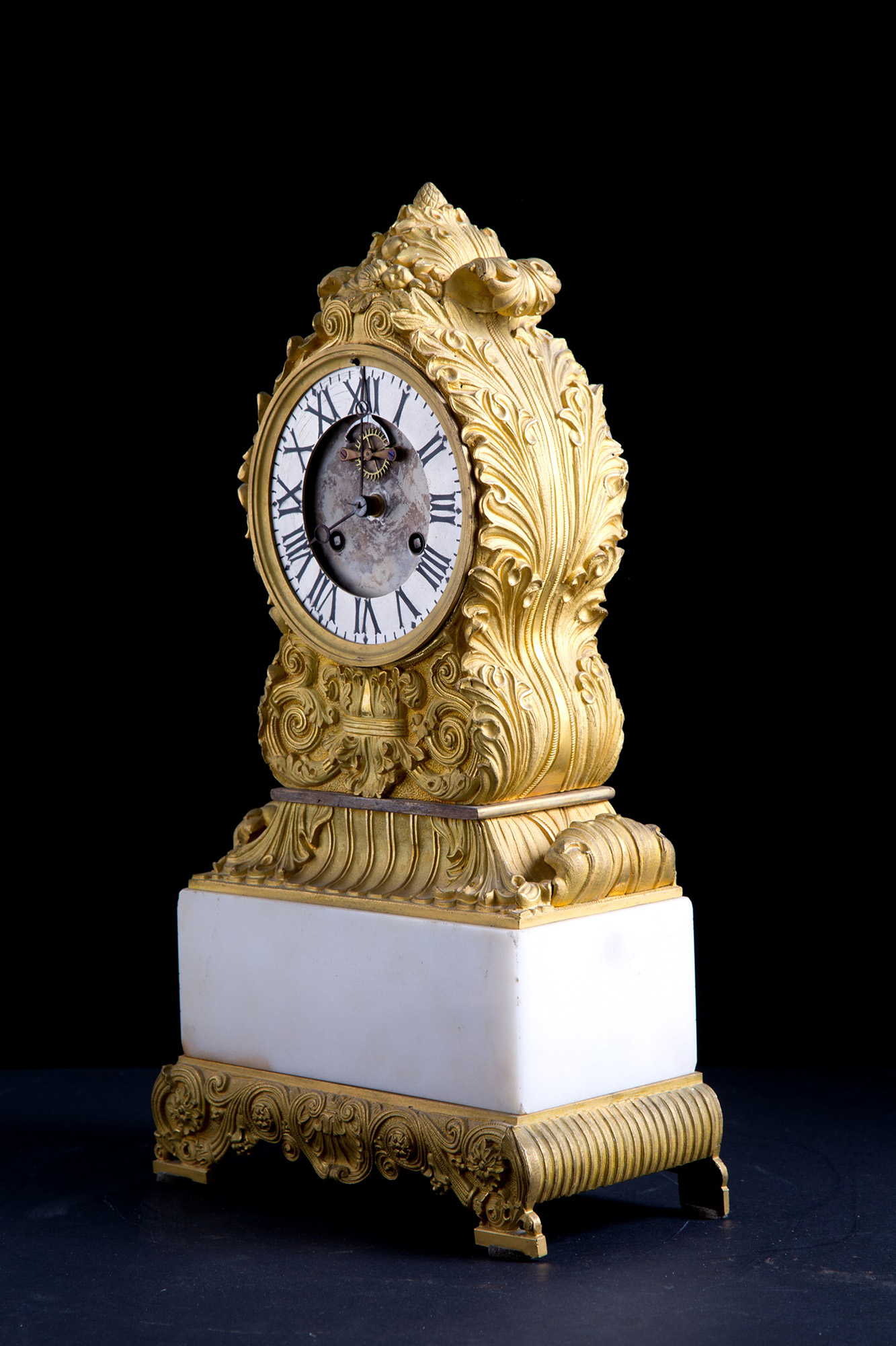 Table clock in finely chiselled gilt bronze and white marble. 19th century. 39x23x11cm approx. Orologio da tavolo in bronzo dorato finemente cesellato e marmo bianco. XIX secolo. 39x23x11 cm ca.