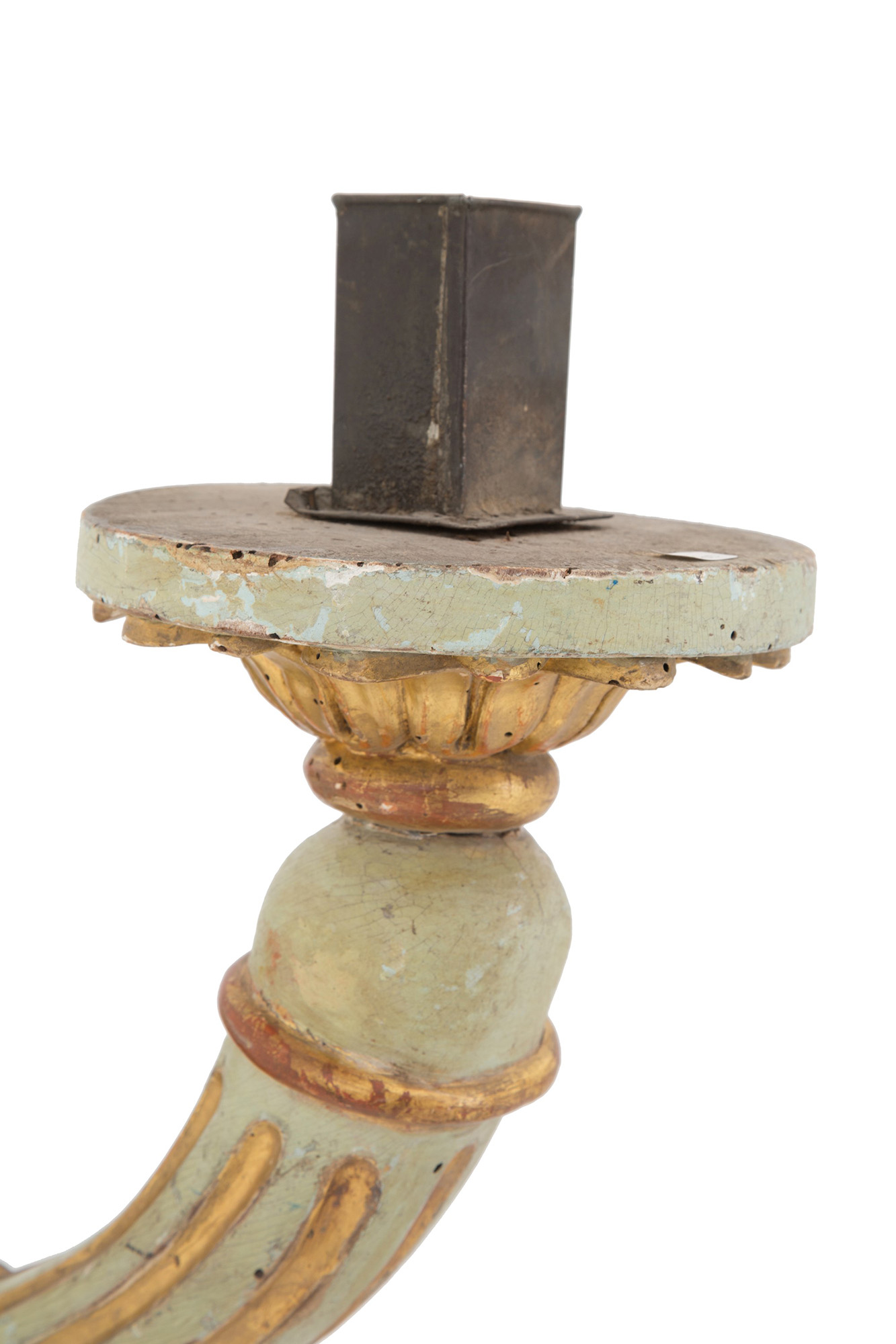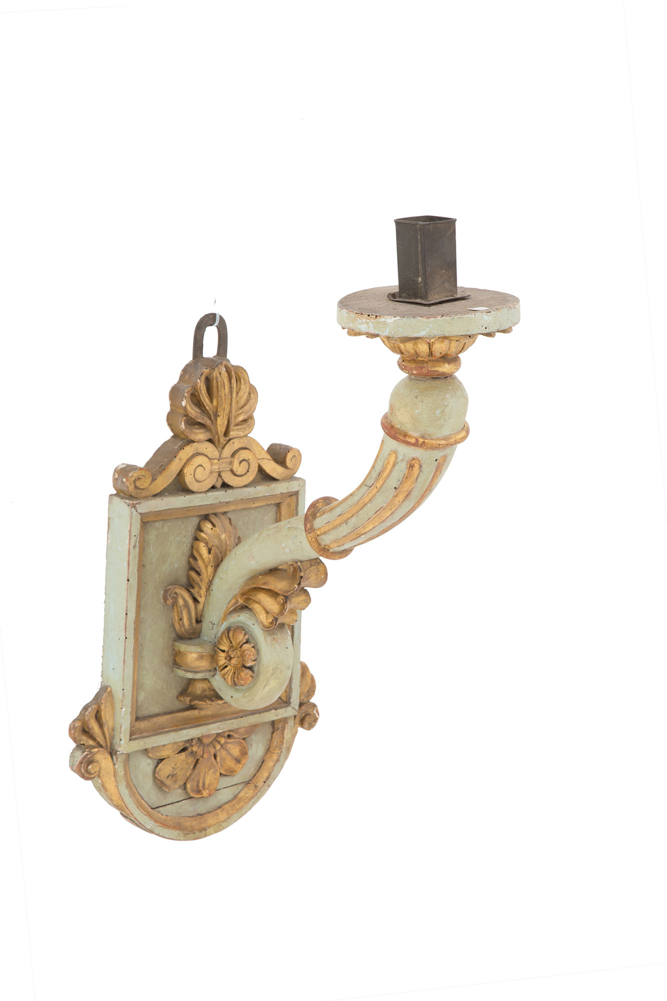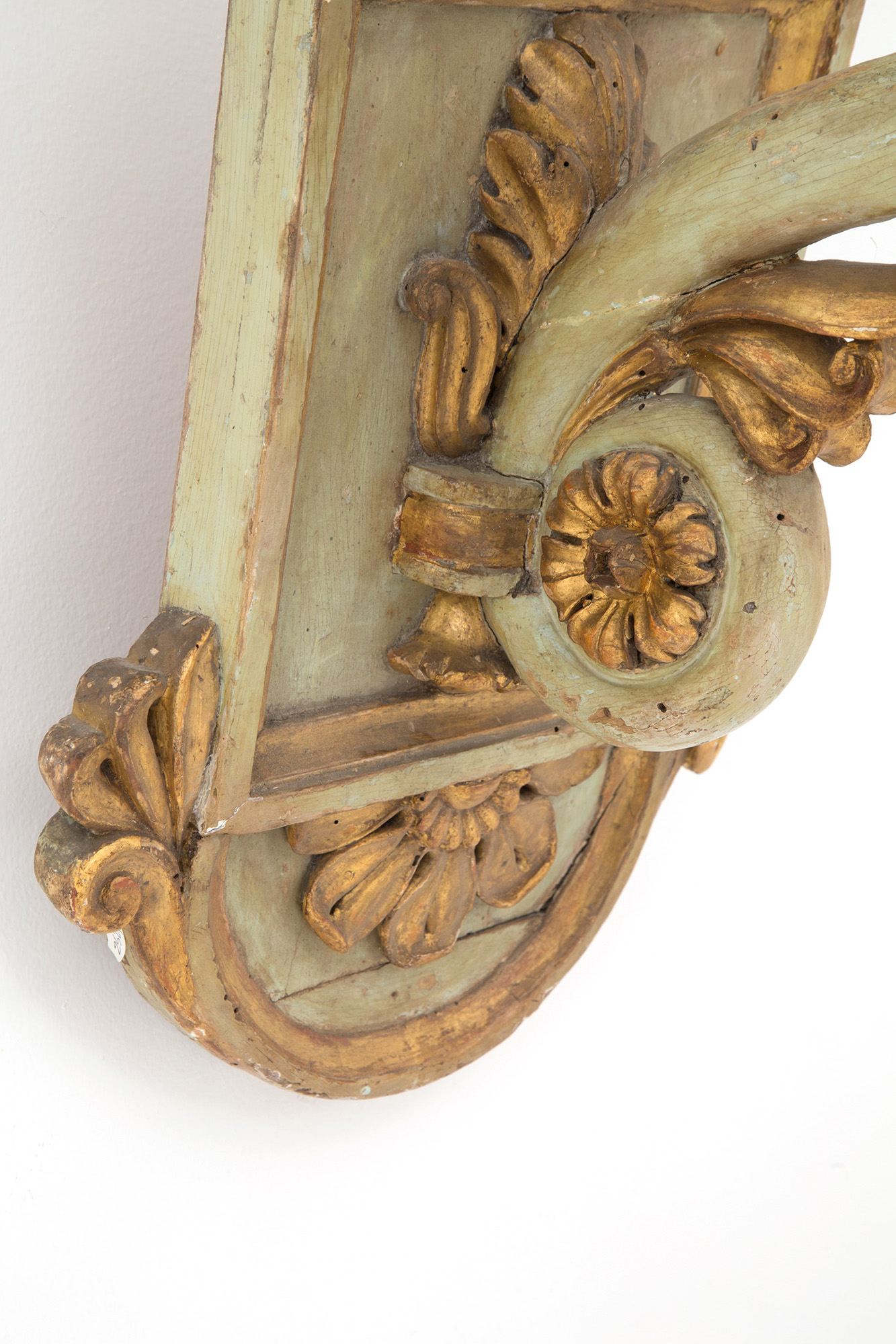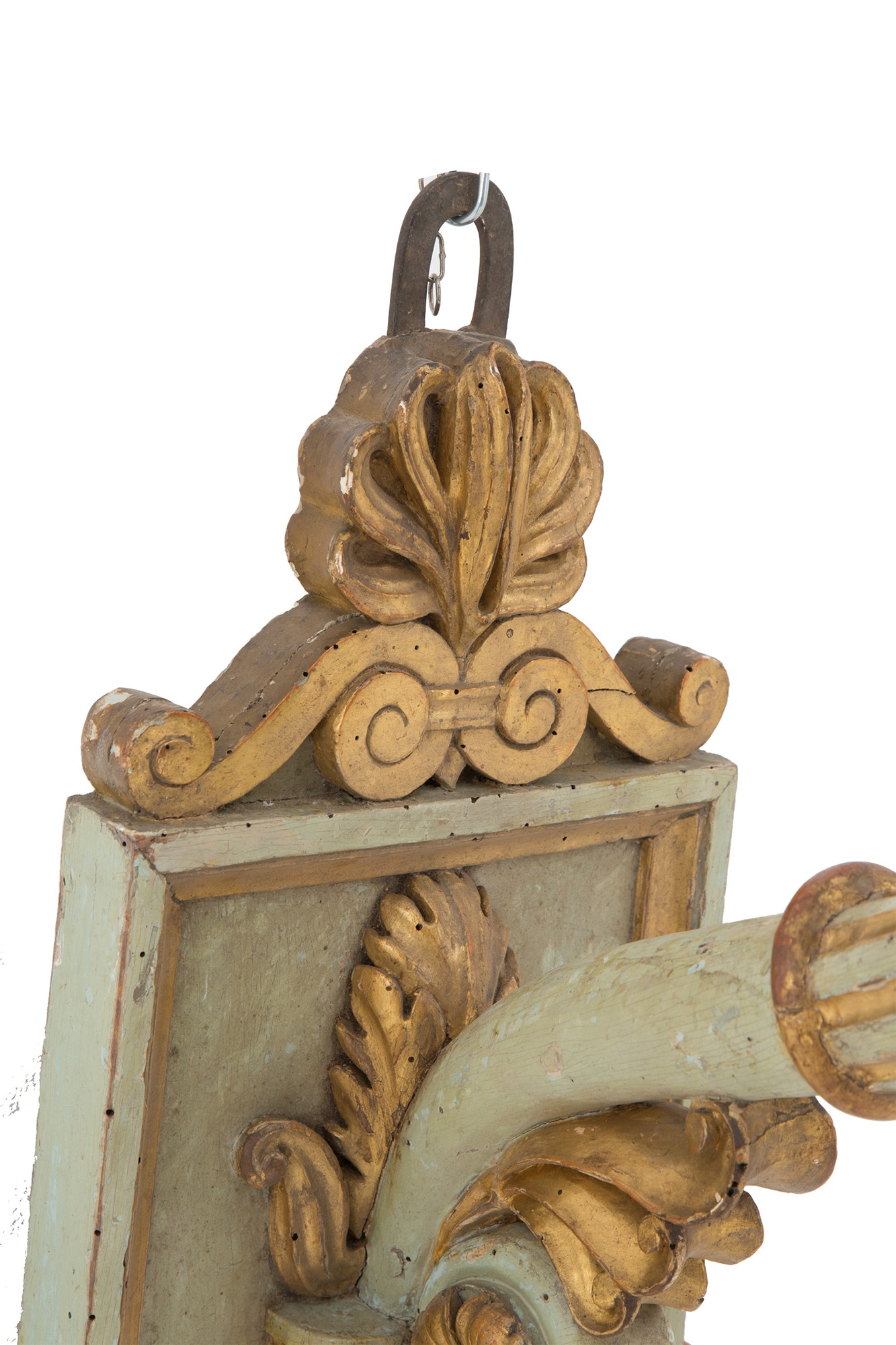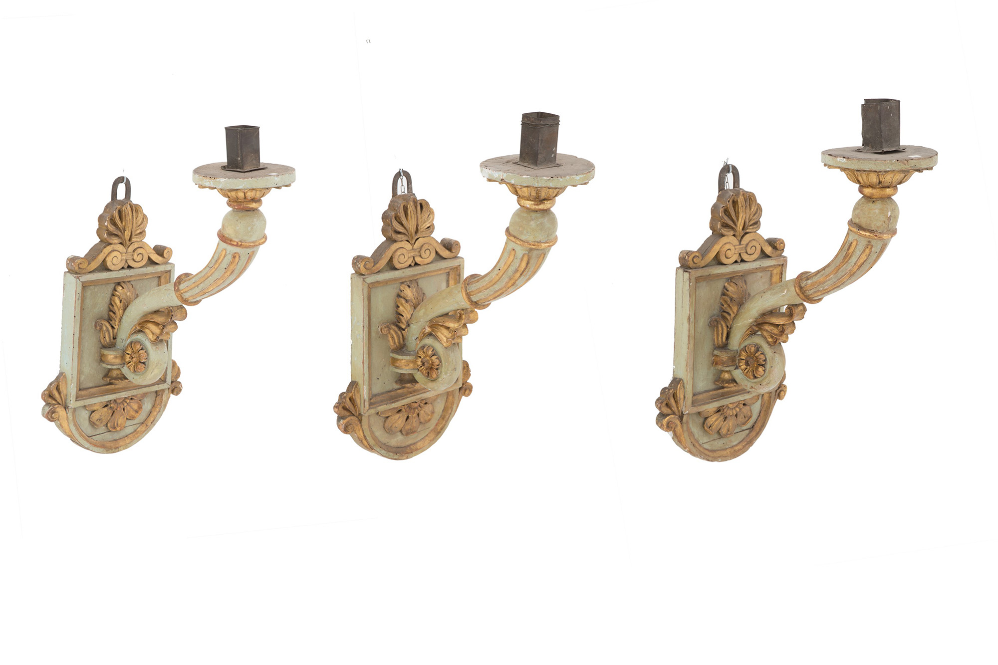Three wall arms in carved, lacquered and gilded wood. Lombardy. Louis XVI period. 70x33x45cm approx. Tre bracci da parete in legno intagliato, laccato e dorato. Lombardia. Periodo Luigi XVI. 70x33x45 cm ca.