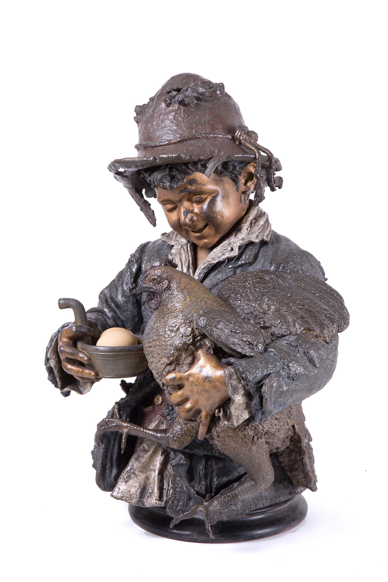 Enamelled metal sculpture depicting "FARMER WITH HEN". Early 20th century. 67x45x35cm approx. Scultura in metallo smaltato raffigurante "CONTADINO CON GALLINA". Inizi XX secolo. 67x45x35 cm ca.