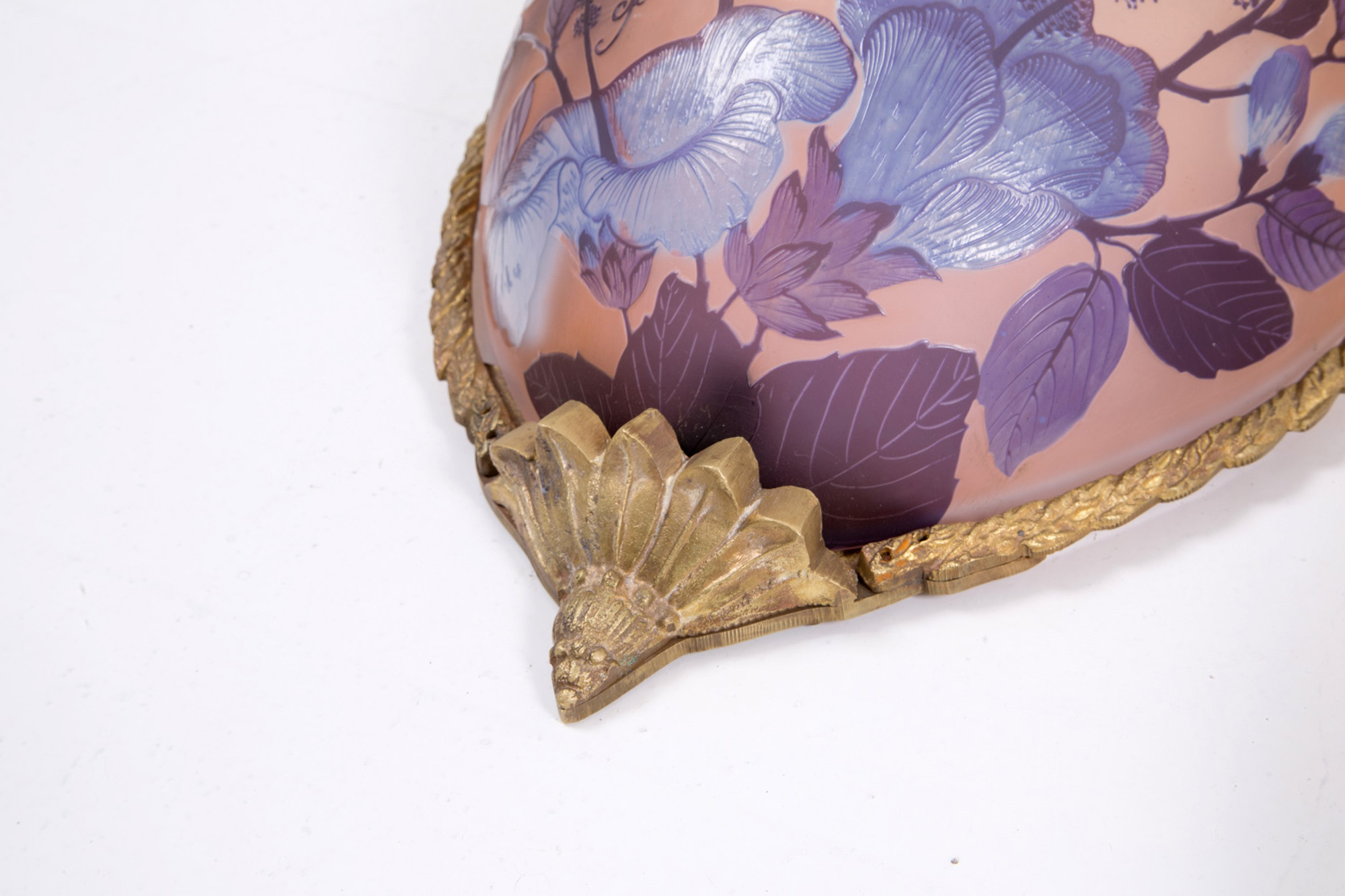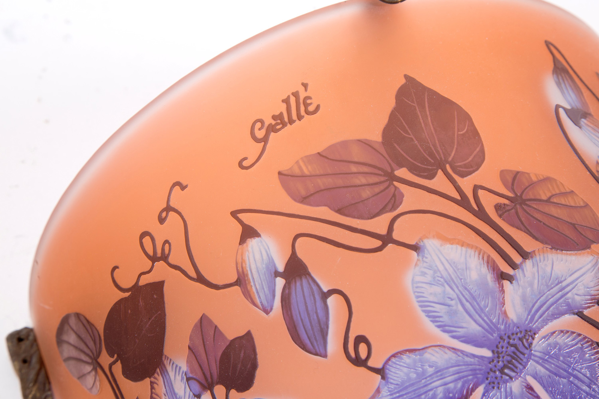 Four acid-etched glass sconces on a chiseled bronze upright. Signed "GALLE' ". 32x27x14cm approx. Quattro applique in vetro all'acido su montante in bronzo cesellato. Firmate "GALLE' ". 32x27x14 cm ca.
