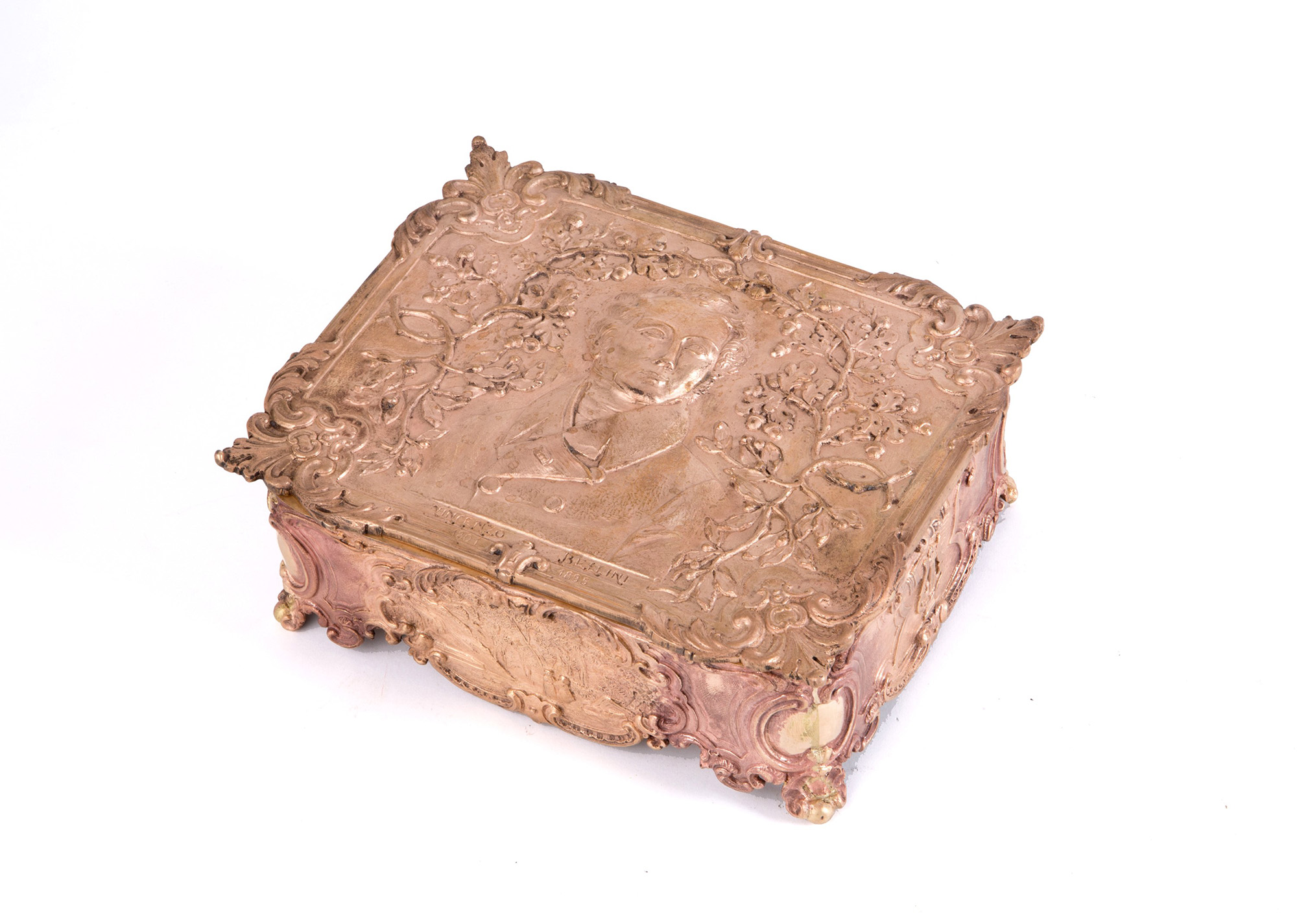Chiseled bronze box depicting "PORTRAIT OF VINCENZO BELLINI". 8x24x18.5cm approx. Cofanetto in bronzo cesellato raffigurante "RITRATTO DI VINCENZO BELLINI". 8x24x18,5 cm ca.