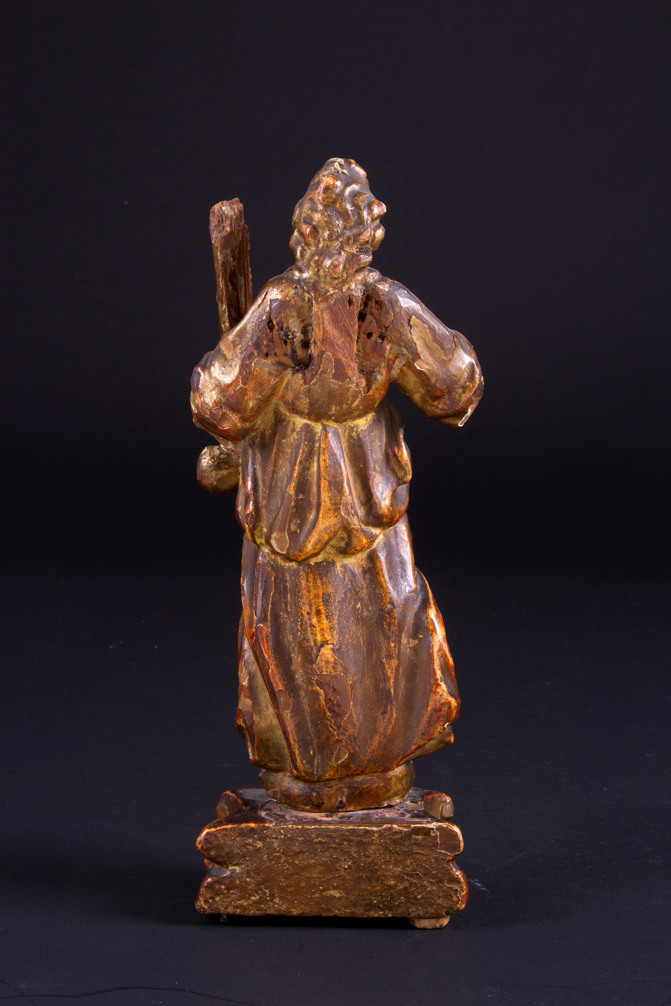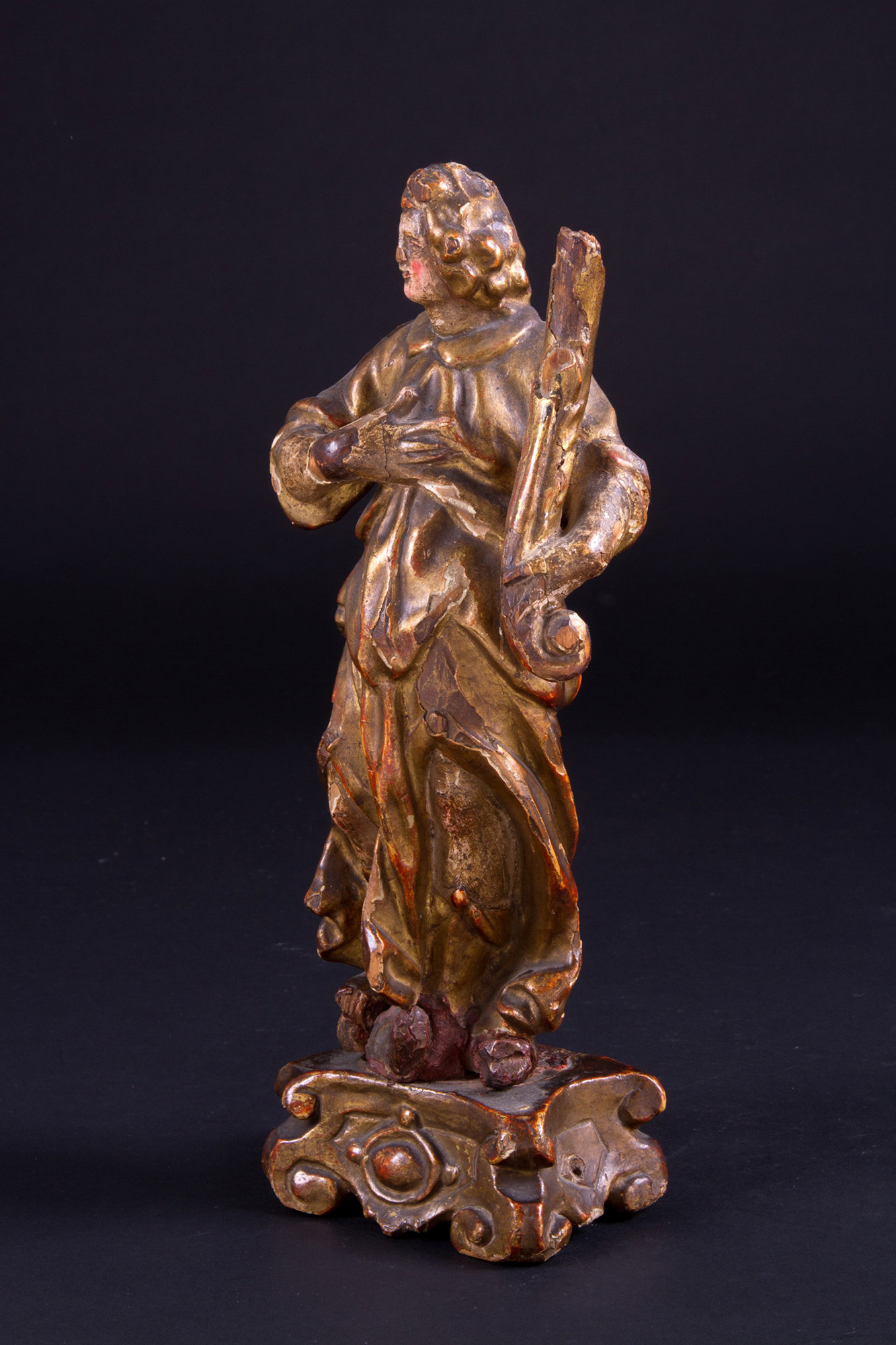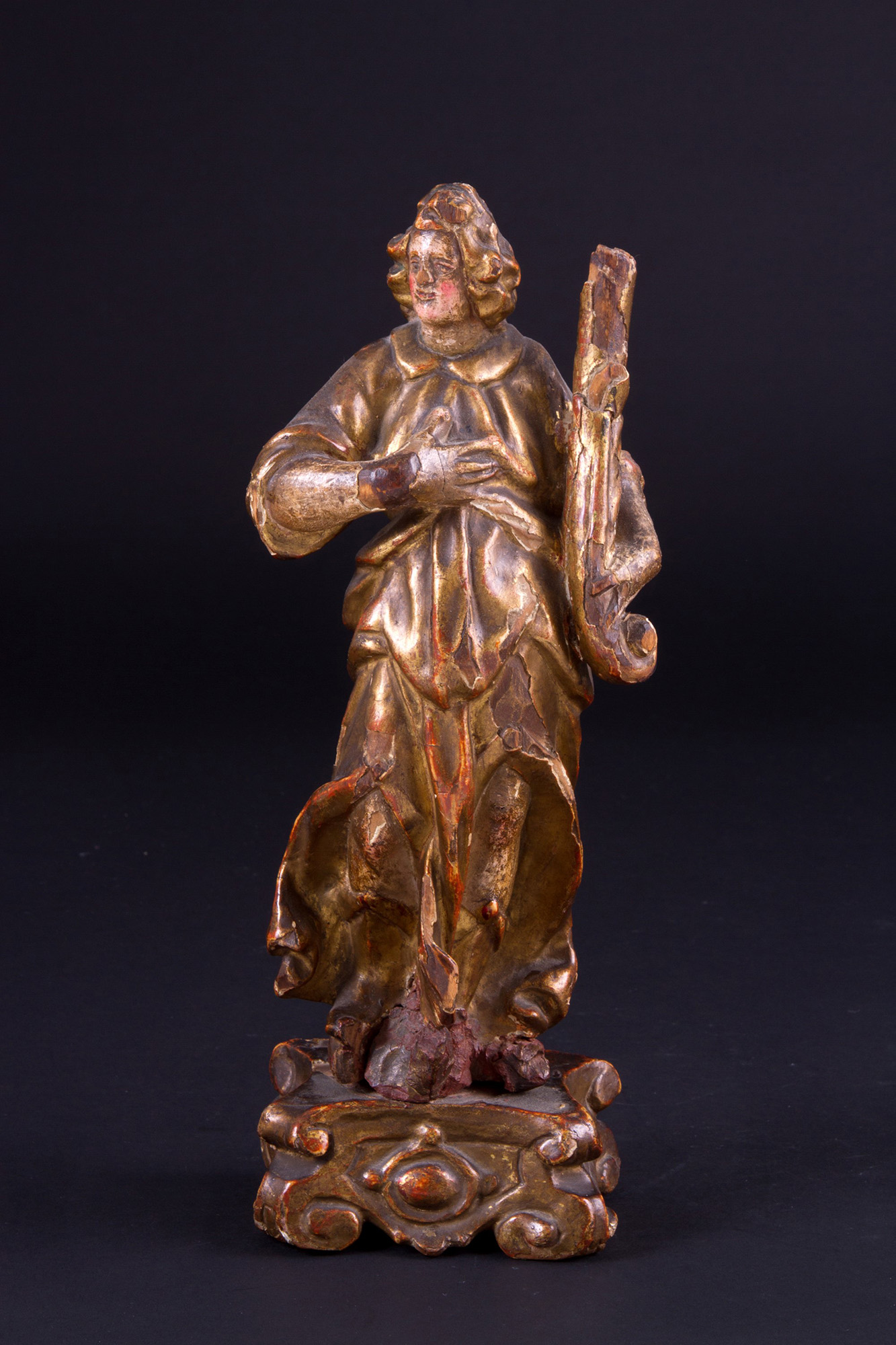 Carved and gilded wooden sculpture depicting "FIGURE WITH CORNUCOPIA". Venetian. Late 17th century. Defects. 29x10x8cm approx. Scultura in legno intagliato e dorato raffigurante "FIGURA CON CORNUCOPIA". Veneto. Fine XVII secolo. Difetti. 29x10x8 cm ca.