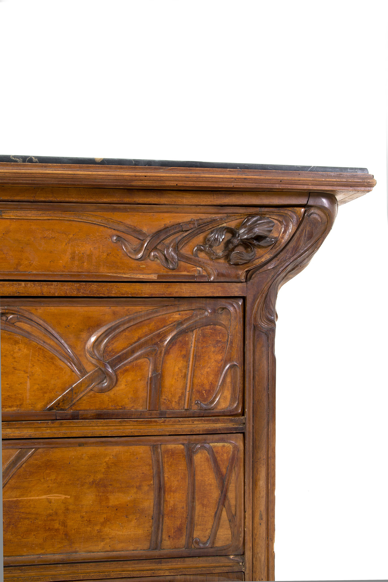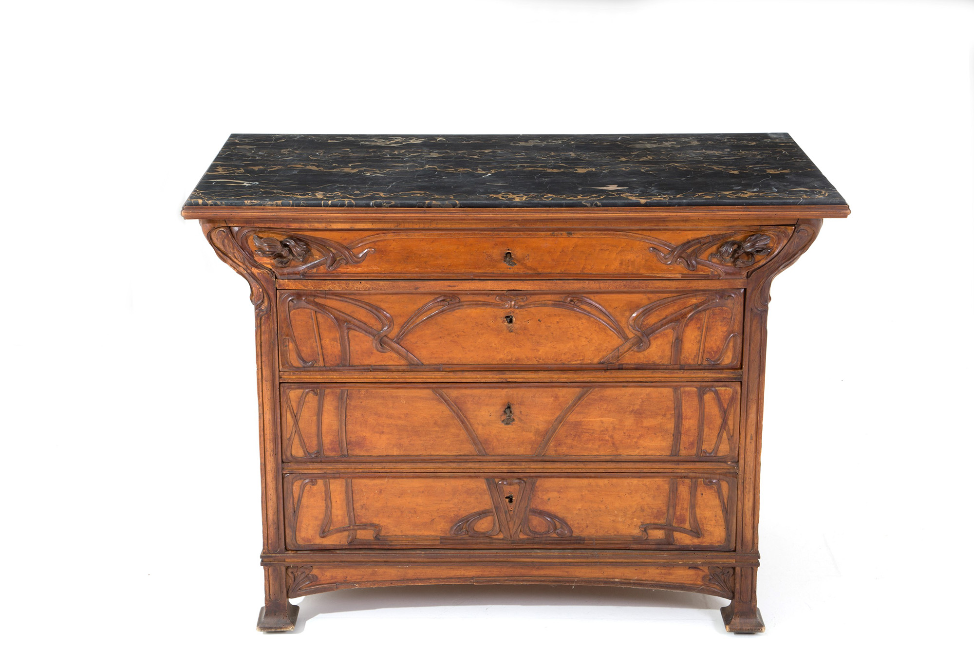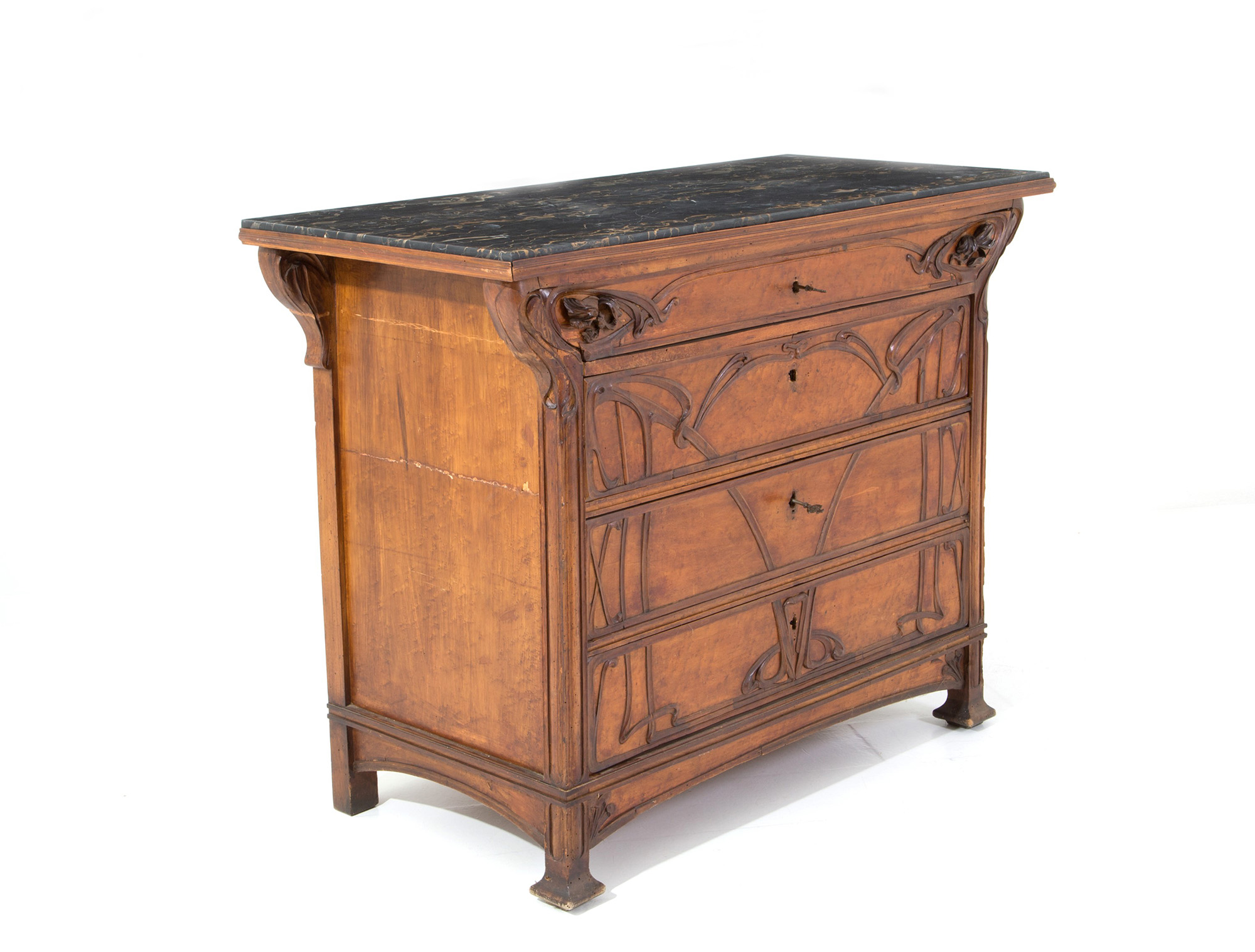 Finely carved chest of drawers with black marble top. Liberty period. 96x130x58cm approx. Comò finemente intagliato con piano in marmo nero. Periodo Liberty. 96x130x58 cm ca.