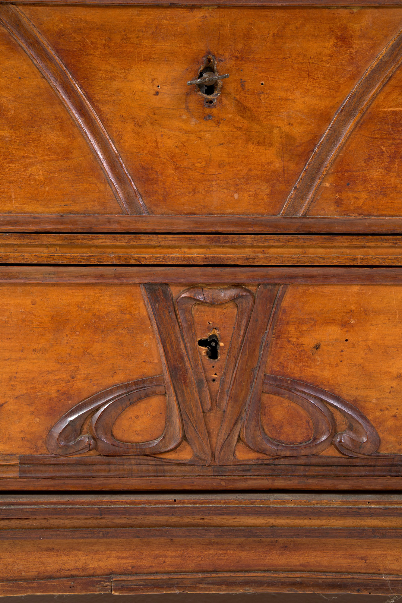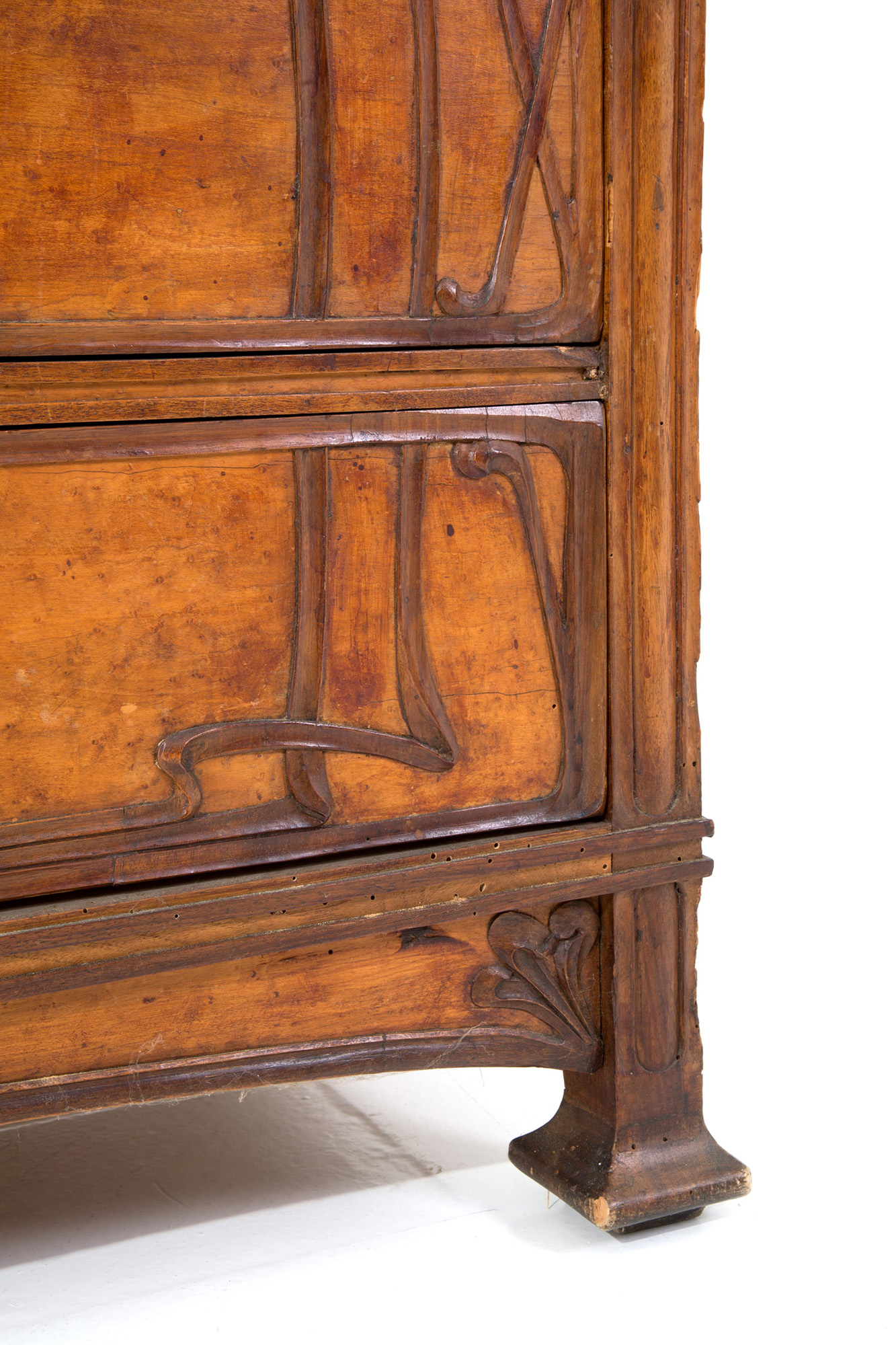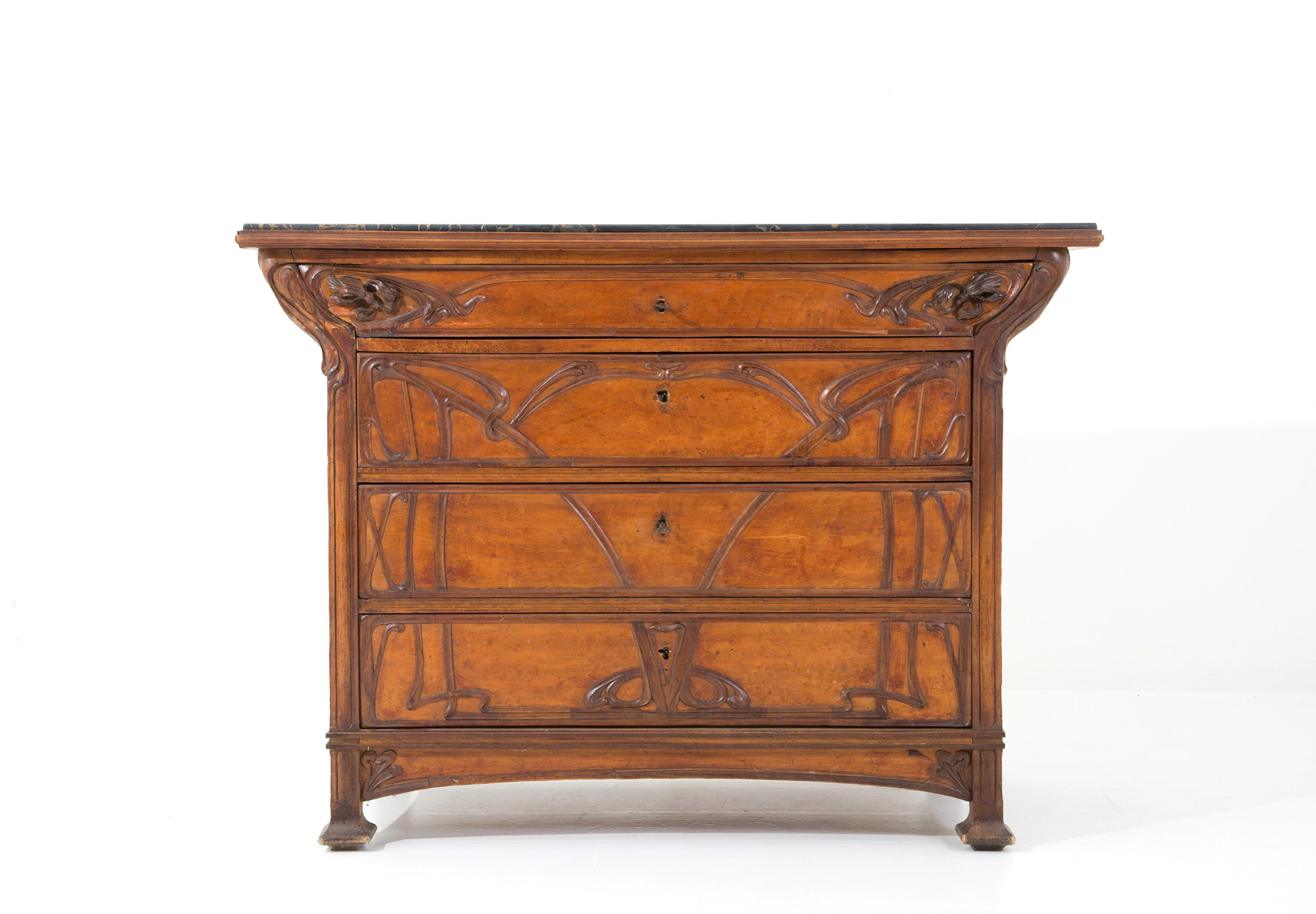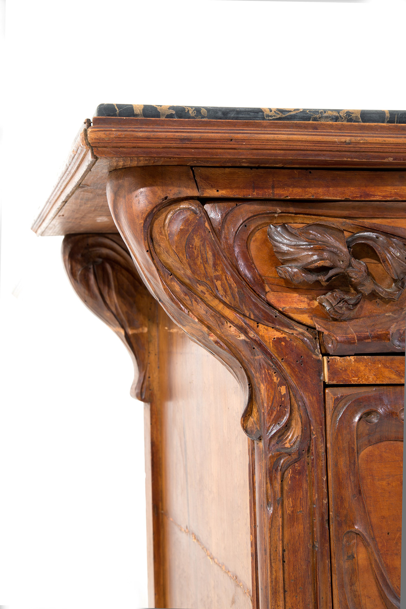 Finely carved chest of drawers with black marble top. Liberty period. 96x130x58cm approx. Comò finemente intagliato con piano in marmo nero. Periodo Liberty. 96x130x58 cm ca.