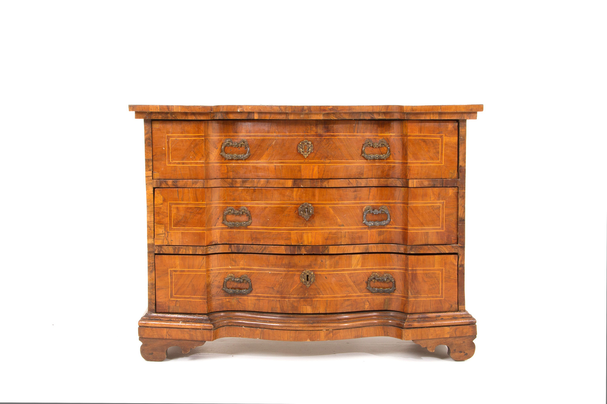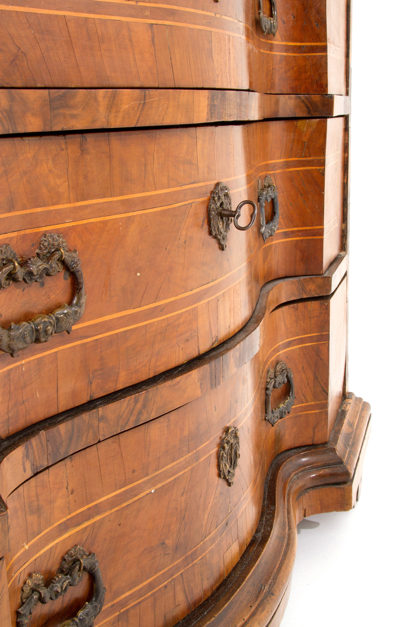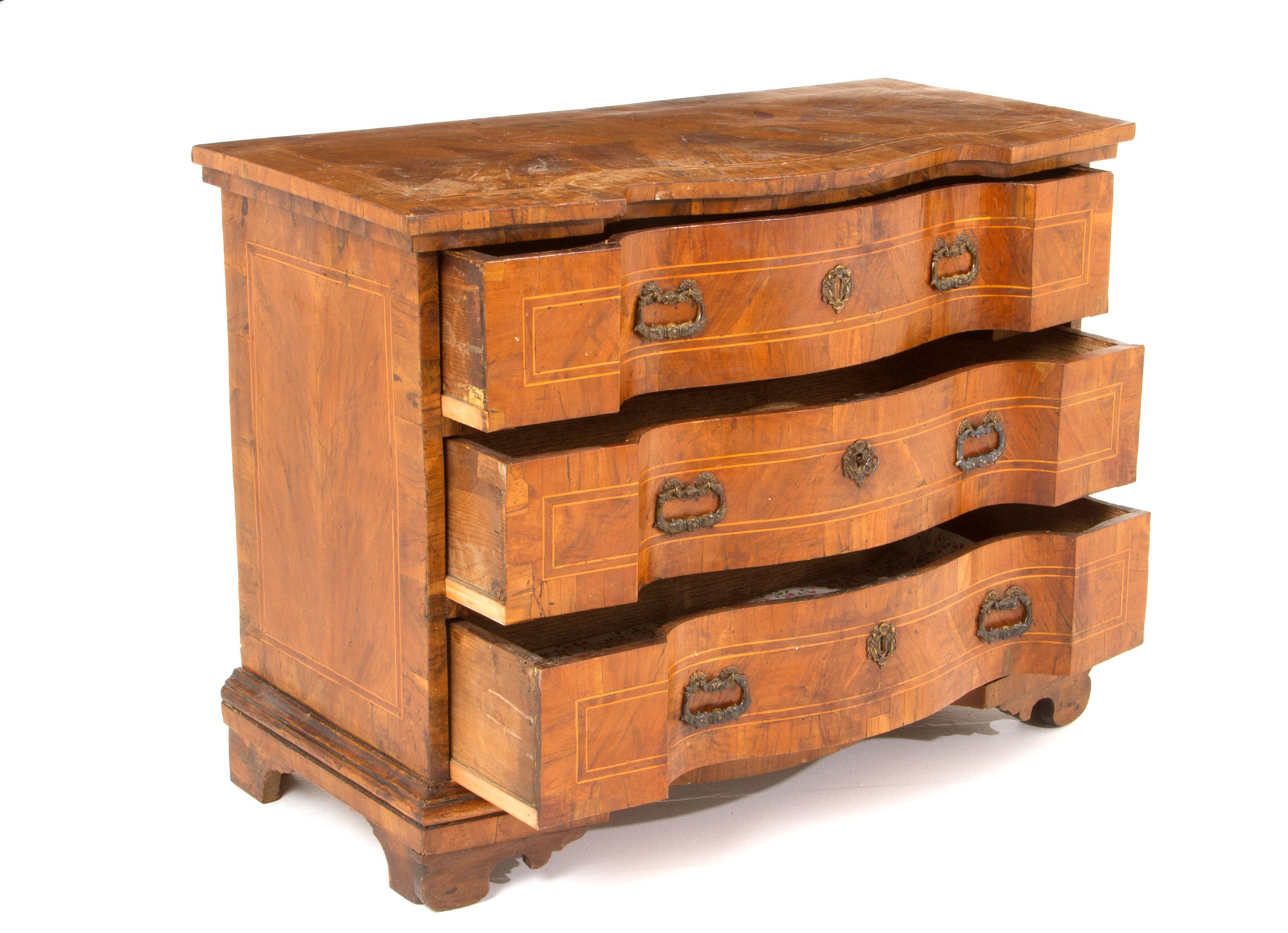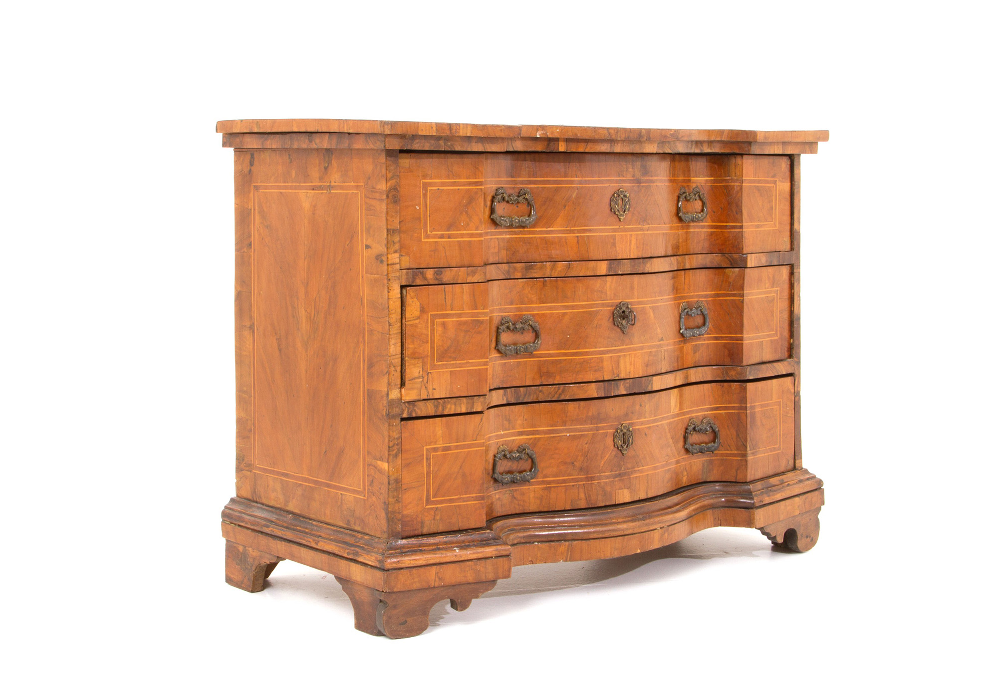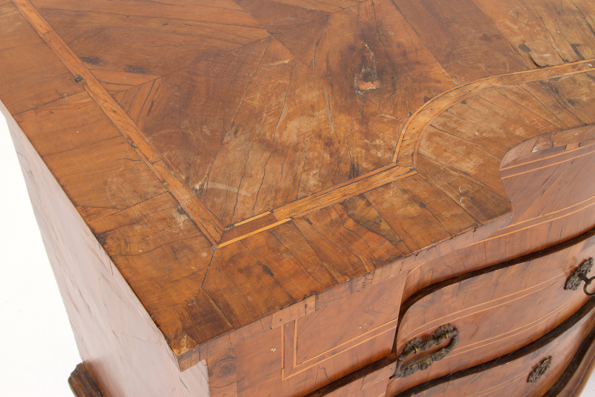 Double move chest of drawers on the front in inlaid wood, veneered in briar and threaded. Veneto. 18th century. Defects. 85x115x54cm approx. Comò doppia mossa sul fronte in legno intarsiato, lastronato in radica e filettato. Veneto. XVIII secolo. Difetti. 85x115x54 cm ca.