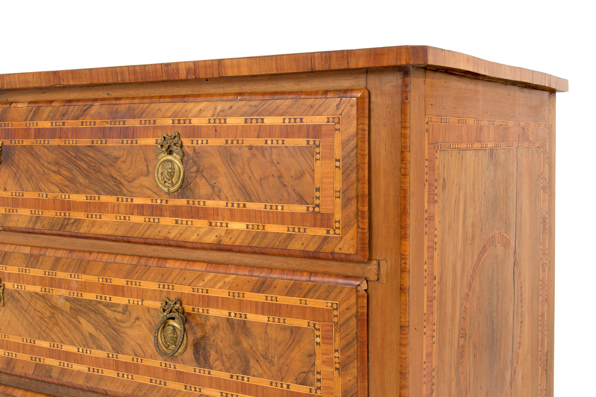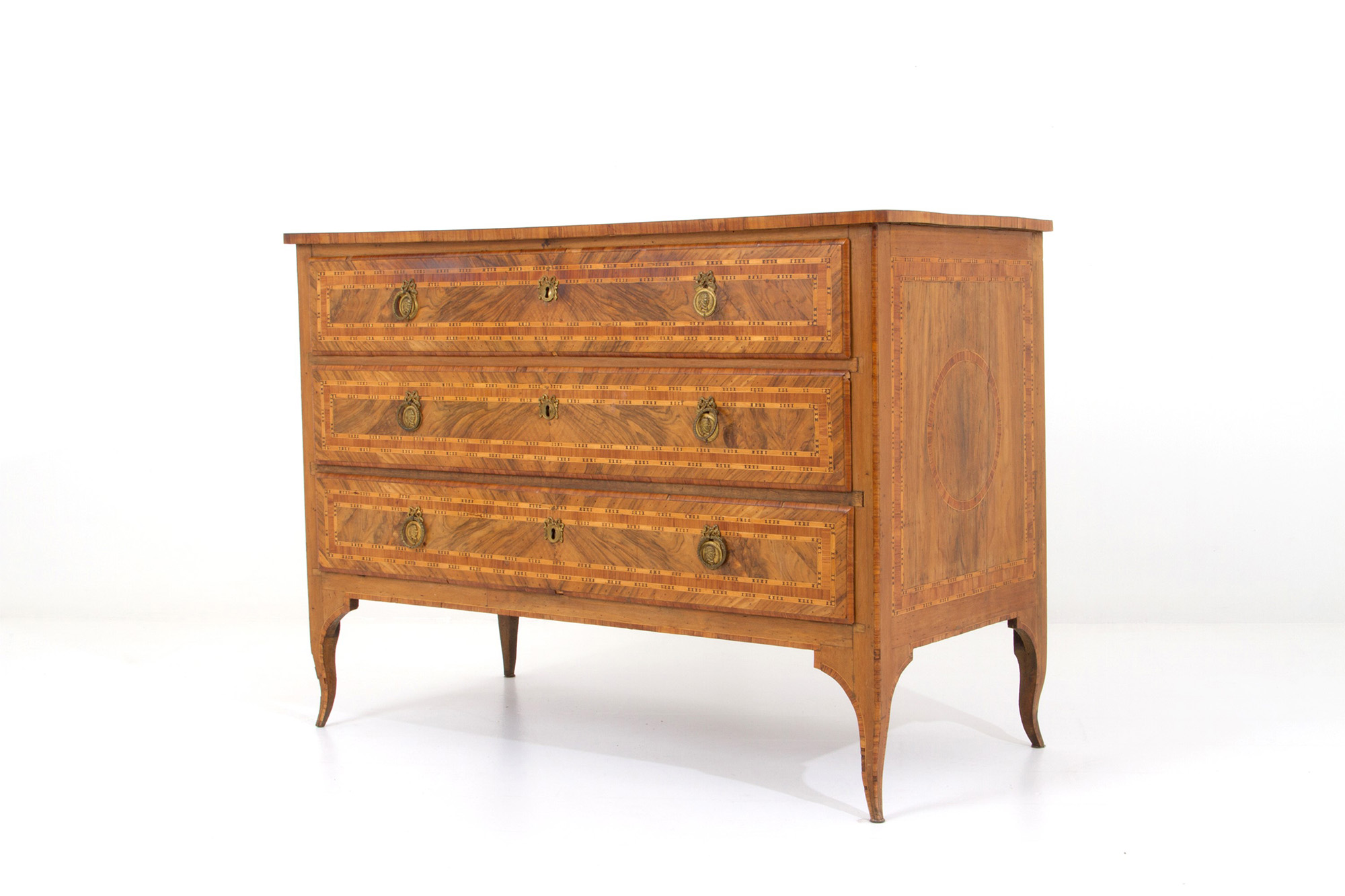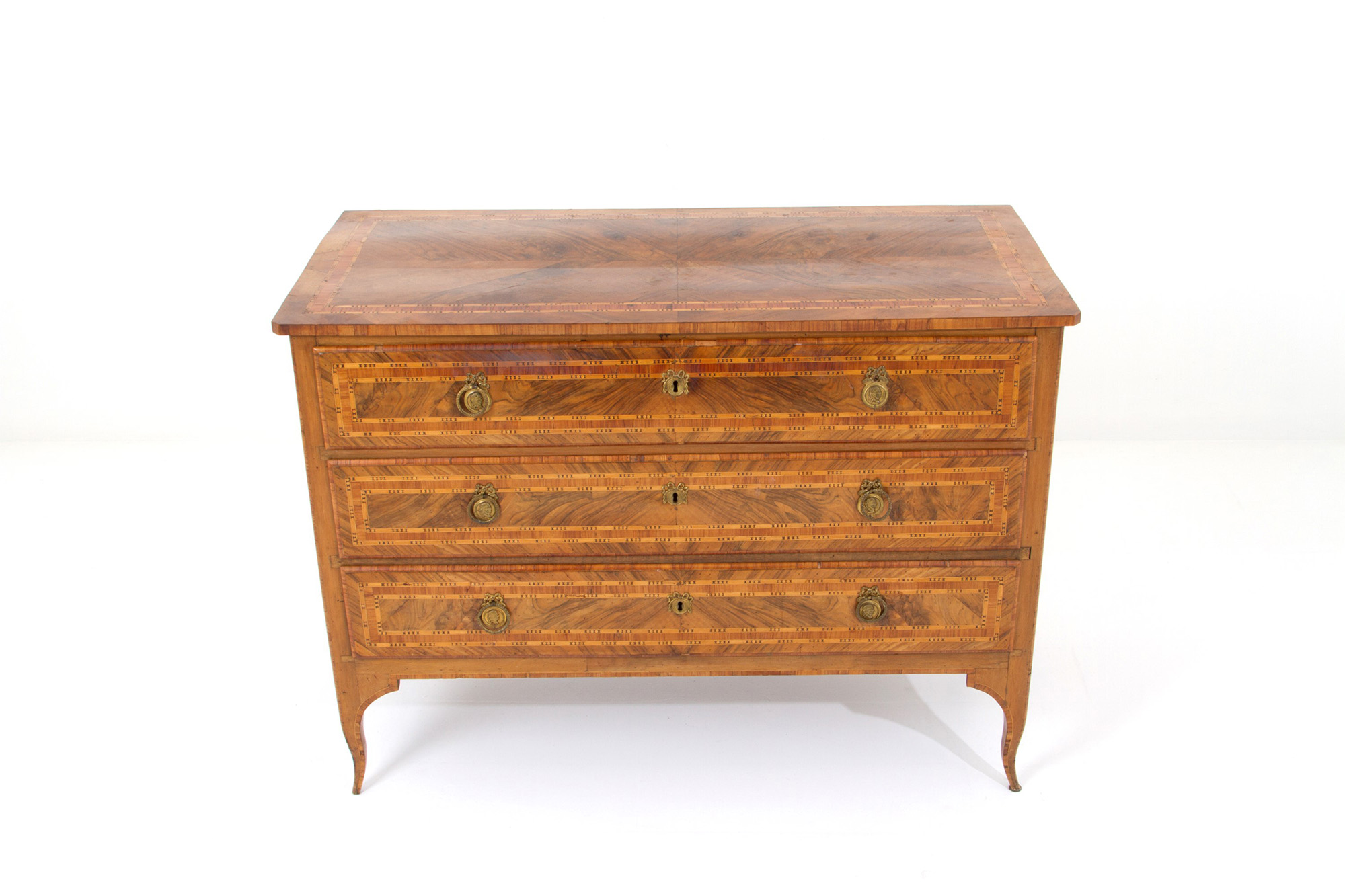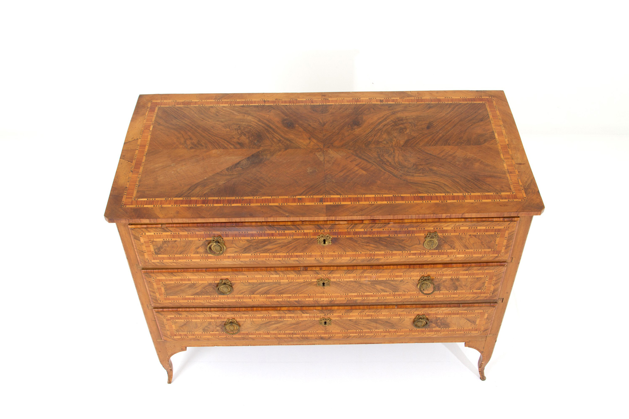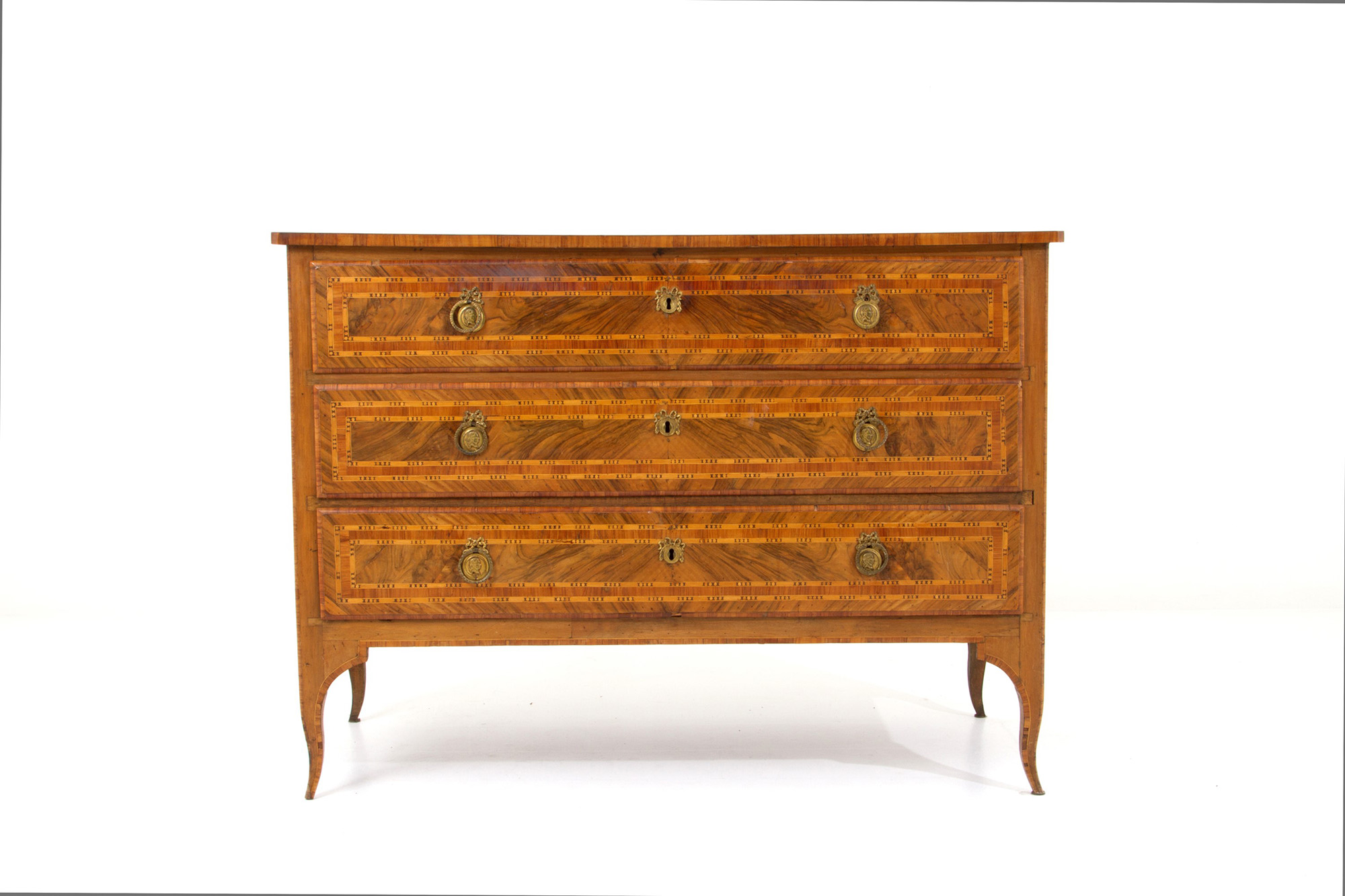 Veneered and threaded chest of drawers in various woods. Northern Italy. Late 18th century. 89x123x59cm approx. Comò lastronato e filettato in legni vari. Italia settentrionale. Fine XVIII secolo. 89x123x59 cm ca.