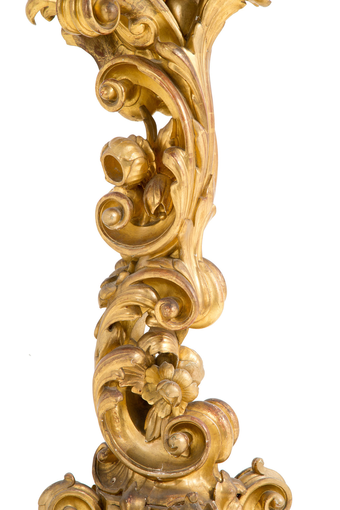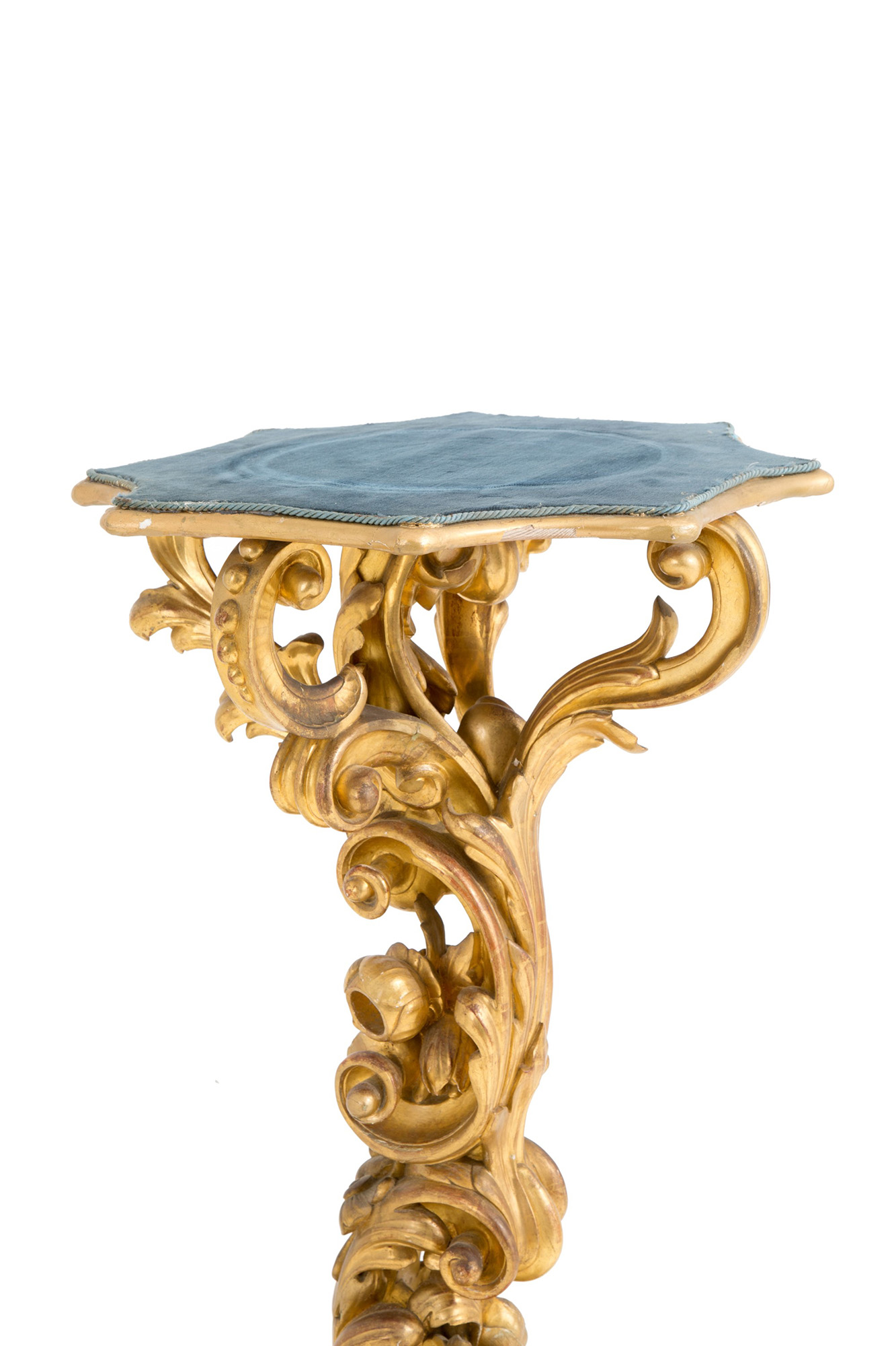Gueridon in finely carved and gilded wood with rocaille motifs, with masked feet. Tuscany. 18th century. 113x60x60cm approx. Gueridon in legno finemente intagliato e dorato a motivi rocaille, con piedi a mascheroni. Toscana. XVIII secolo. 113x60x60 cm ca.