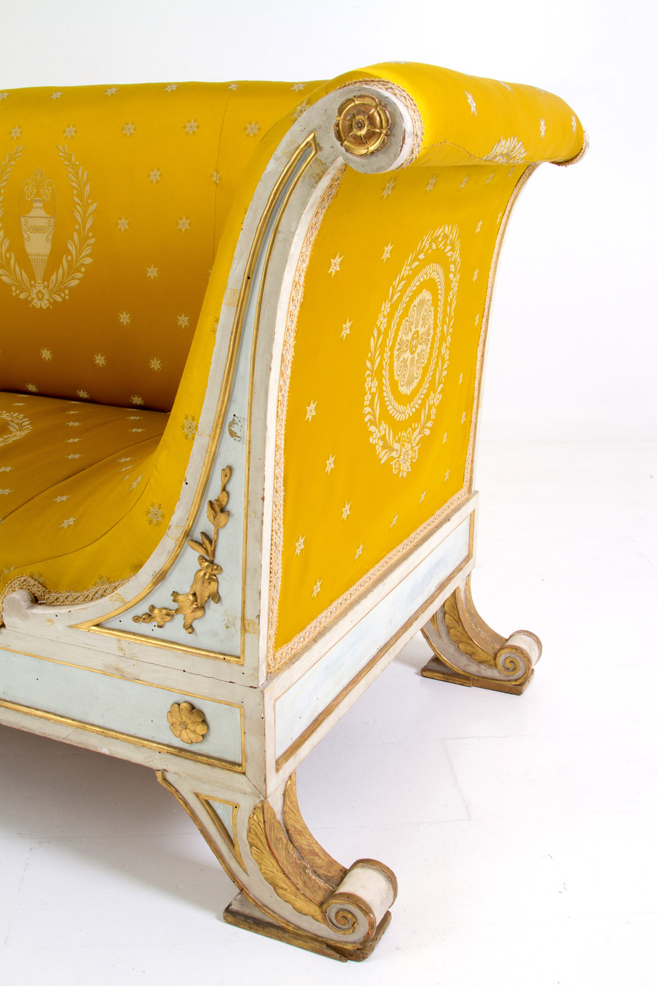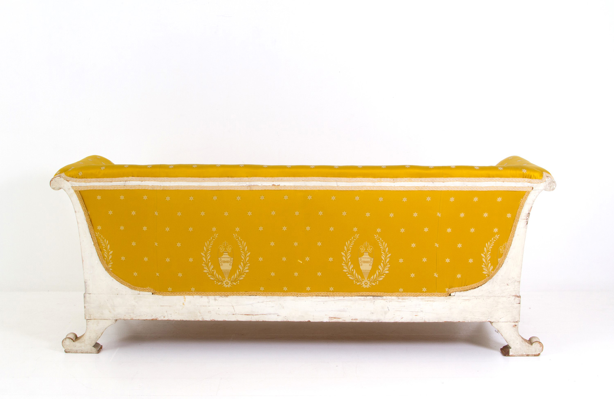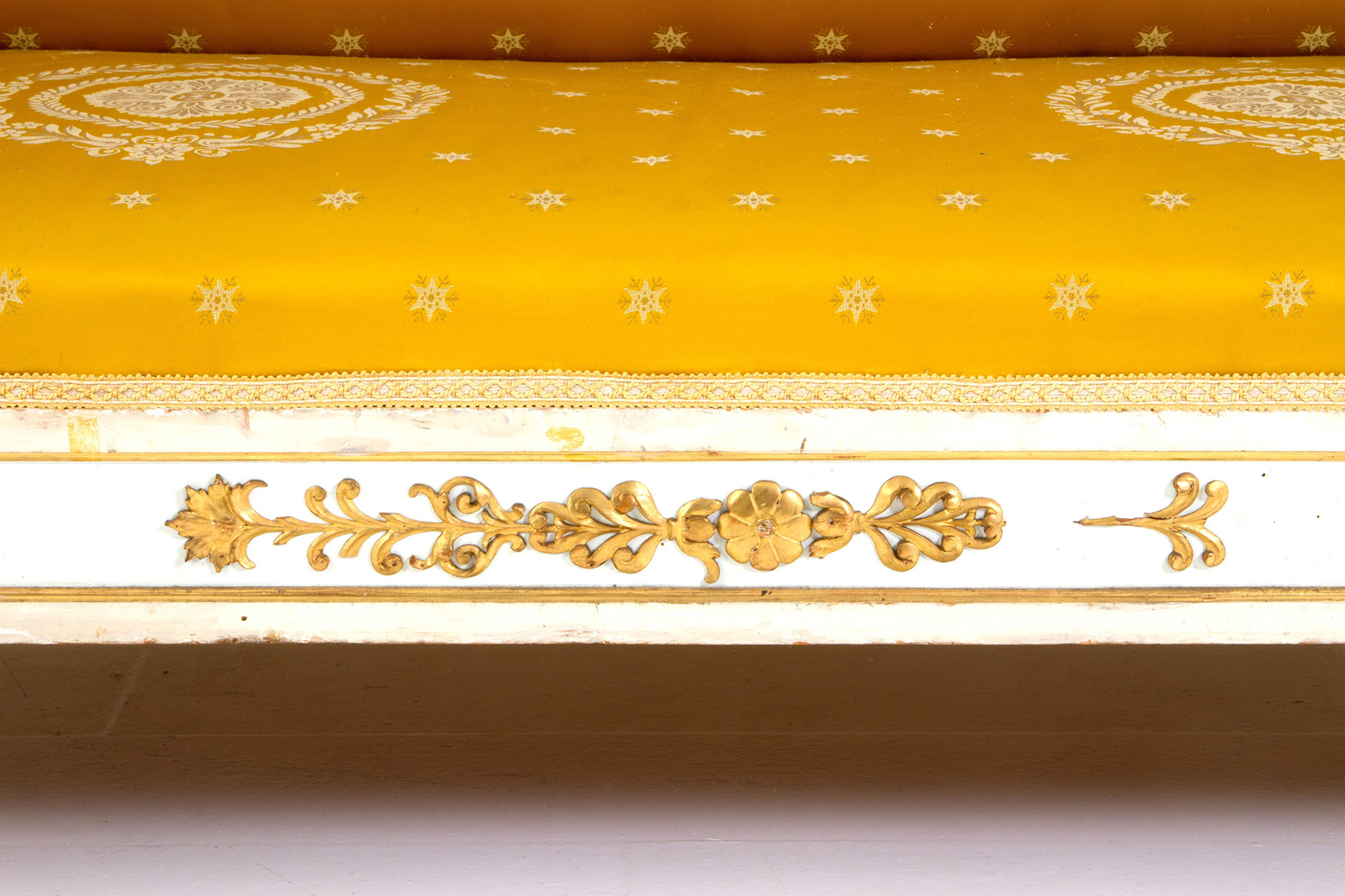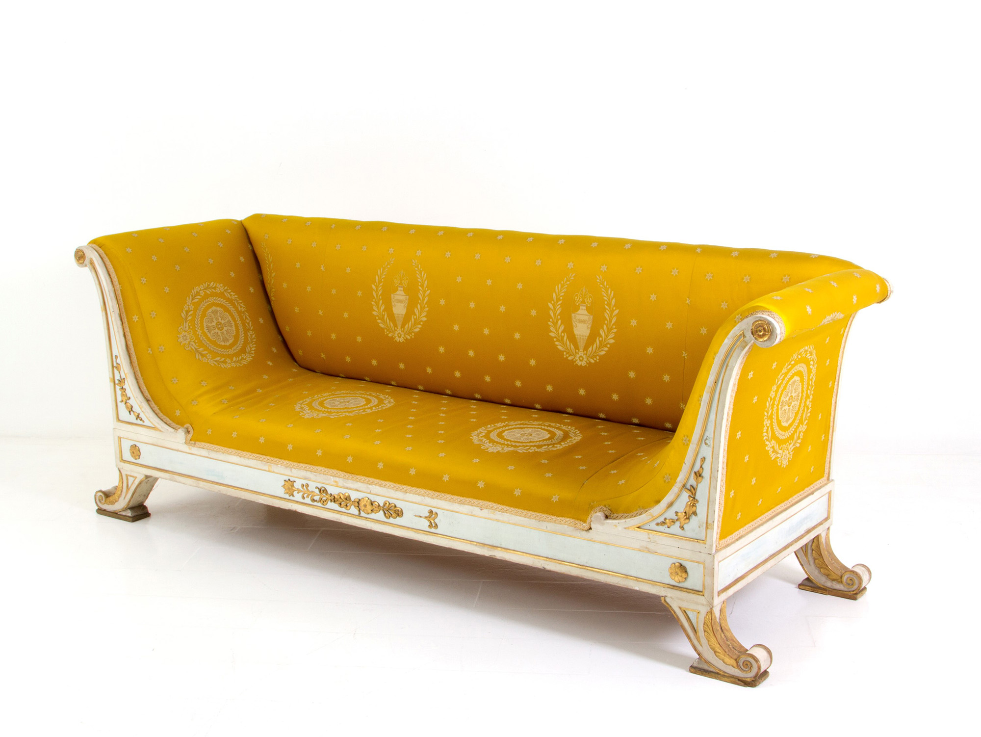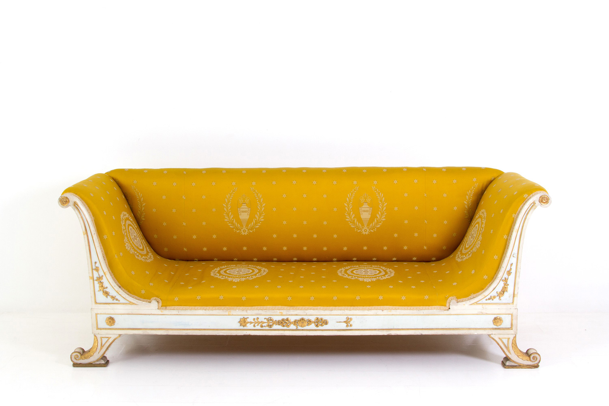 Corbeille sofa in lacquered and gilded wood covered in satin. Empire period. Defects. 88x225x72cm approx. Divano a corbeille in legno laccato e dorato rivestito in raso. Periodo Impero. Difetti. 88x225x72 cm ca.