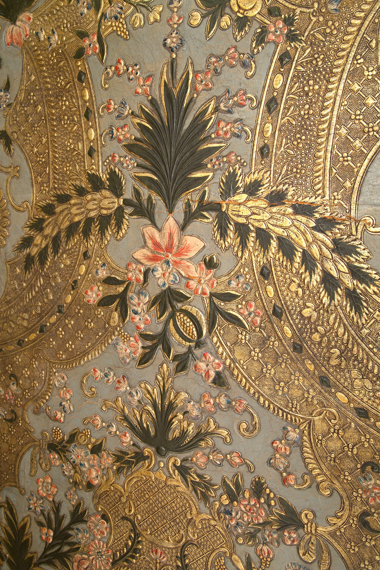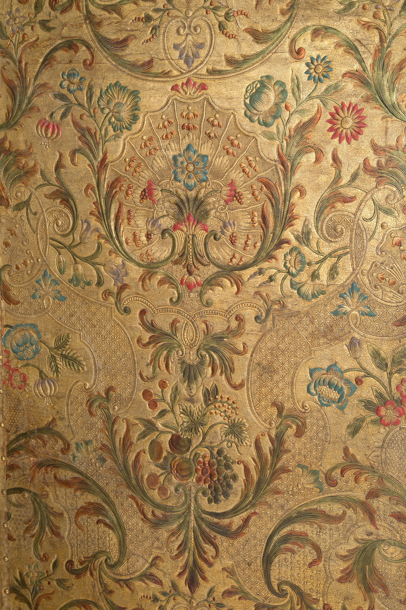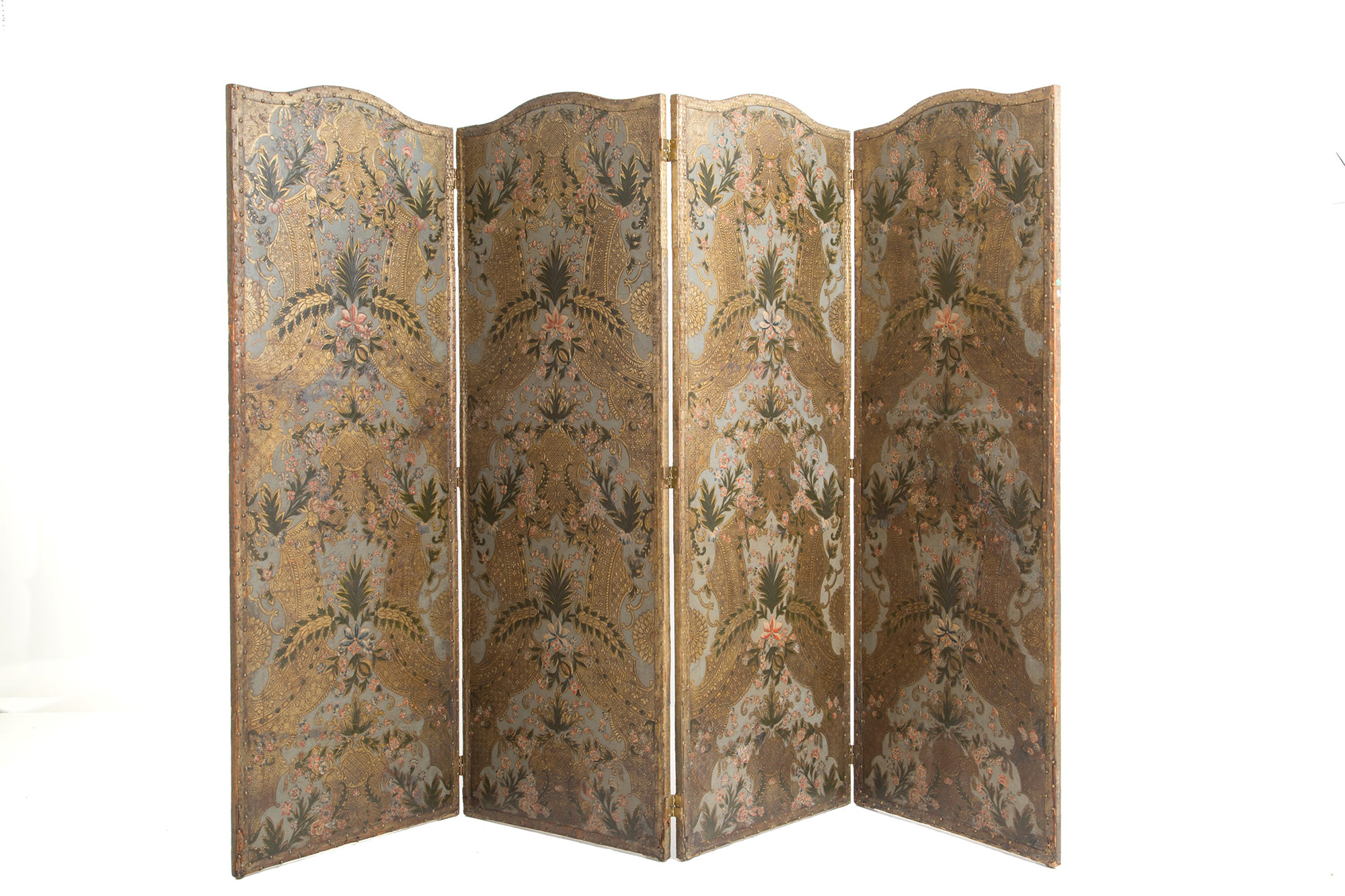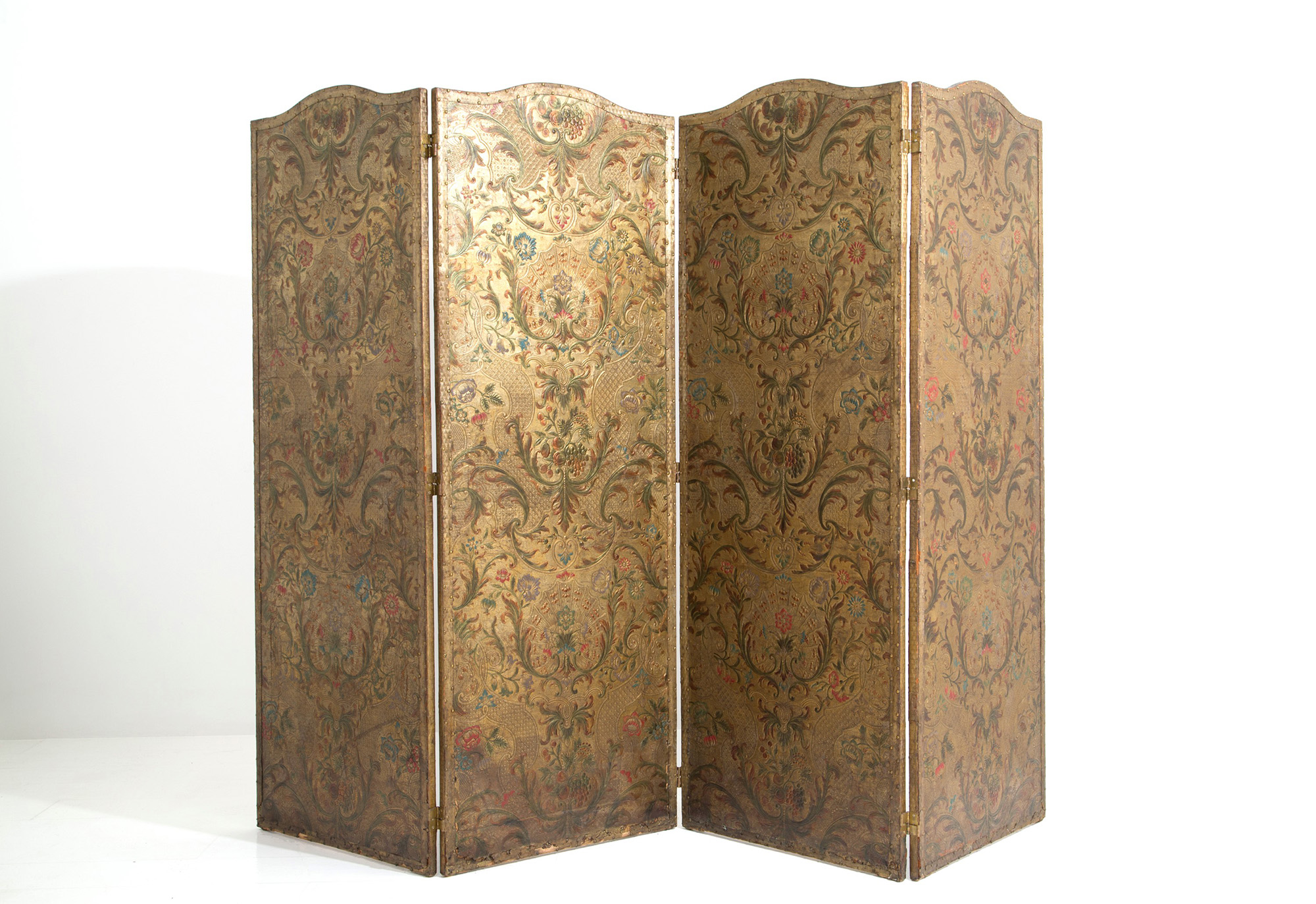 Four-fold screen in embossed leather with floral motifs on both sides. Late 18th century. 190x260x3cm approx. Paravento a quattro ante in cuoio stampato a rilievo a motivi floreali su entrambi i lati. Fine XVIII secolo. 190x260x3 cm ca.