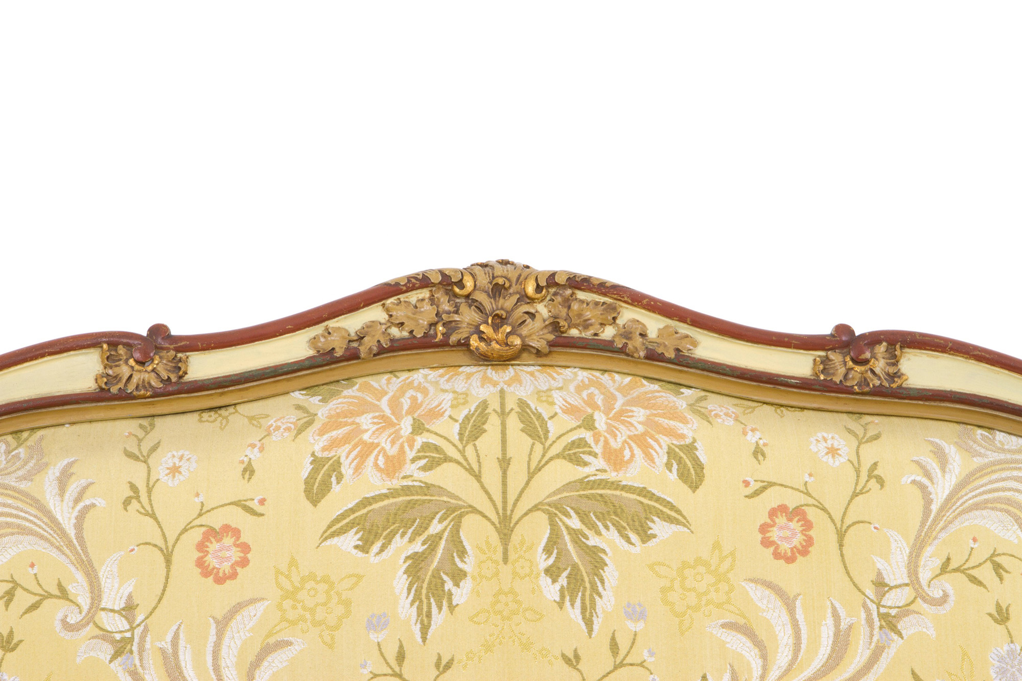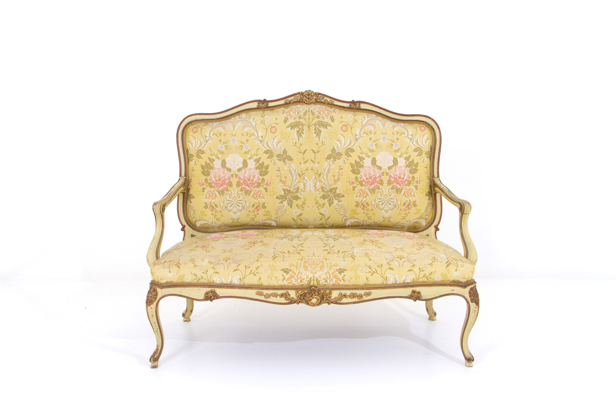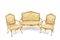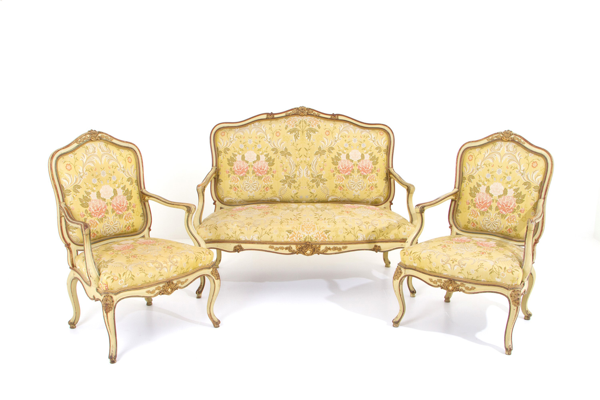 Living room composed of a sofa and two armchairs in lacquered and gilded wood. Late 19th century. Salotto composto da un divano e due poltrone in legno laccato e dorato. Fine XIX secolo.