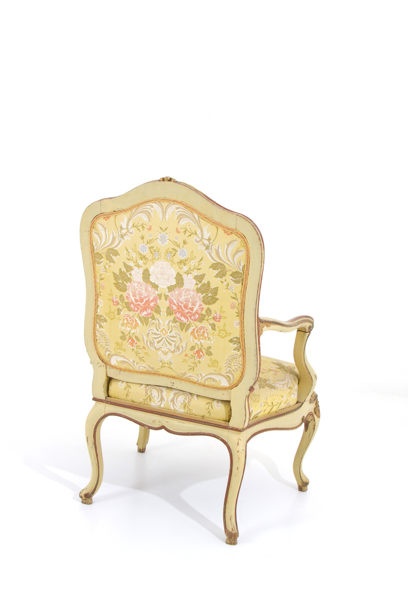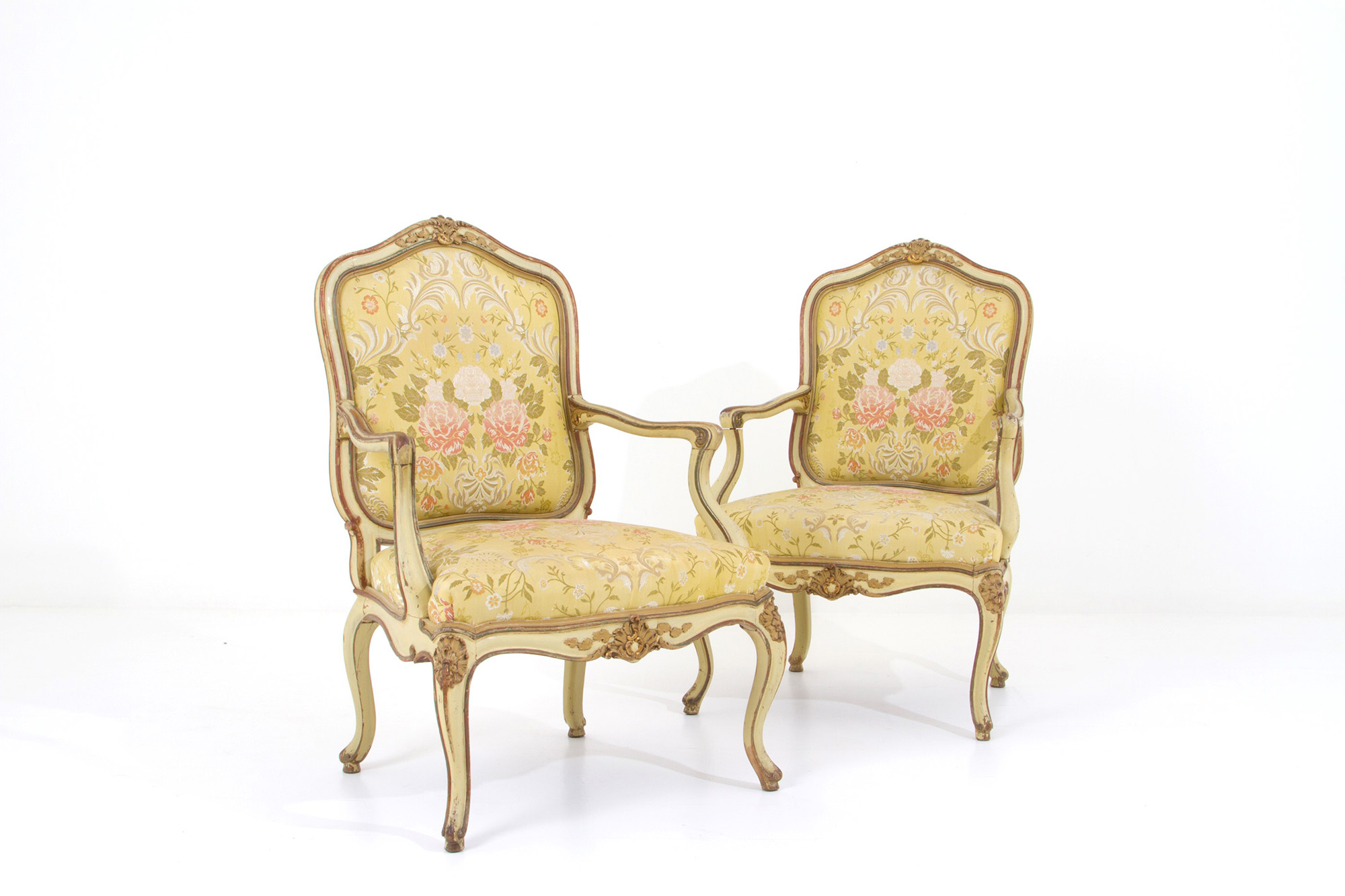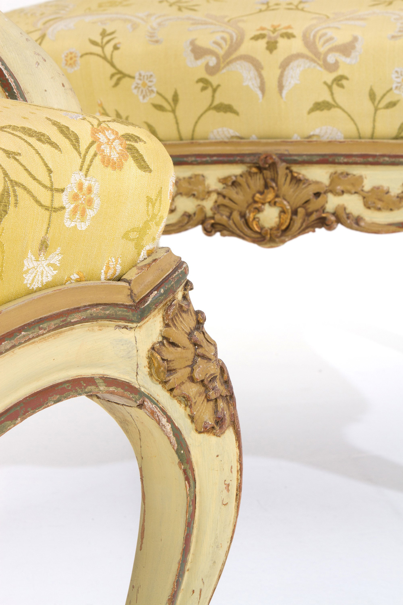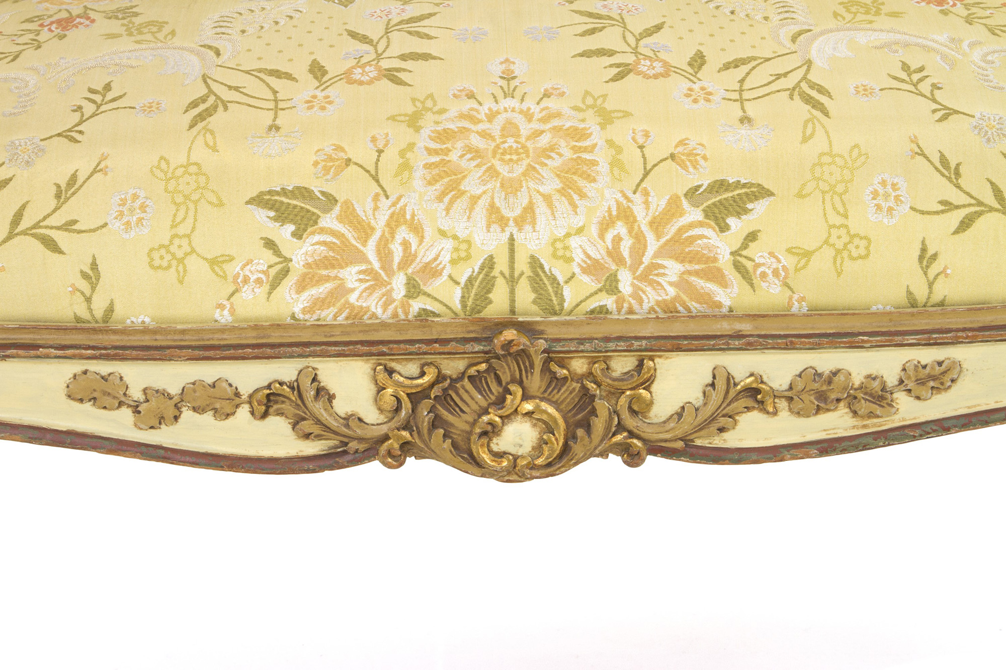 Living room composed of a sofa and two armchairs in lacquered and gilded wood. Late 19th century. Salotto composto da un divano e due poltrone in legno laccato e dorato. Fine XIX secolo.