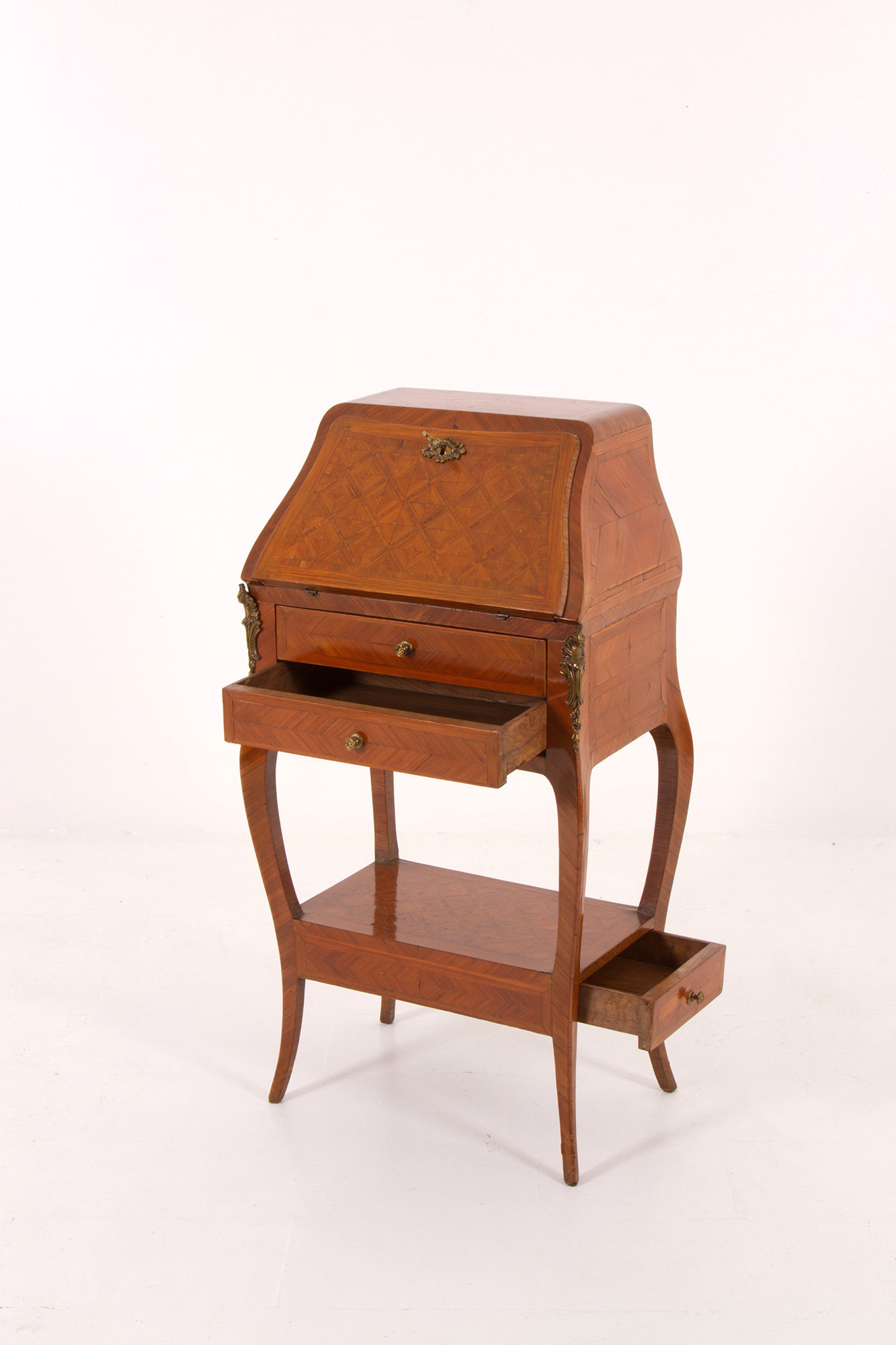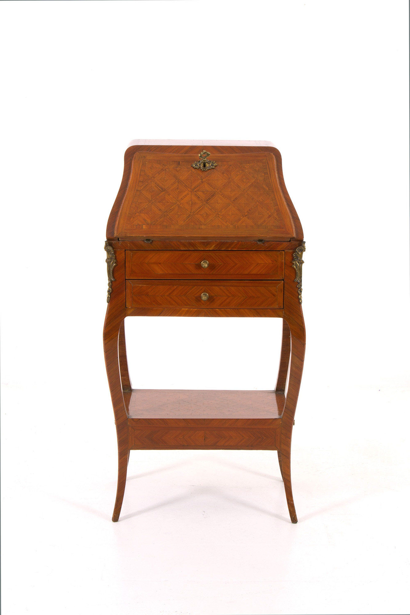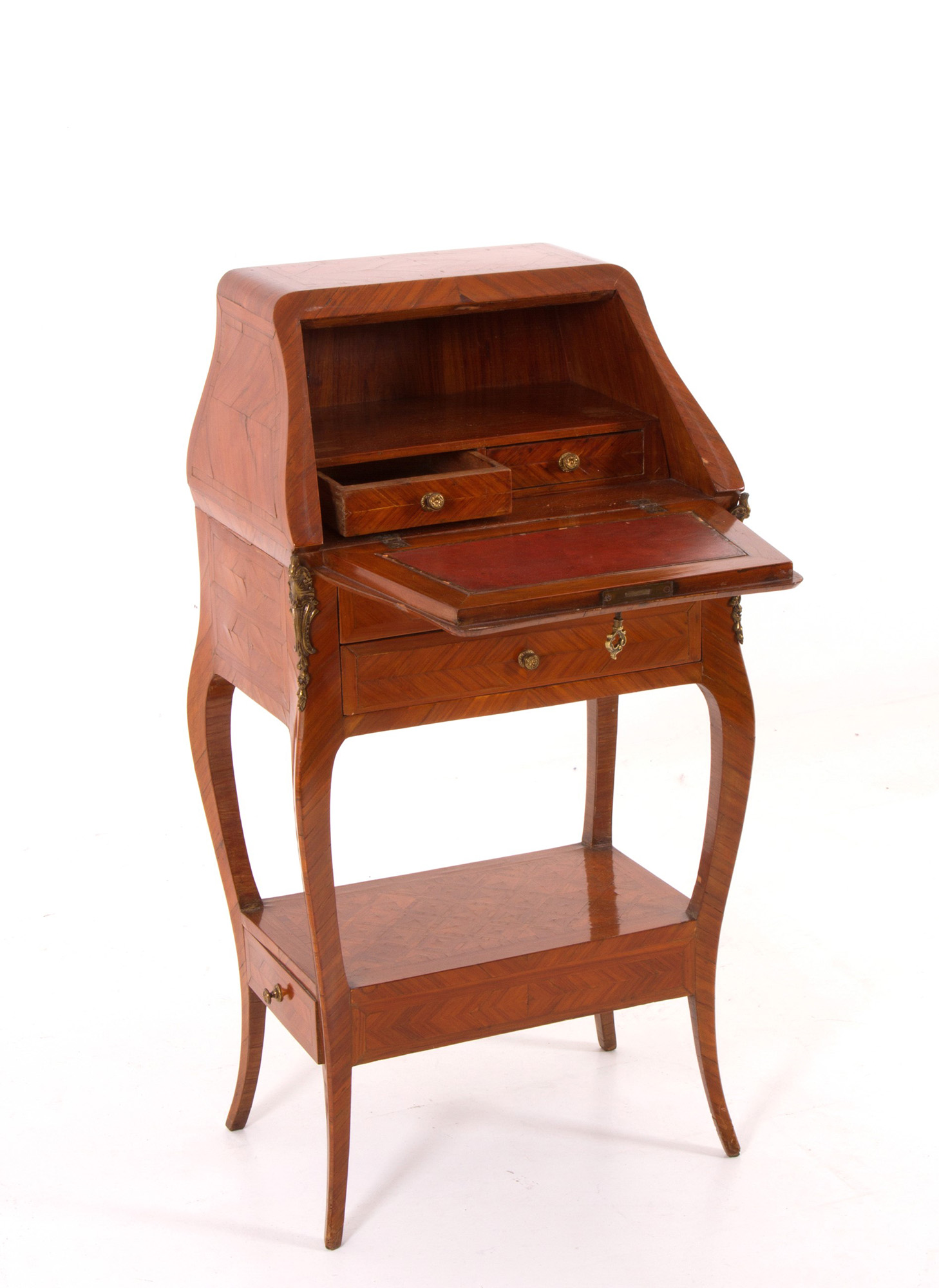 Small writing desk in bois de rose inlaid with marquetterie and with gilded bronze trimmings. Early 20th century. 94x48x30cm approx. Scrittoietto da camera in bois de rose intarsiato a marqueterie e con guarnizioni in bronzo dorato. Inizi XX secolo. 94x48x30 cm ca.