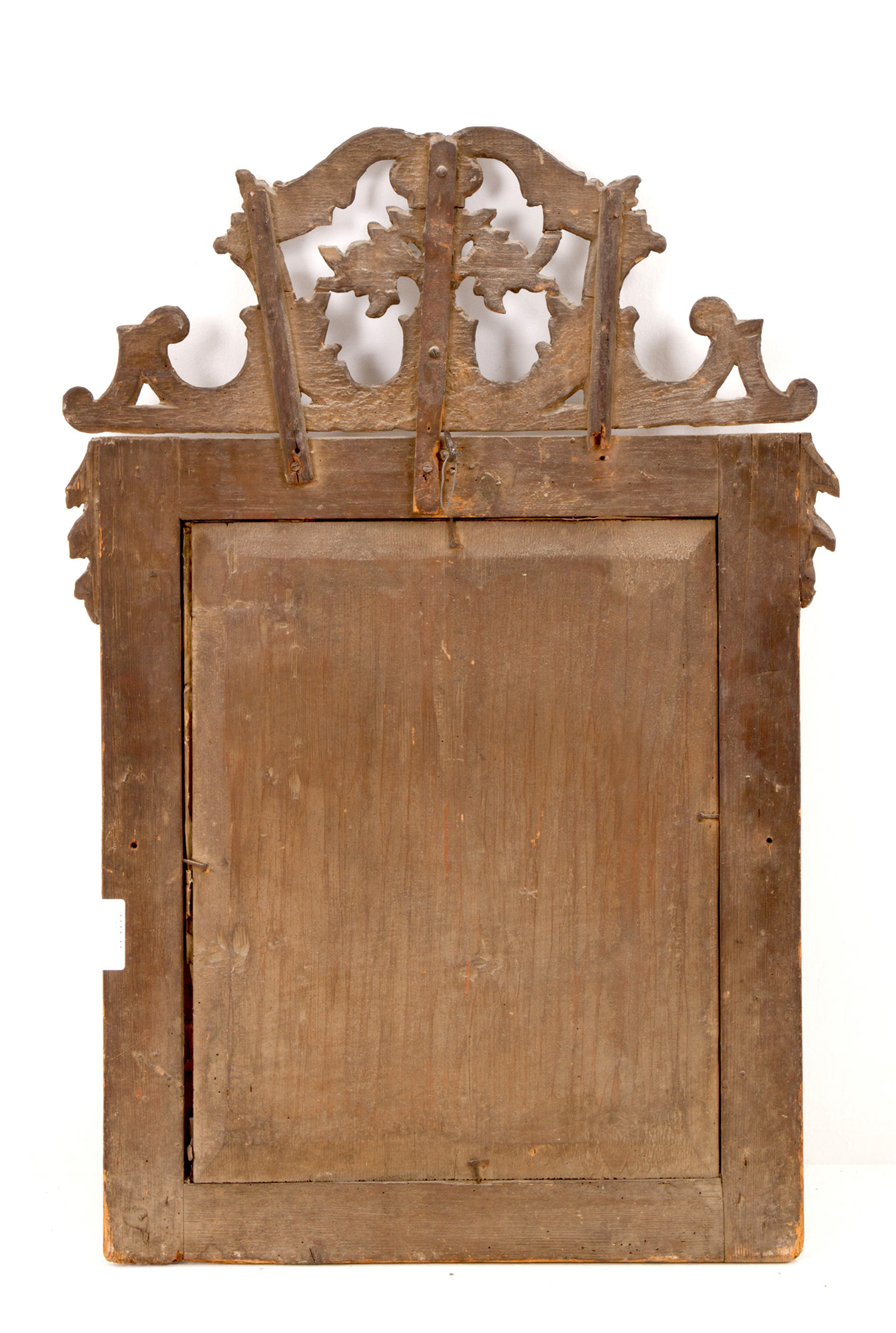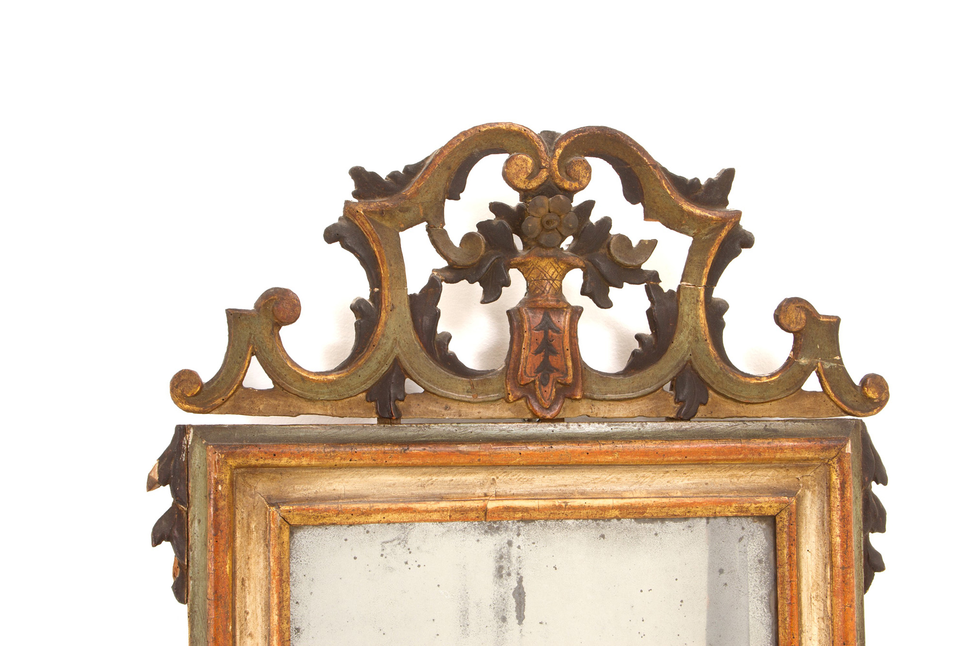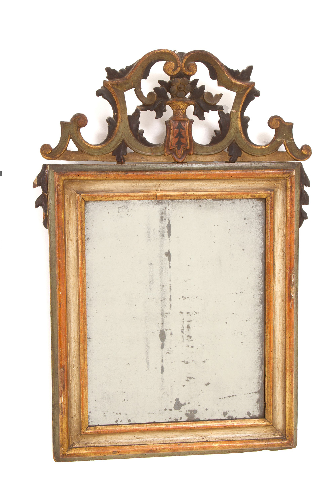 Mirror with frieze in lacquered wood with mercury mirror. 18th century. Slight flaws. 92x64cm approx. Specchiera con cimasa in legno laccato con specchio al mercurio. XVIII secolo. Lievi difetti. 92x64 cm ca.