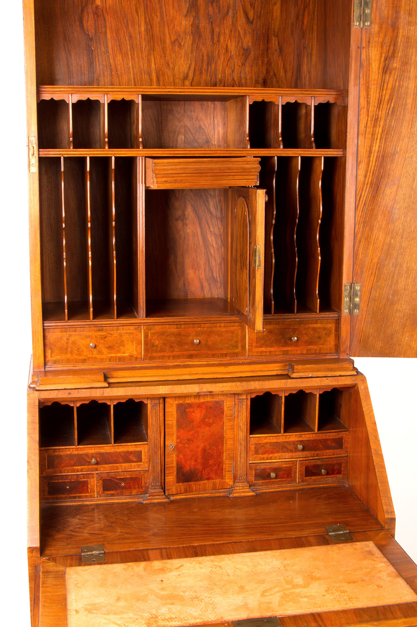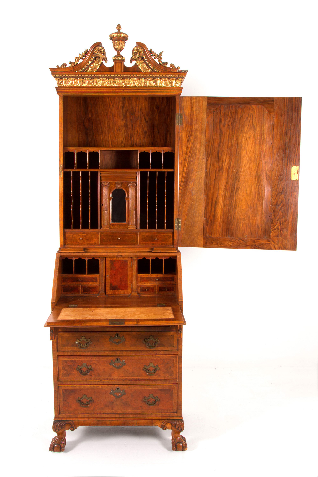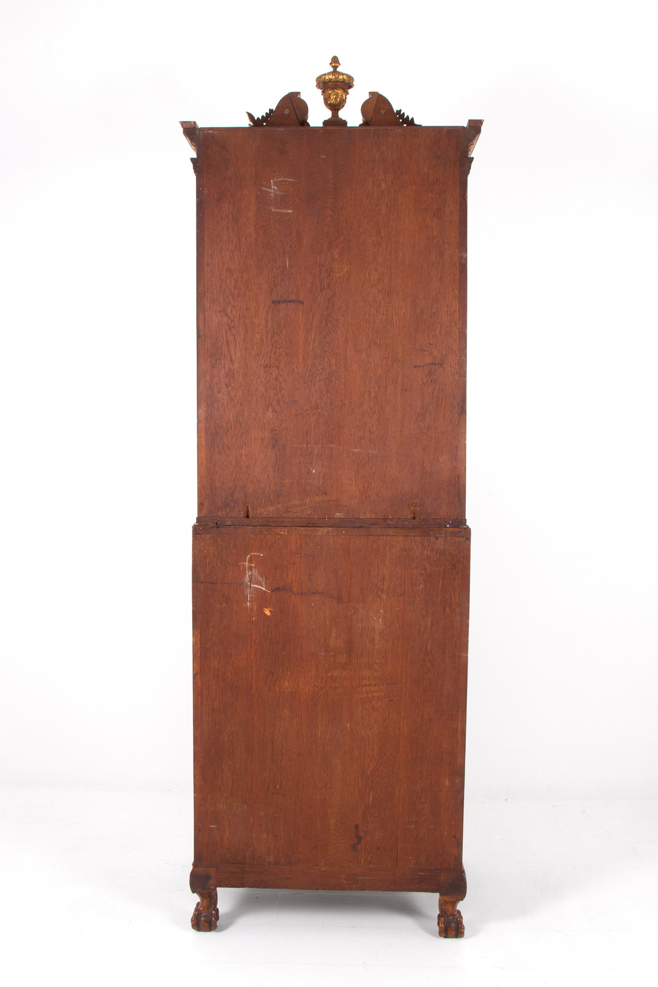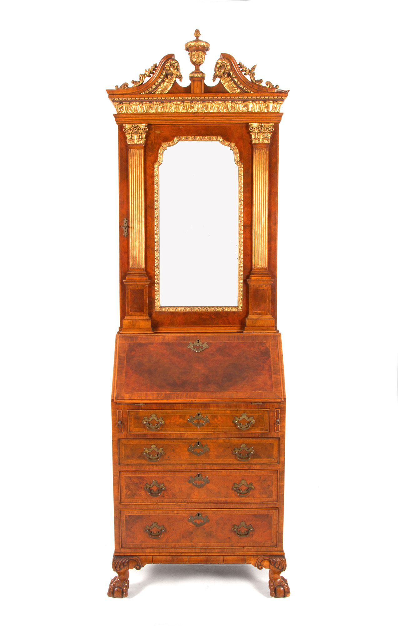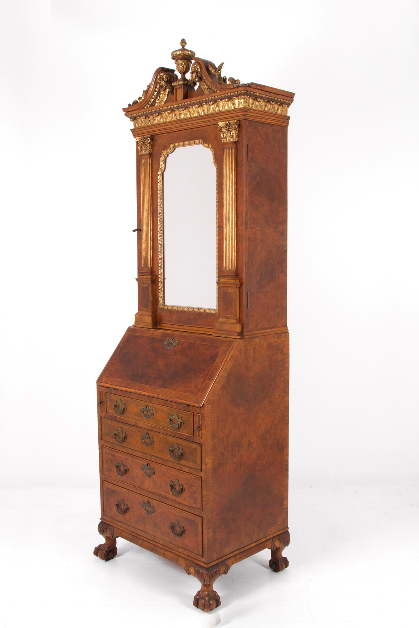Walnut and mahogany trumeau with carved and gilded wooden finials and columns. England. 20th century. 223x67x50cm approx. Trumeau in noce e mogano con cimase e colonne in legno intagliato e dorato. Inghilterra. XX secolo. 223x67x50 cm ca.