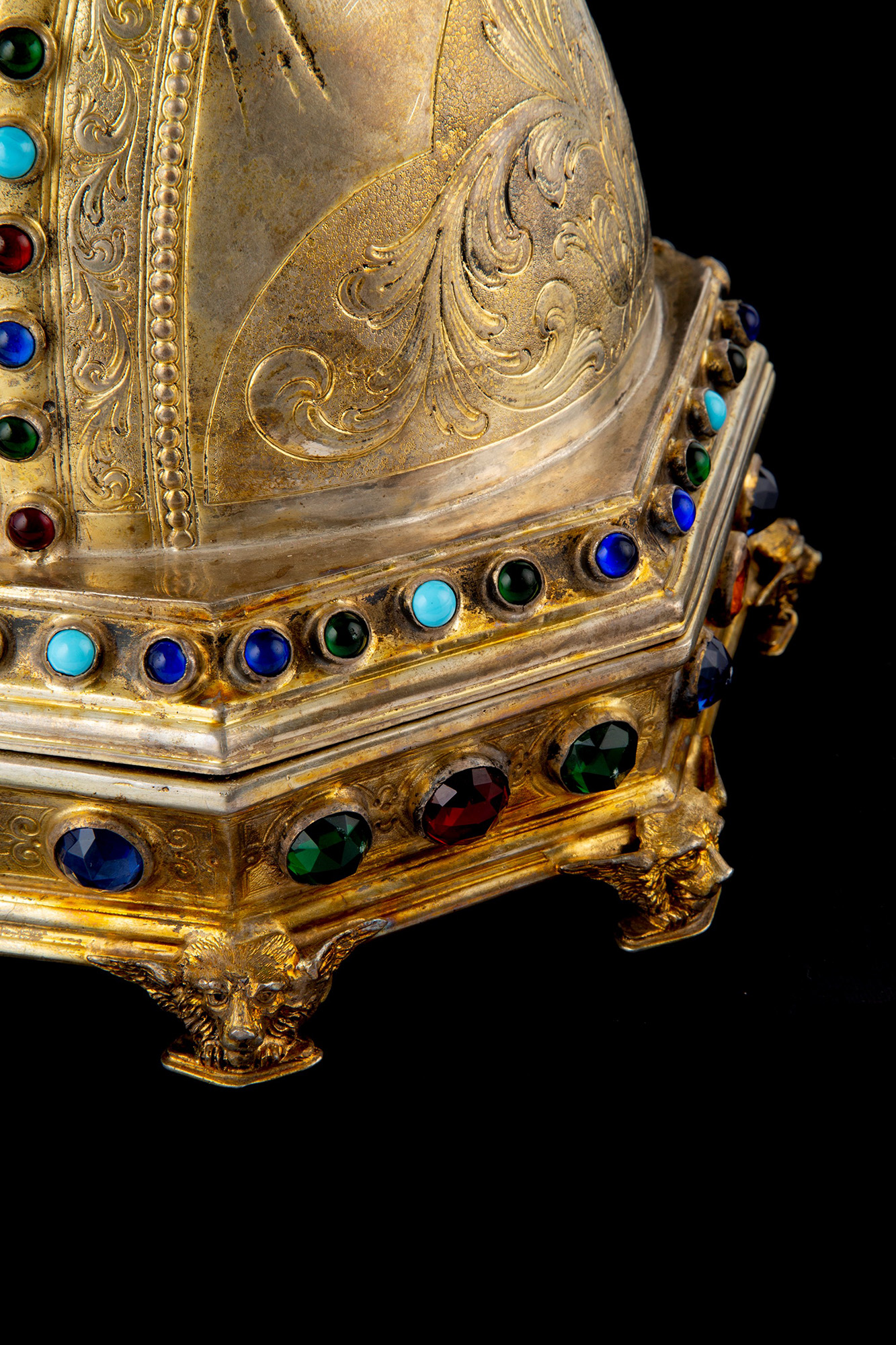 Reliquary sculpture in finely chiseled and gilded silver enriched with semi-precious stones depicting "GENTILDONNA". 19th century. 40x28x23cm approx. Scultura porta reliquie in argento finemente cesellato e dorato arricchito con pietre dure raffigurante "GENTILDONNA". XIX secolo. 40x28x23 cm ca.