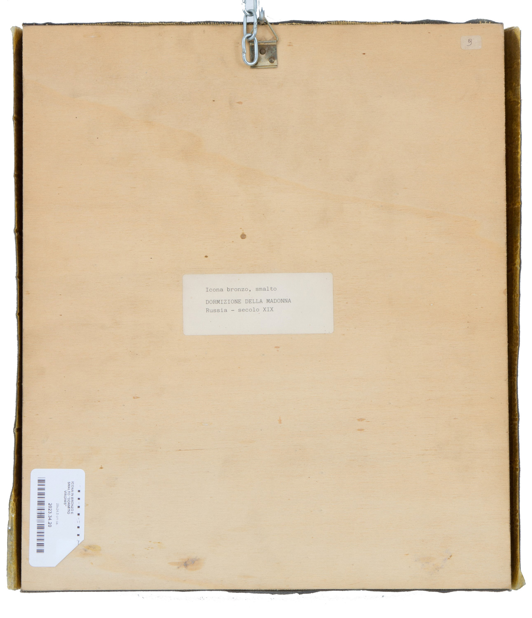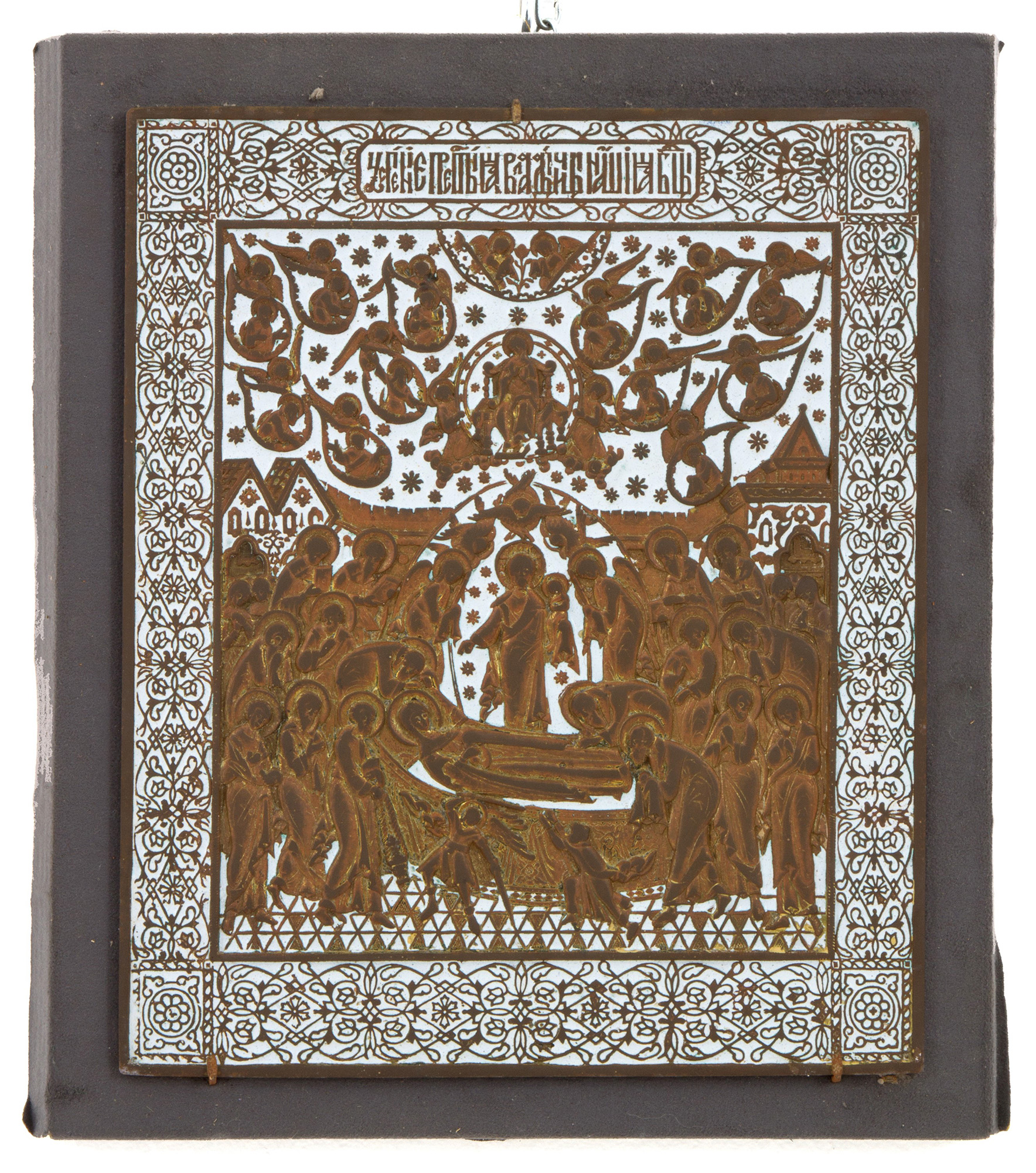 Icon in bronze and enamel depicting "DORMITIO VIRGINIS". 19th century. 29x24.5cm approx. Icona in bronzo e smalto raffigurante "DORMITIO VIRGINIS". XIX secolo. 29x24,5 cm ca.