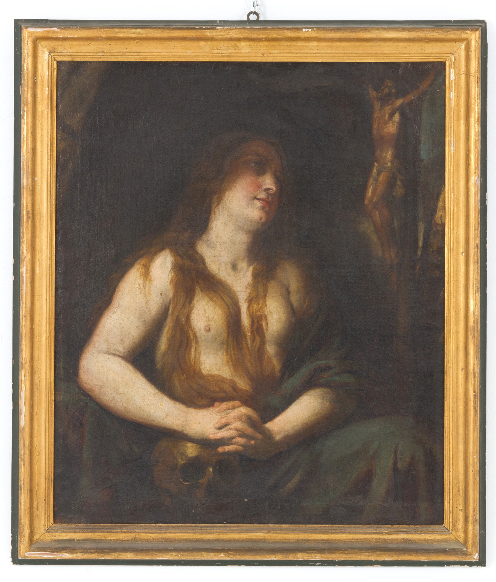 Oil painting on canvas depicting "PENITENT MAGDALENE". 17th century. In a gilt frame. Defects and restorations. 84.5x71cm approx. Dipinto olio su tela raffigurante "MADDALENA PENITENTE". XVII secolo. In cornice dorata. Difetti e restauri. 84,5x71 cm ca.