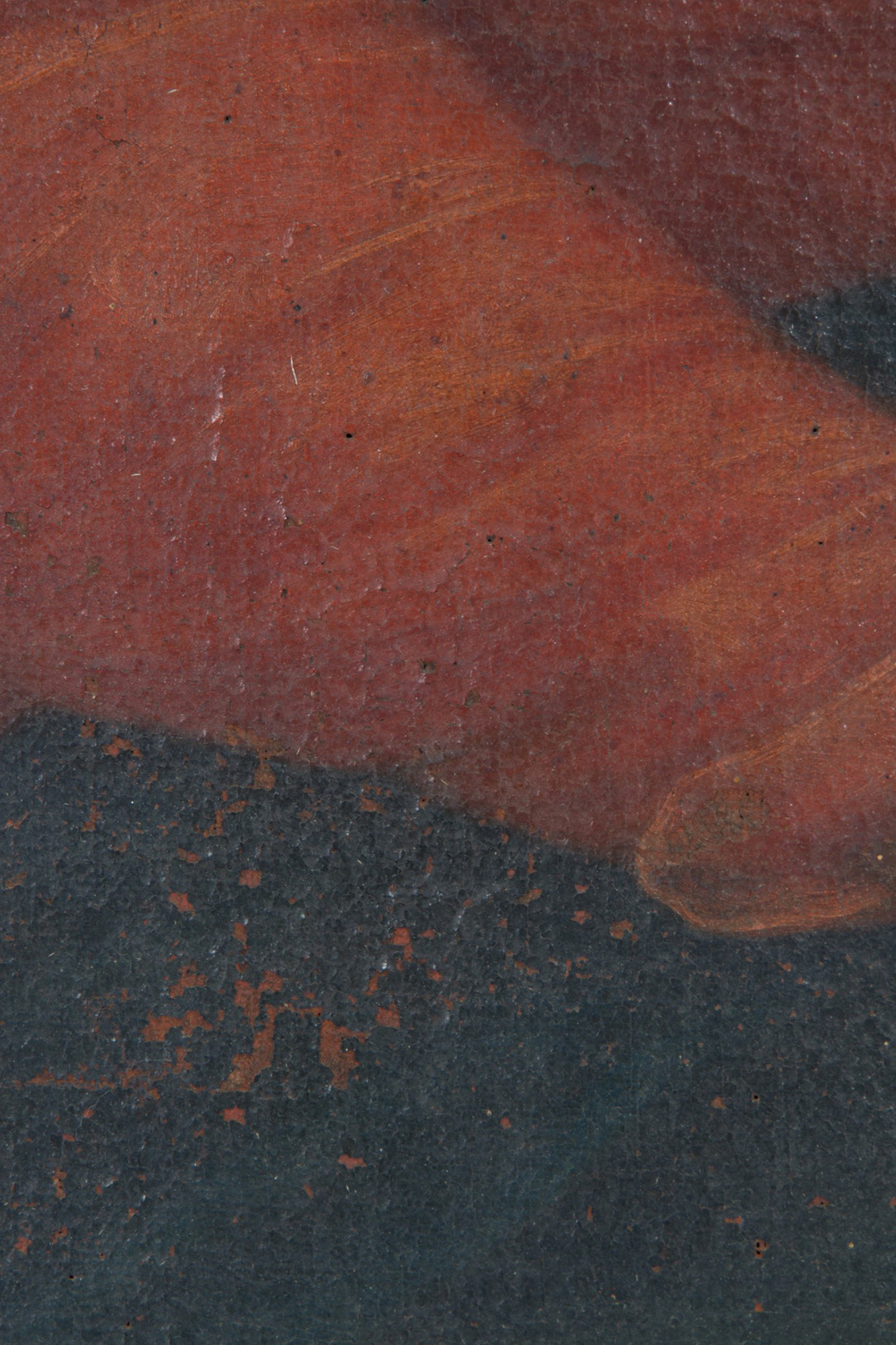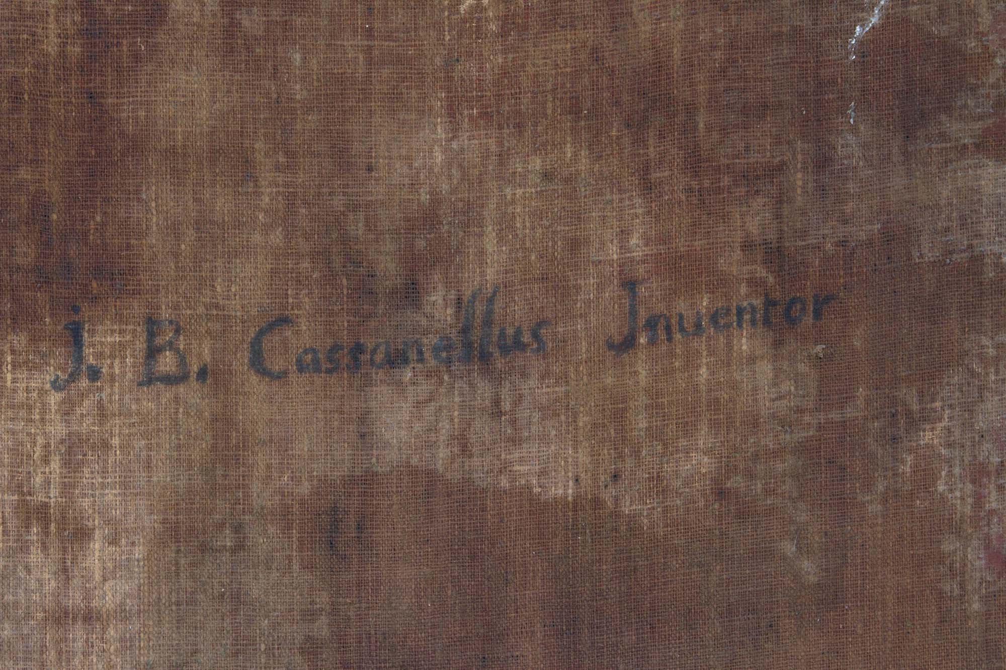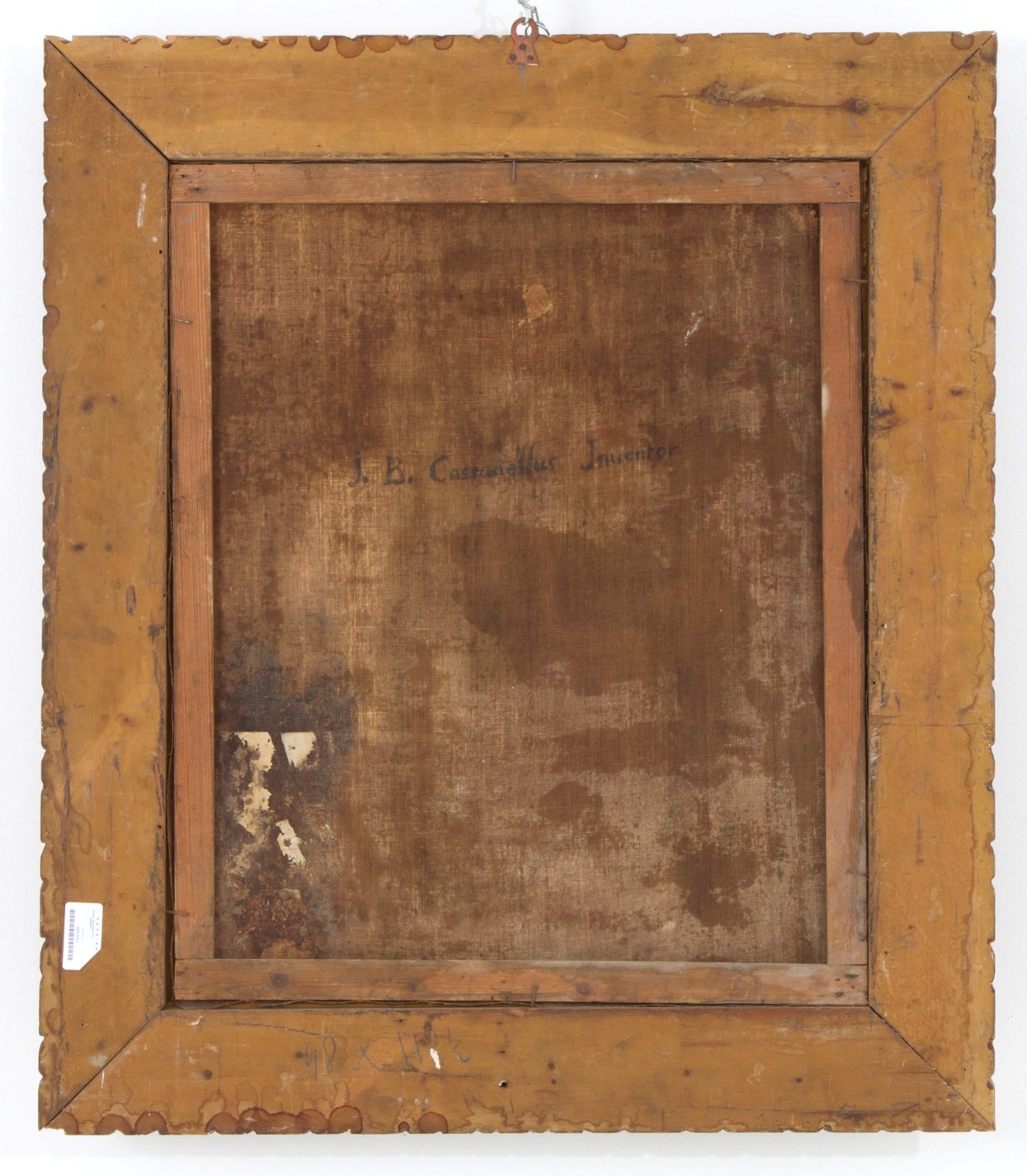 Oil painting on canvas depicting "MADONNA WITH CHILD". Inscribed 'J.b. Cassanellus Inventor' on the reverse. 17th century. In carved and gilded frame. Already reframed. Defects. 72x69cm approx. Dipinto olio su tela raffigurante "MADONNA CON BAMBINO". Con scritta 'J.b. Cassanellus Inventor' sul retro. XVII secolo. In cornice intagliata e dorata. Già rintelaiato. Difetti. 72x69 cm ca.