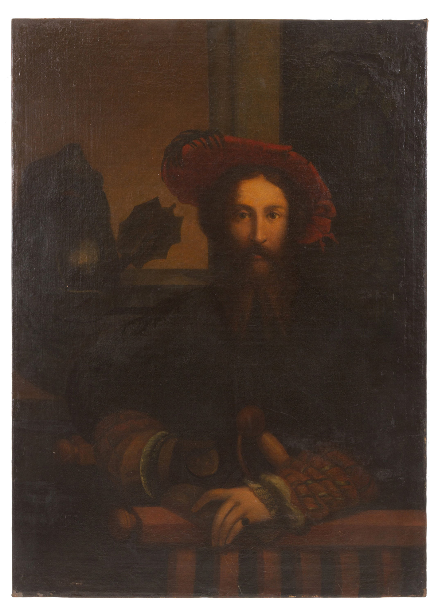 Oil painting on canvas depicting "PORTRAIT OF GALEAZZO SANVITALE". From Girolamo Francesco Maria Mazzola called Parmigianino. Late 17th-early 18th century. Already relined and relined. Small restorations. 108x77.5cm approx. Dipinto olio su tela raffigurante "RITRATTO DI GALEAZZO SANVITALE". Da Girolamo Francesco Maria Mazzola detto il Parmigianino. Fine XVII-inizi XVIII secolo. Già rintelato e rintelaiato. Piccoli restauri. 108x77,5 cm ca.