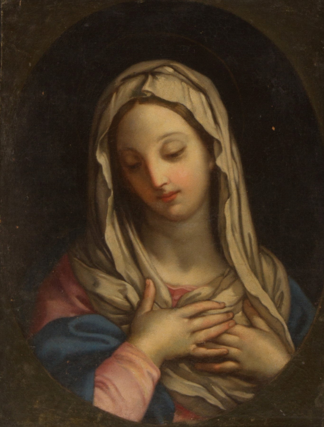 Oil painting on canvas depicting "MADONNA". 18th century. In carved and lacquered frame. 48x36cm approx. Dipinto olio su tela raffigurante "MADONNA". XVIII secolo. In cornice intagliata e laccata. 48x36 cm ca.