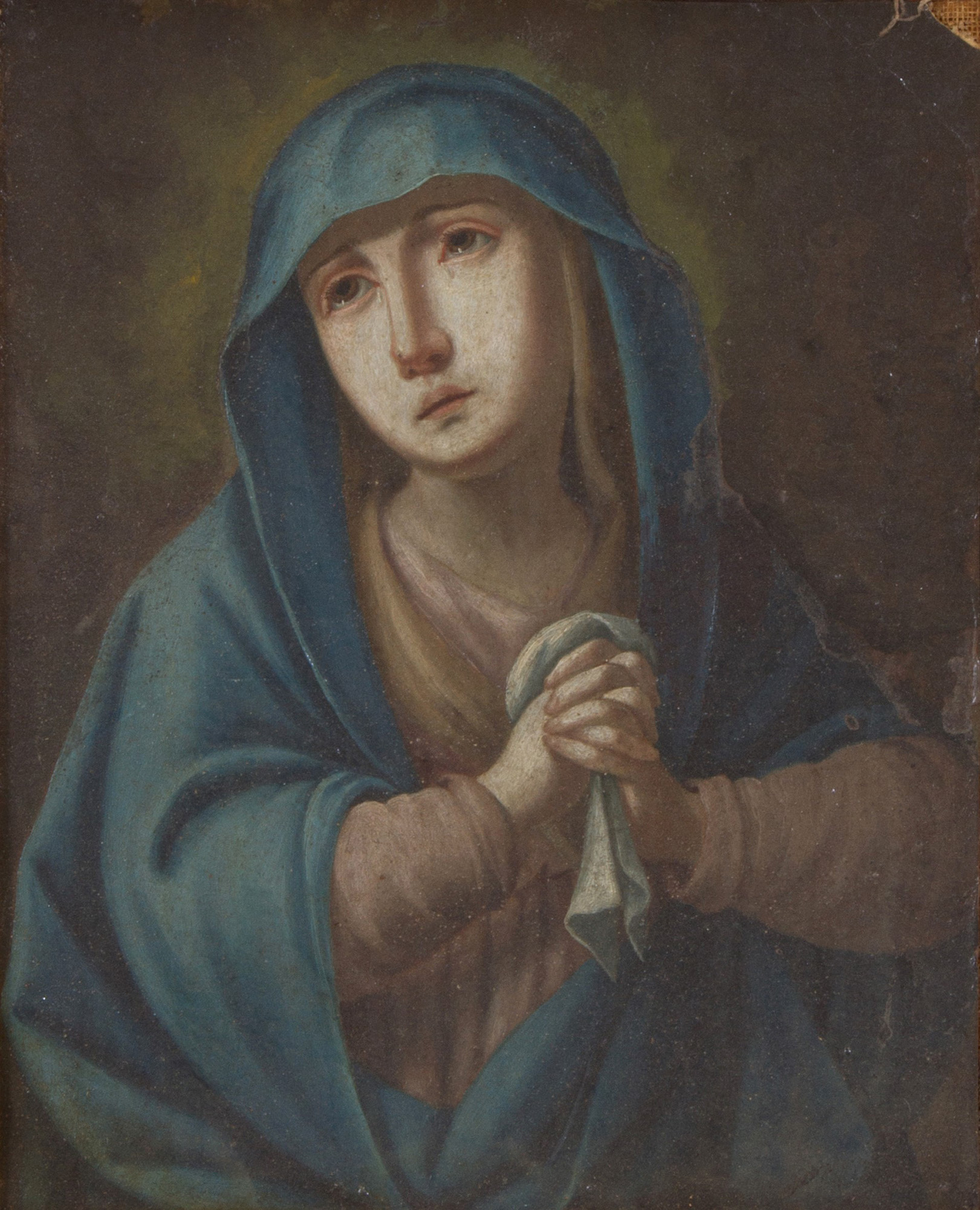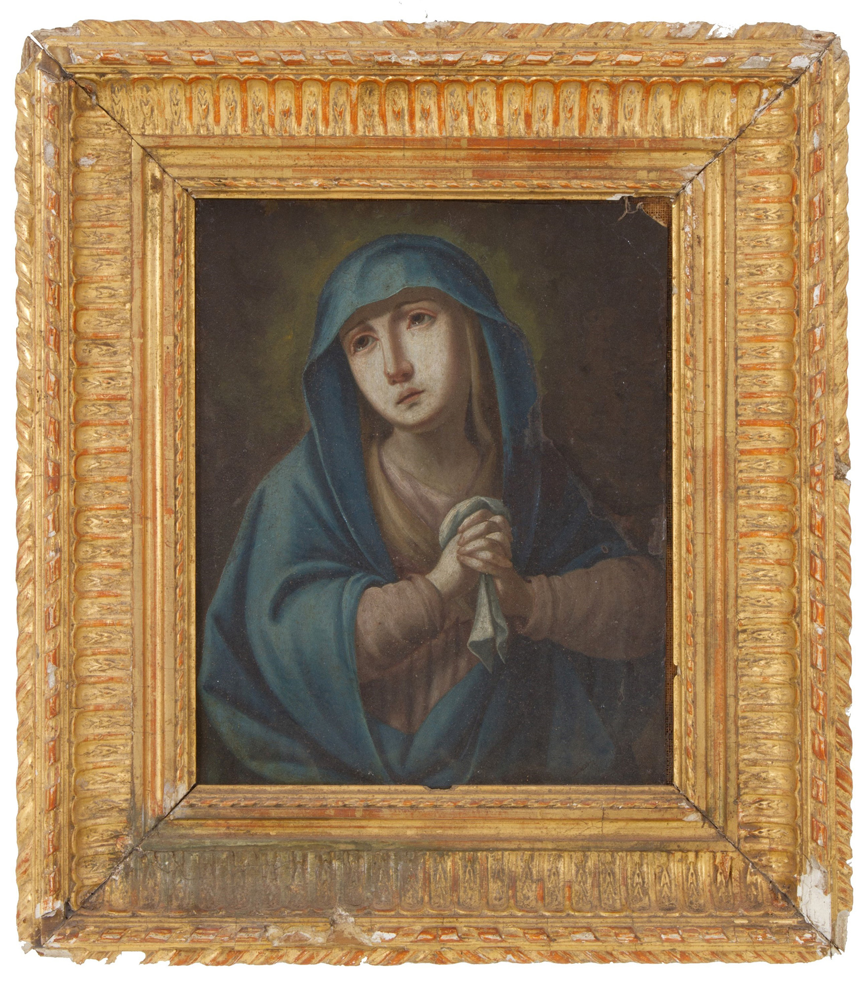 Oil painting on paper applied on canvas depicting "PRAYING VIRGIN MARY". 18th century. In carved and gilded frame. Already relined and reframed. Defects and shortcomings. 29.5x23.5cm approx. Dipinto olio su carta applicata su tela raffigurante "MADONNA ORANTE". XVIII secolo. In cornice intagliata e dorata. Già rintelato e rintelaiato. Difetti e mancanze. 29,5x23,5 cm ca.