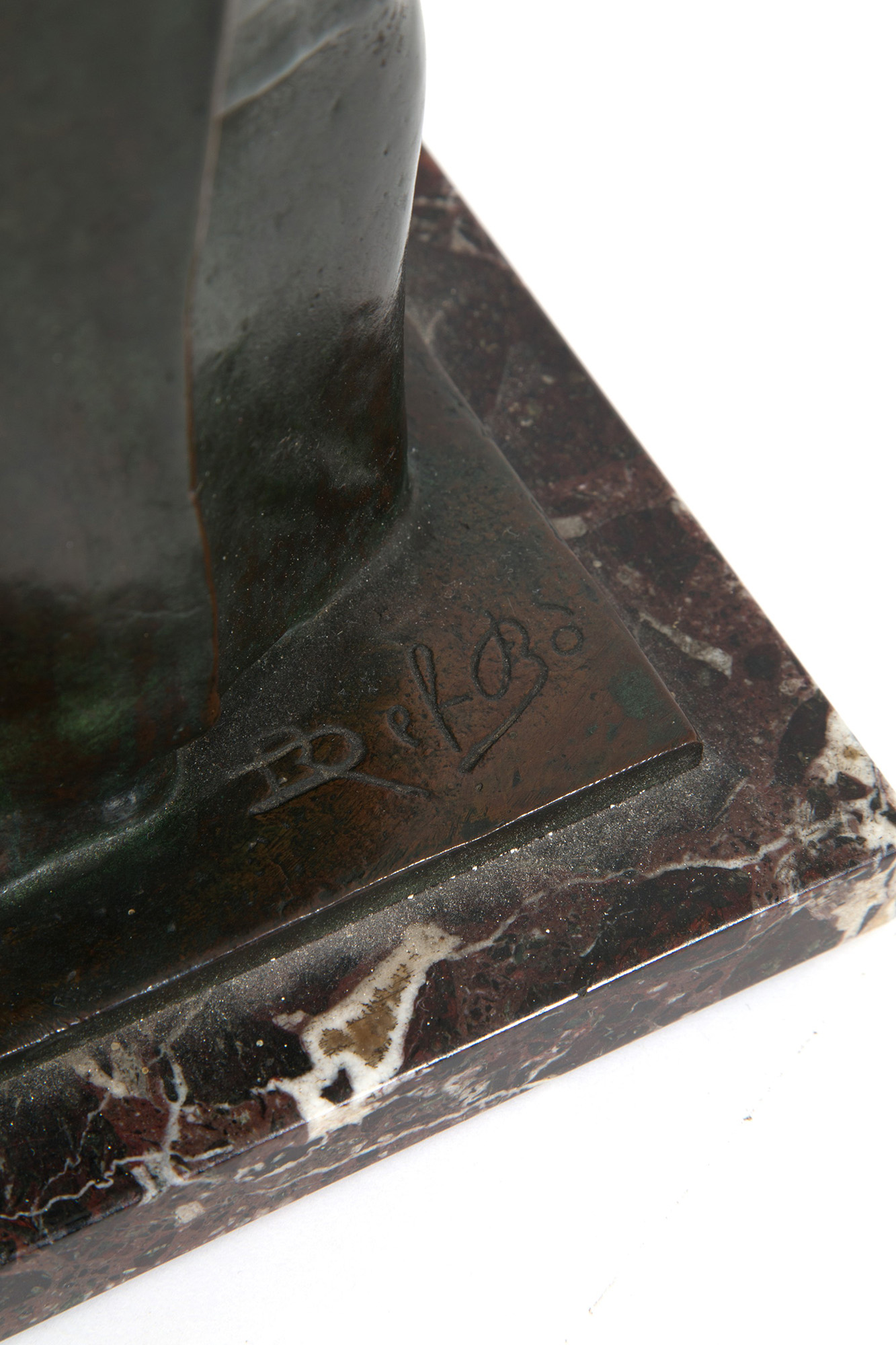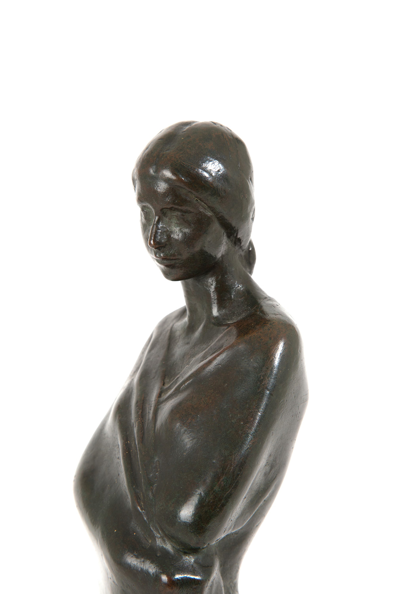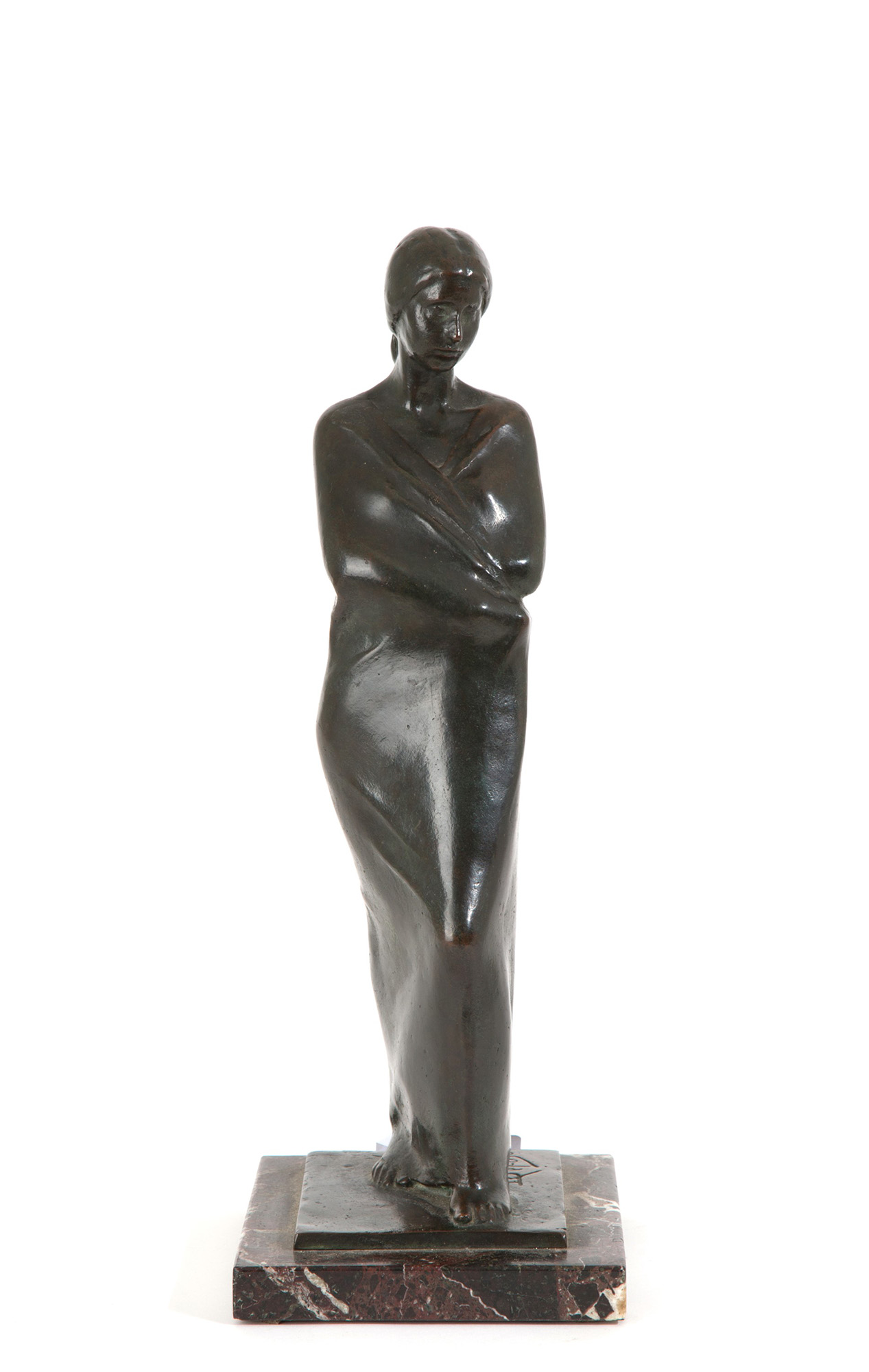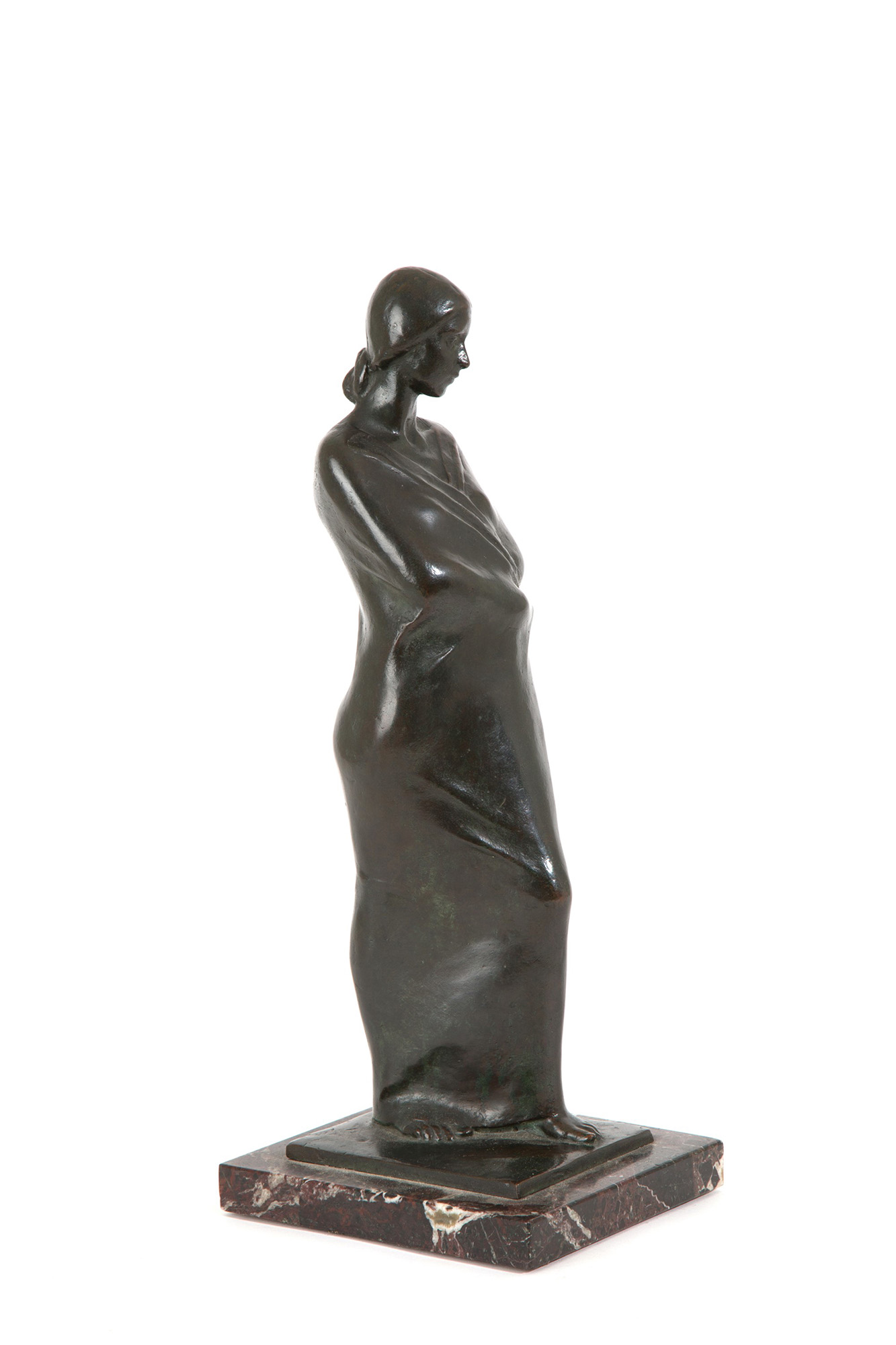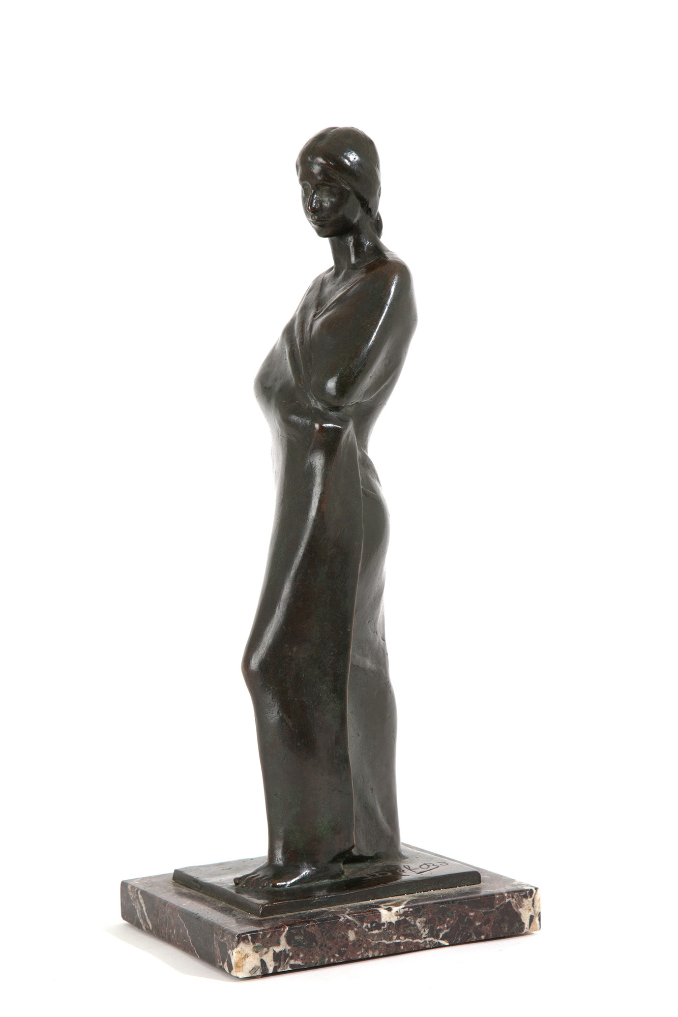 Bronze sculpture depicting a "FEMALE FIGURE". Signed at the base. On Macchiavecchia marble base. 40x16x14cm approx. Scultura in bronzo raffigurante "FIGURA FEMMINILE". Firmata alla base. Su supporto in marmo Macchiavecchia. 40x16x14 cm ca.